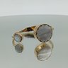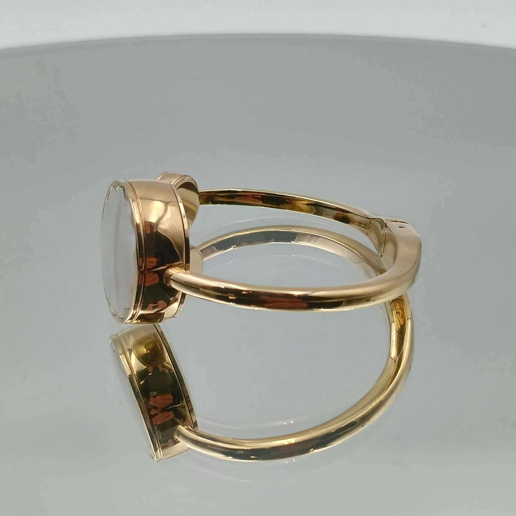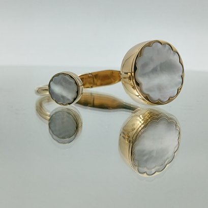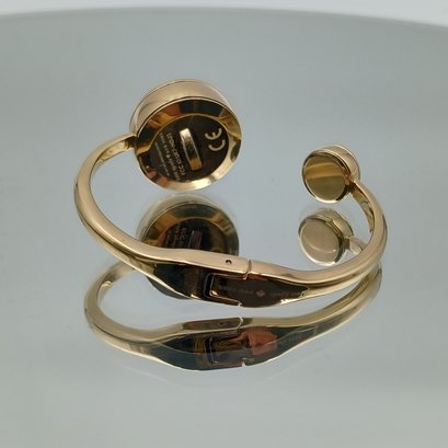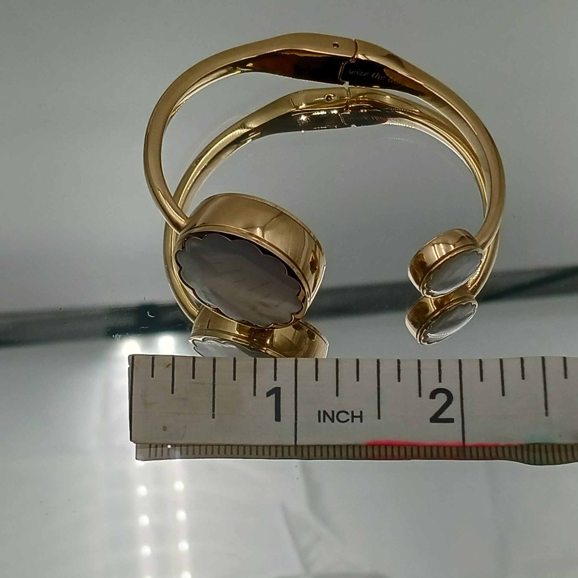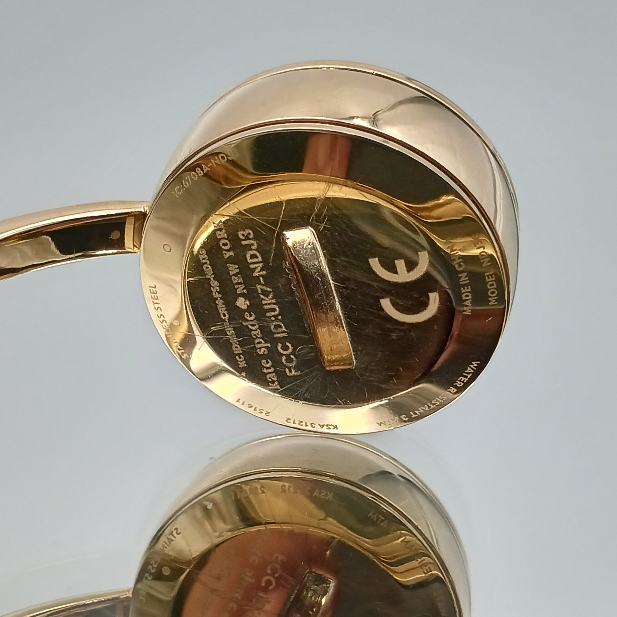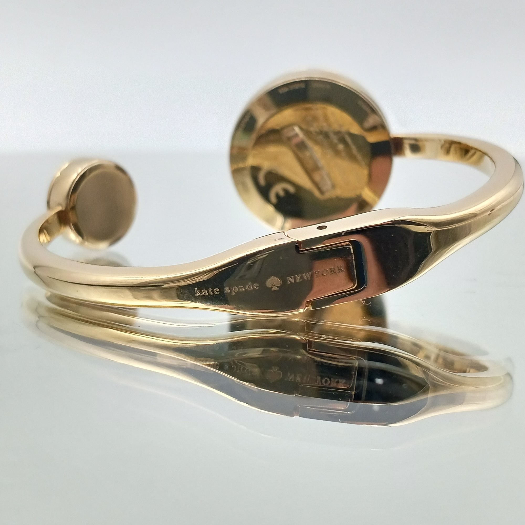 This gold-tone stainless steel bangle from Kate Spade New York features two scalloped mother-of-pearl discs and an integrated activity tracker hidden behind the larger disc.