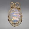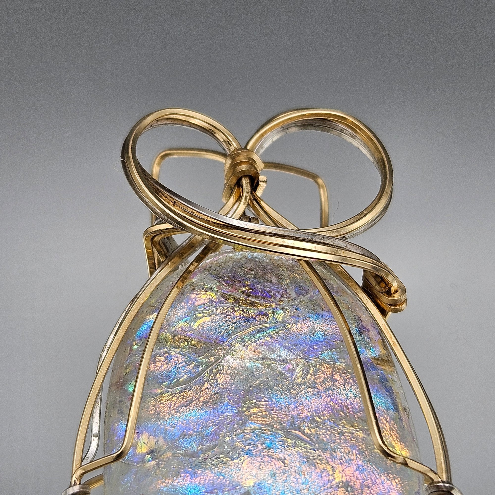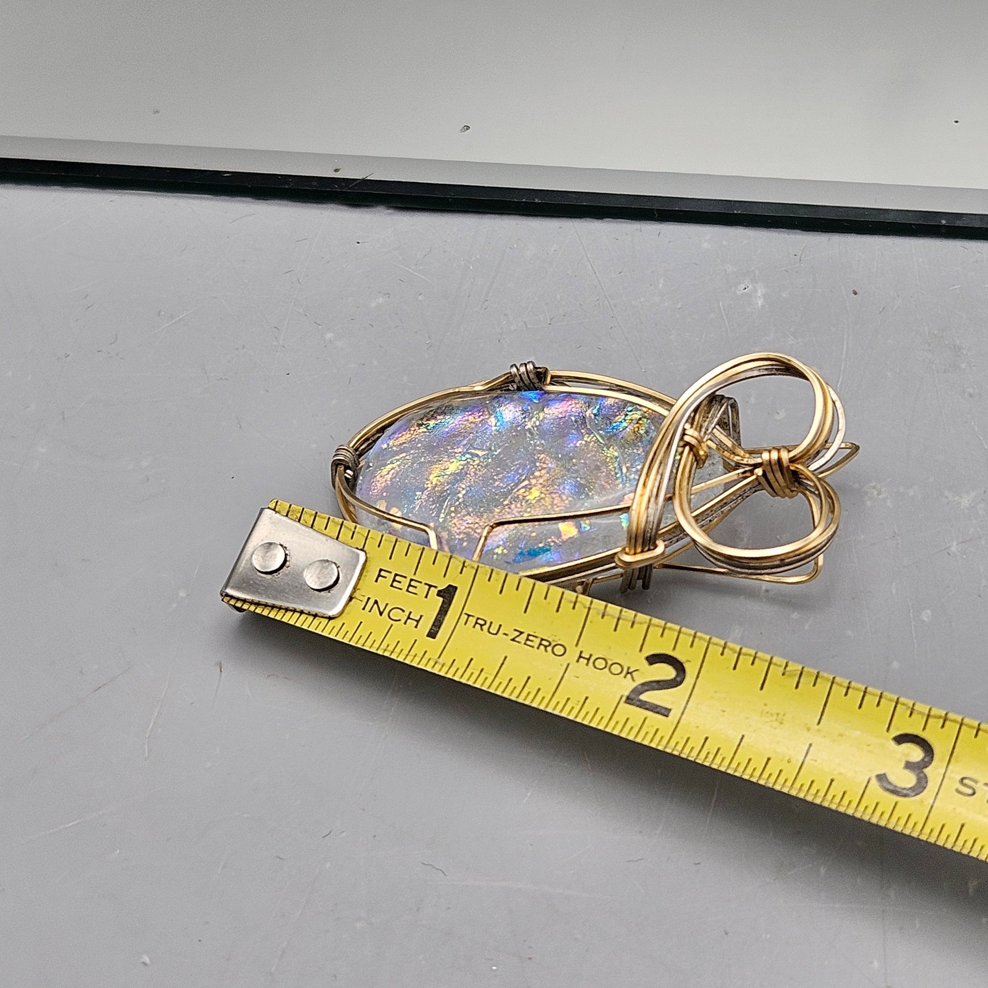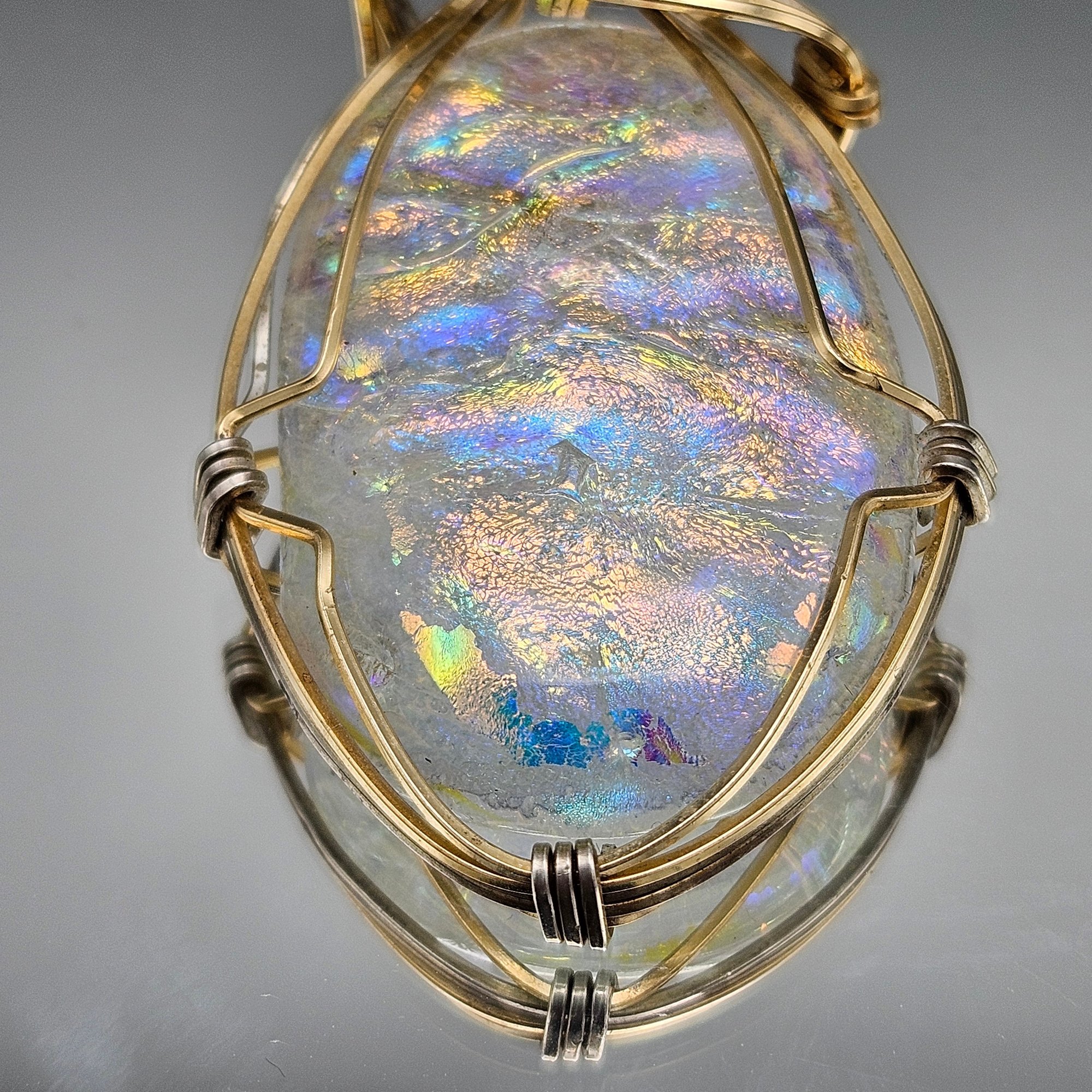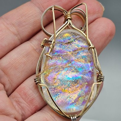 Large Wire-Wrapped Dichroic Glass Oval Pendant - Iridescent Rainbow