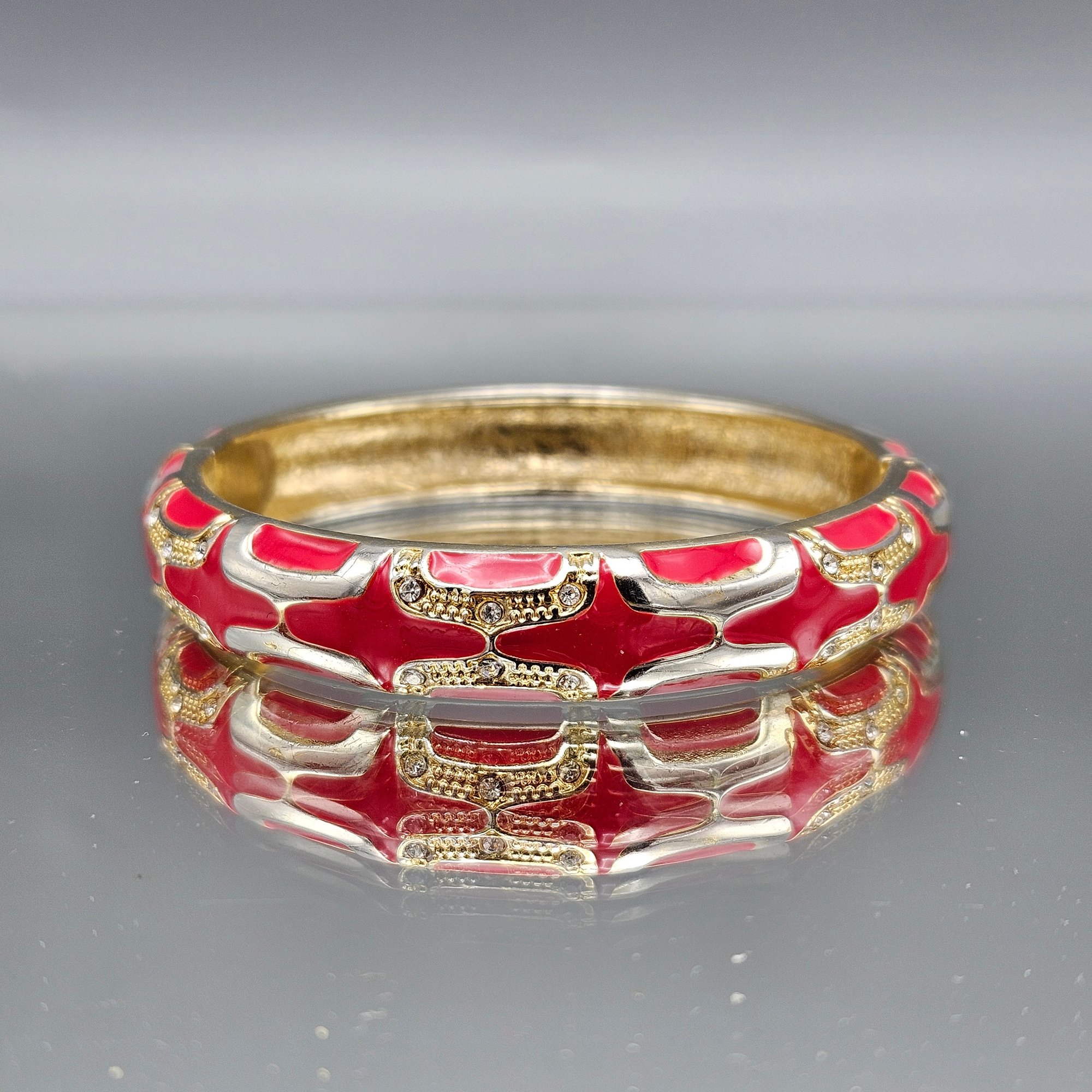 Gold and Red Enamel Clamper Bracelet Gold Tone Rhinestones