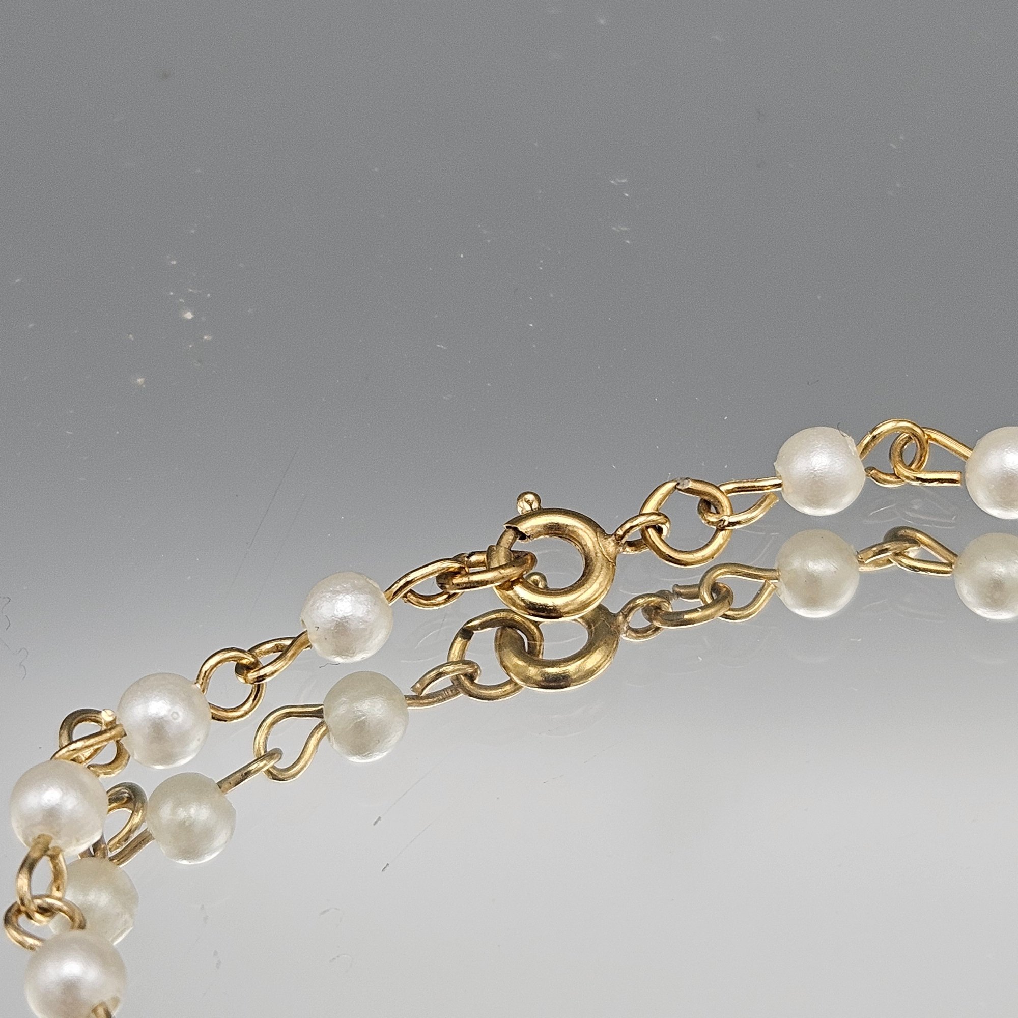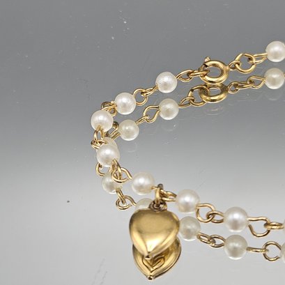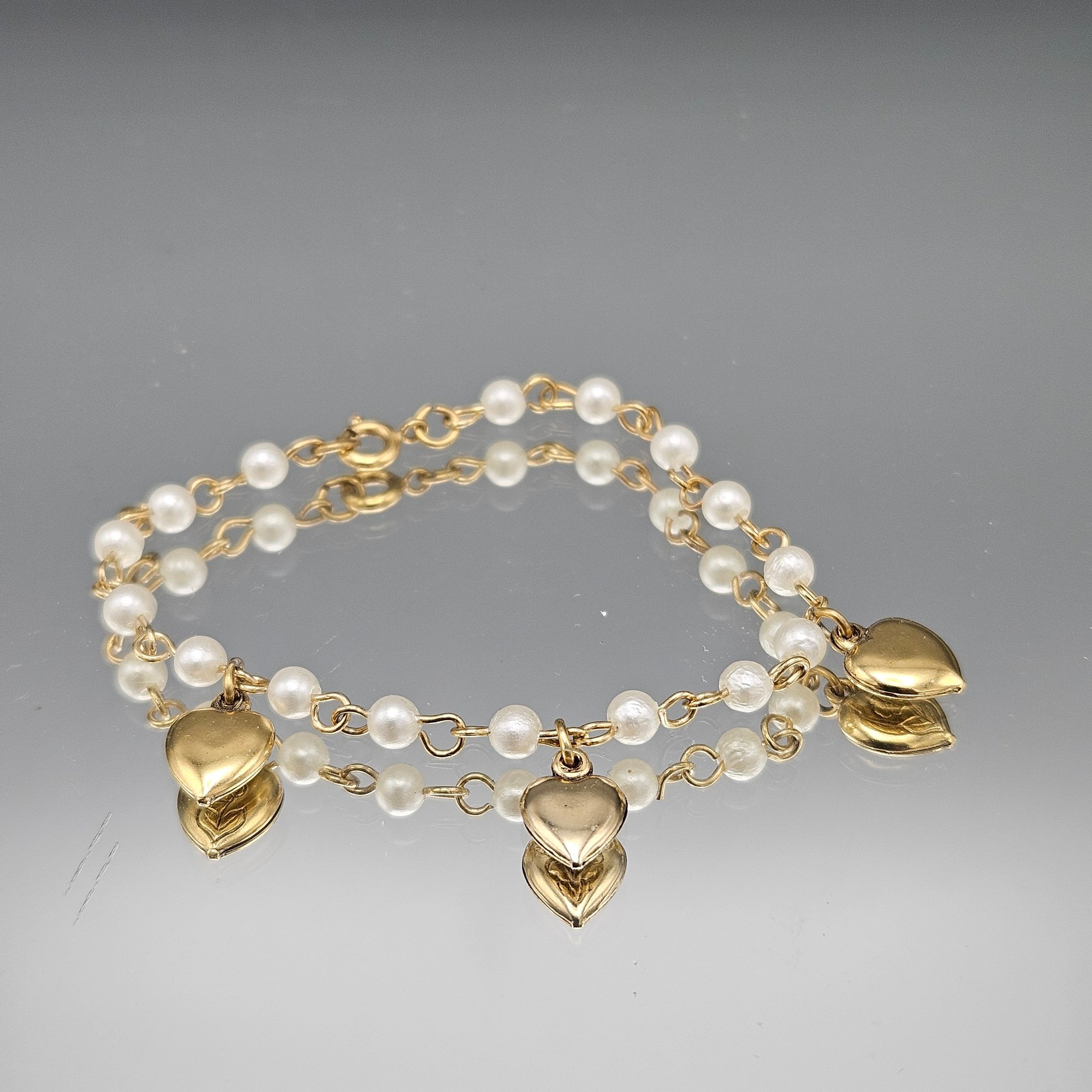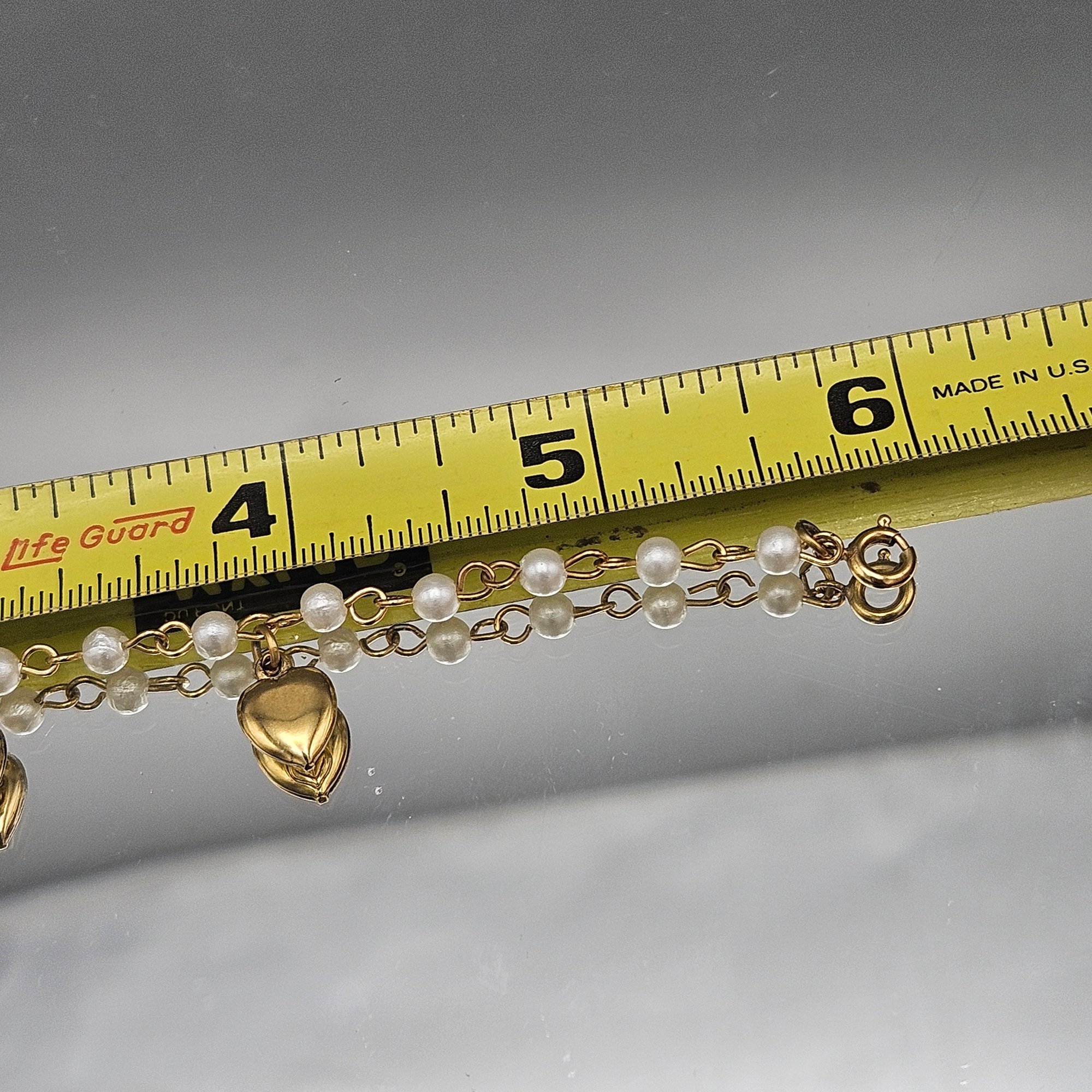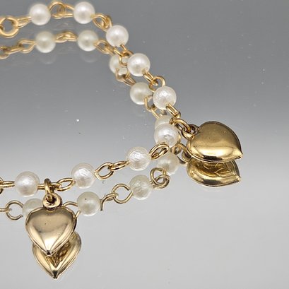 Gold Tone & Pearl Charm Bracelet With Puffy Heart Dangles 6"
