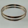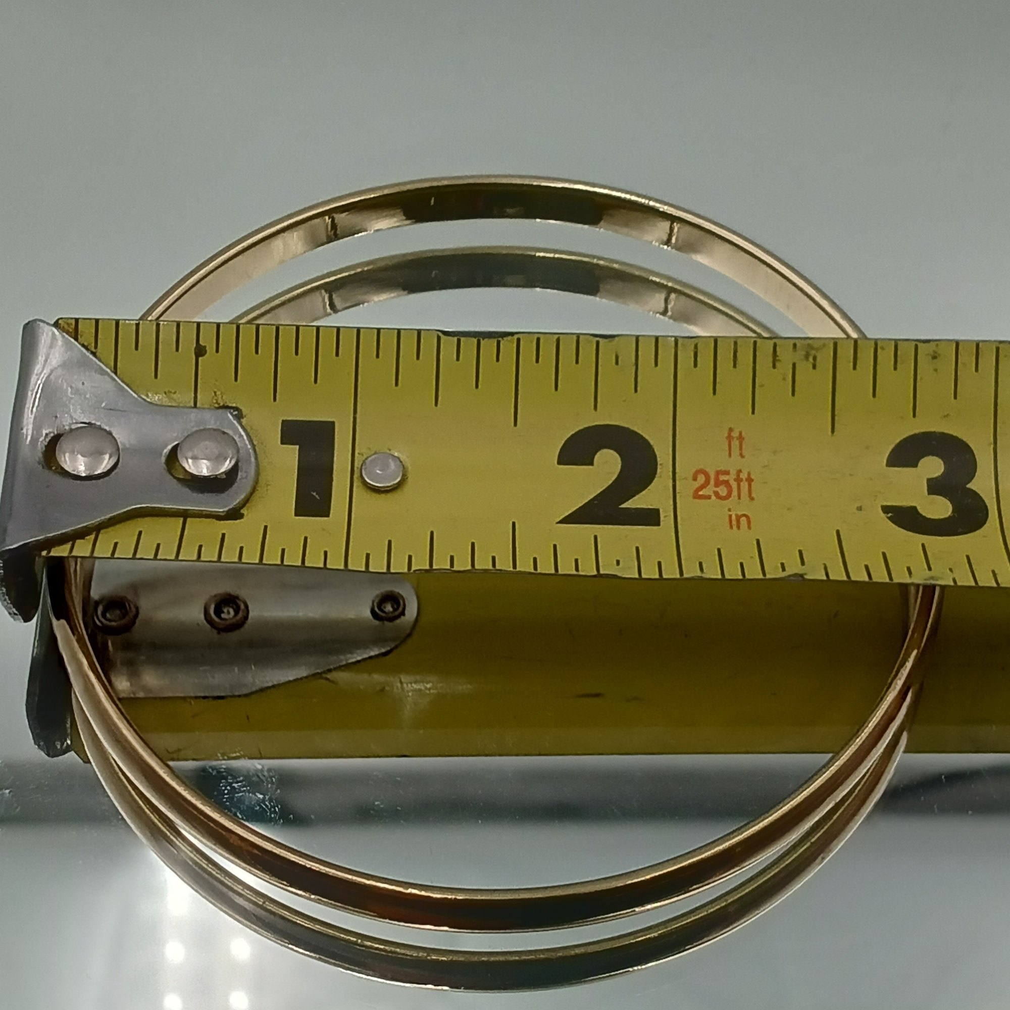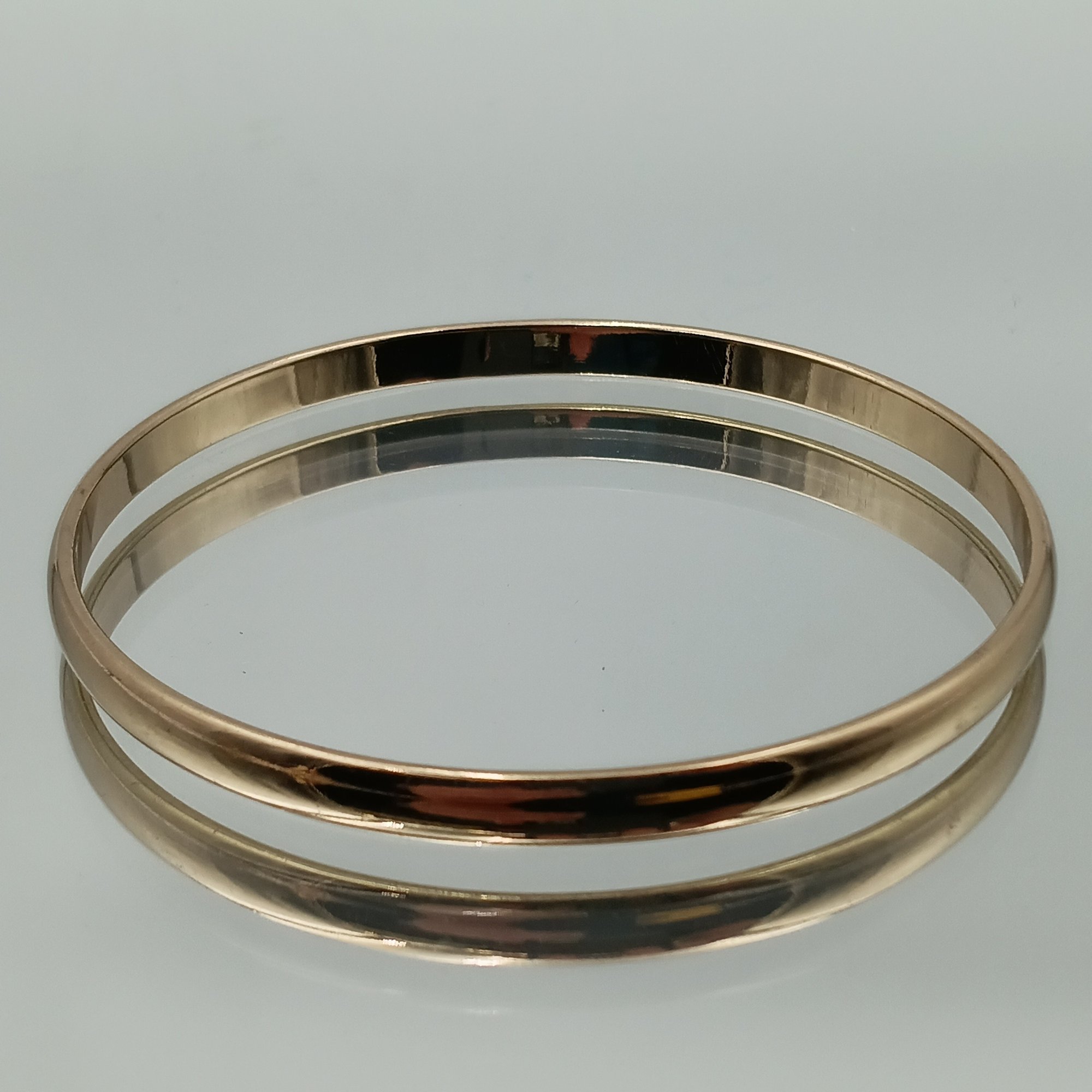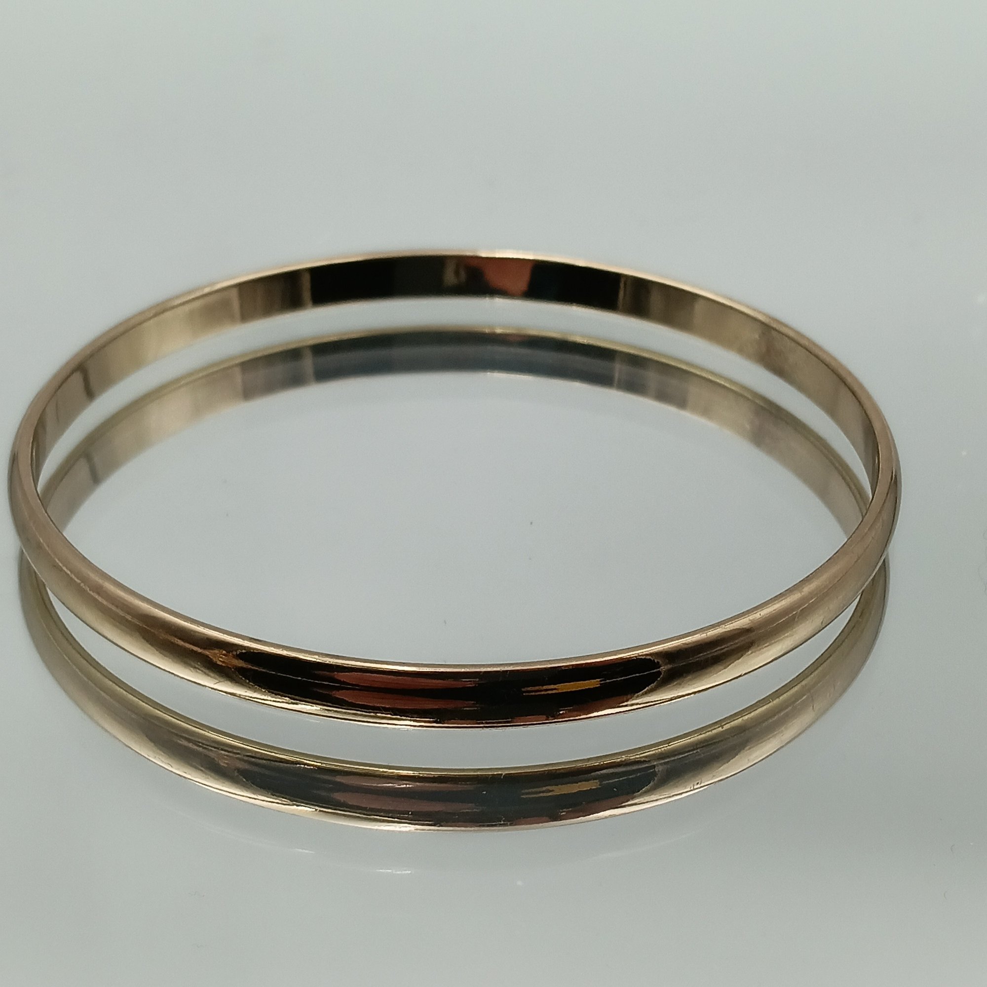 This elegant gold-tone bangle features a classic rounded profile and a high-polish finish, measuring approximately 2.5 inches in diameter.