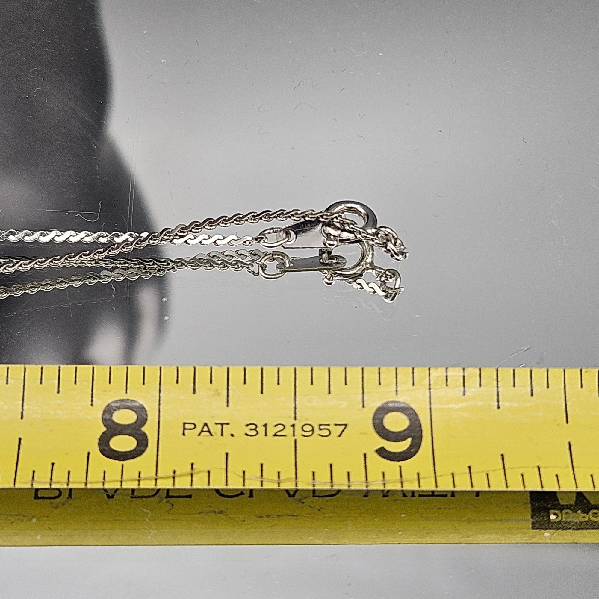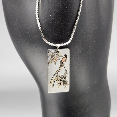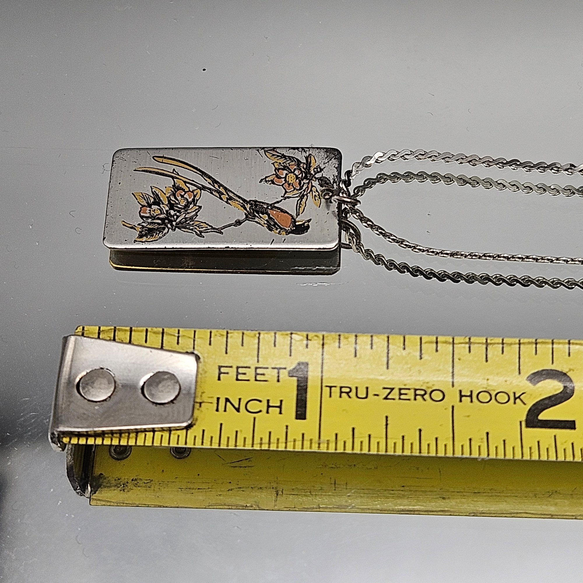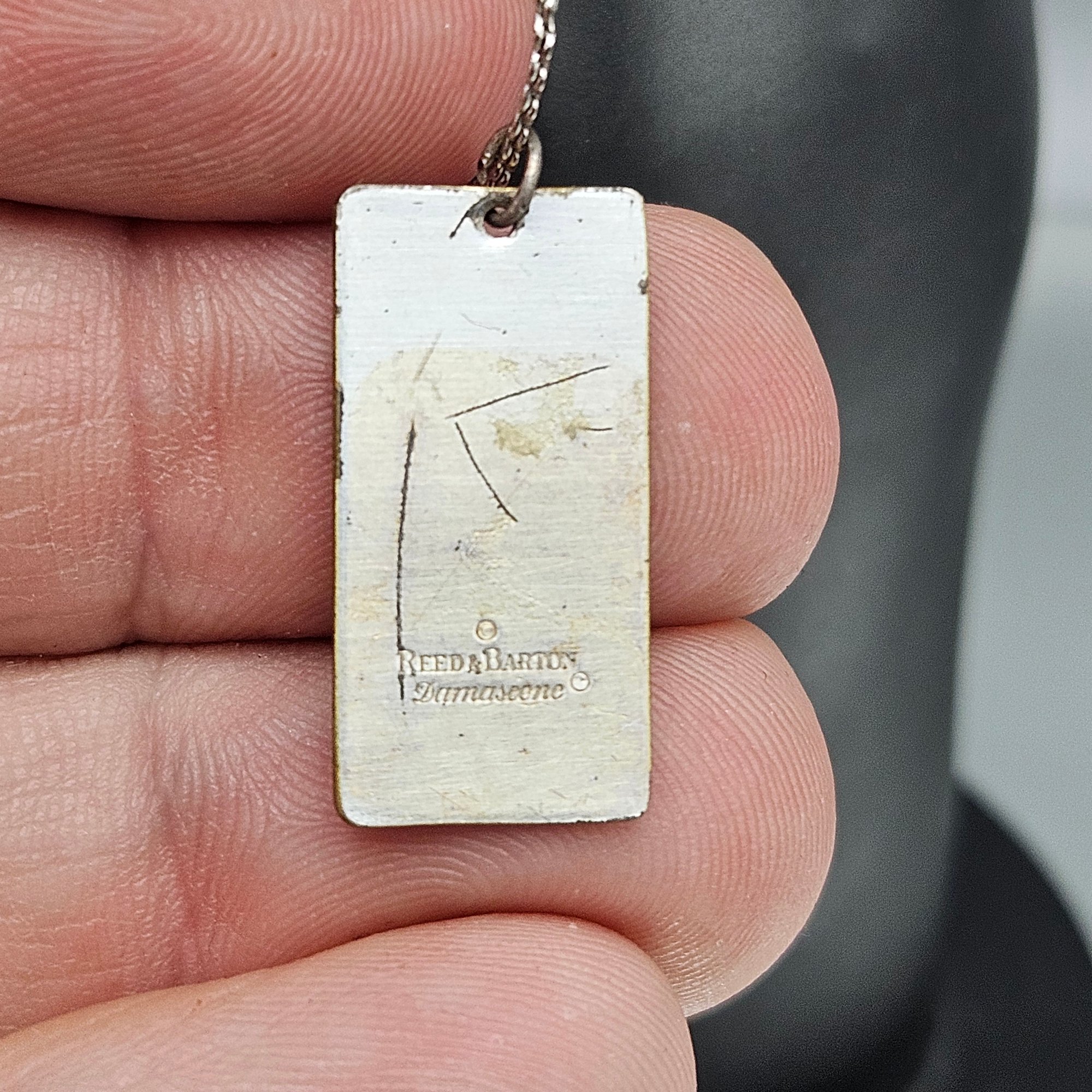 This elegant vintage necklace features a rectangular pendant crafted by Reed & Barton using their signature Damascene technique.he pendant measures approximately 1 inch in length and hangs from a delicate, shimmering rope chain with a secure spring ring clasp.