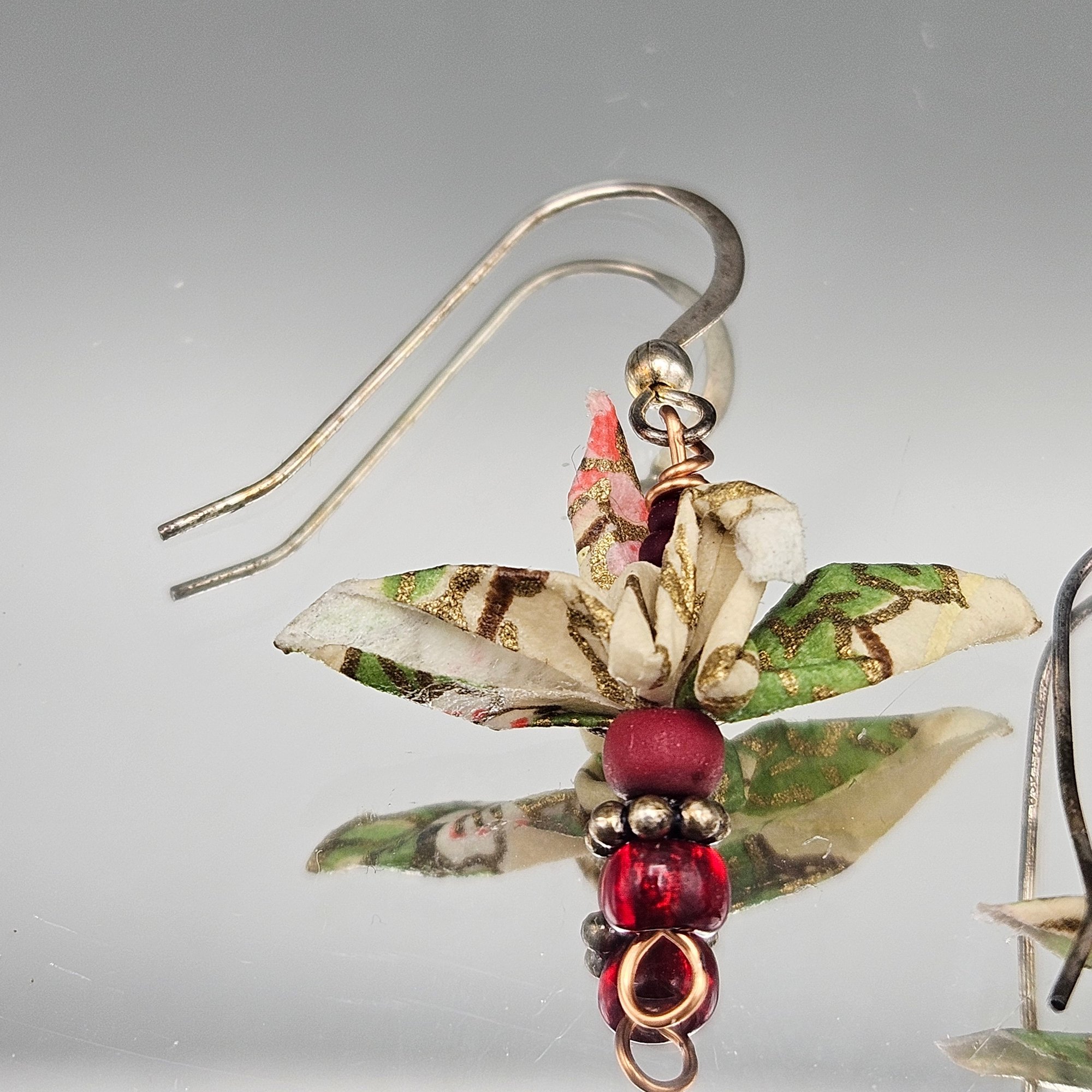 Green and Gold Floral Origami Bird Dangle Earrings