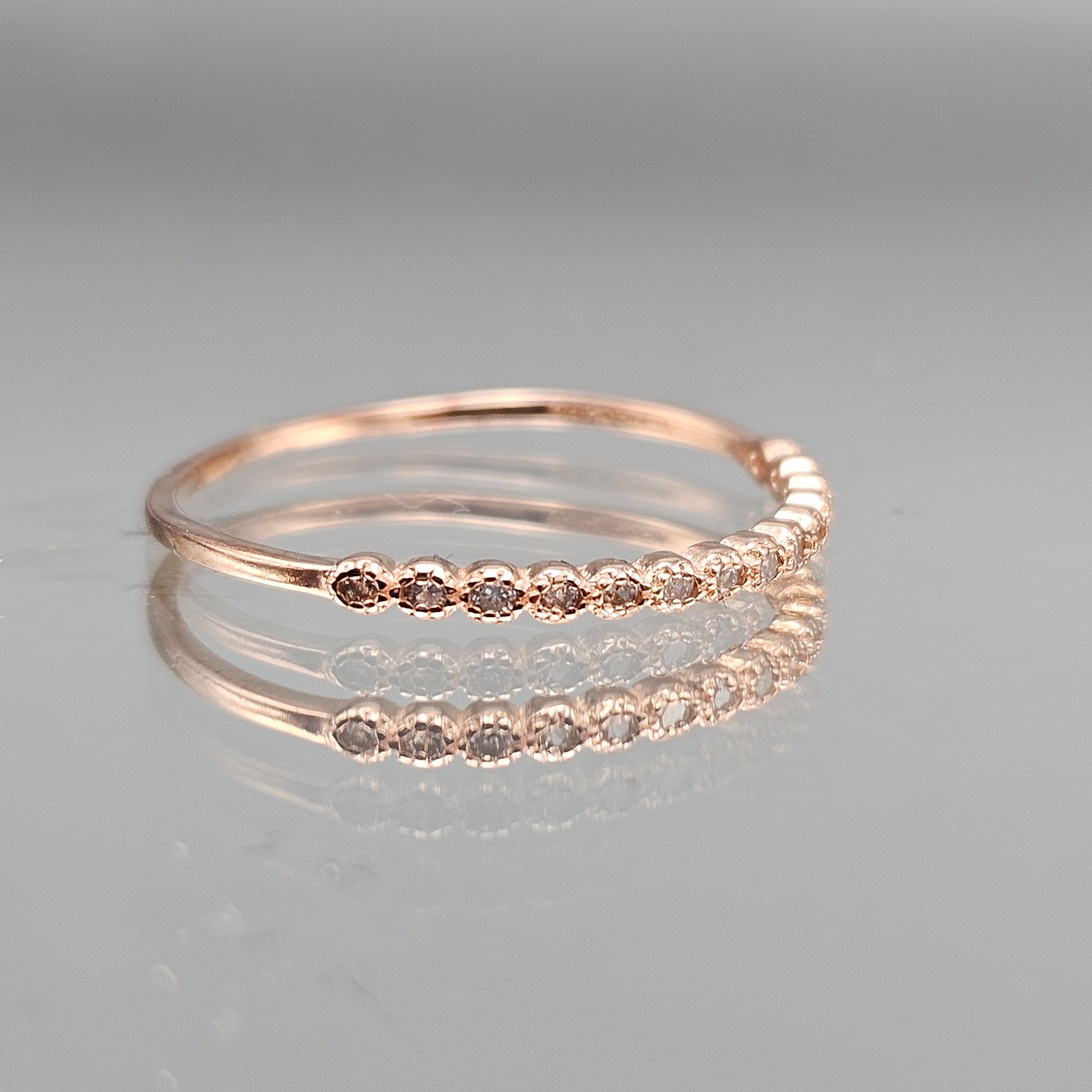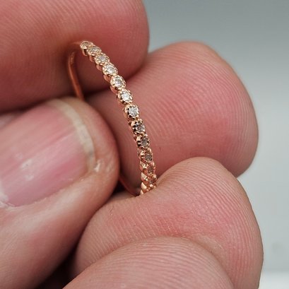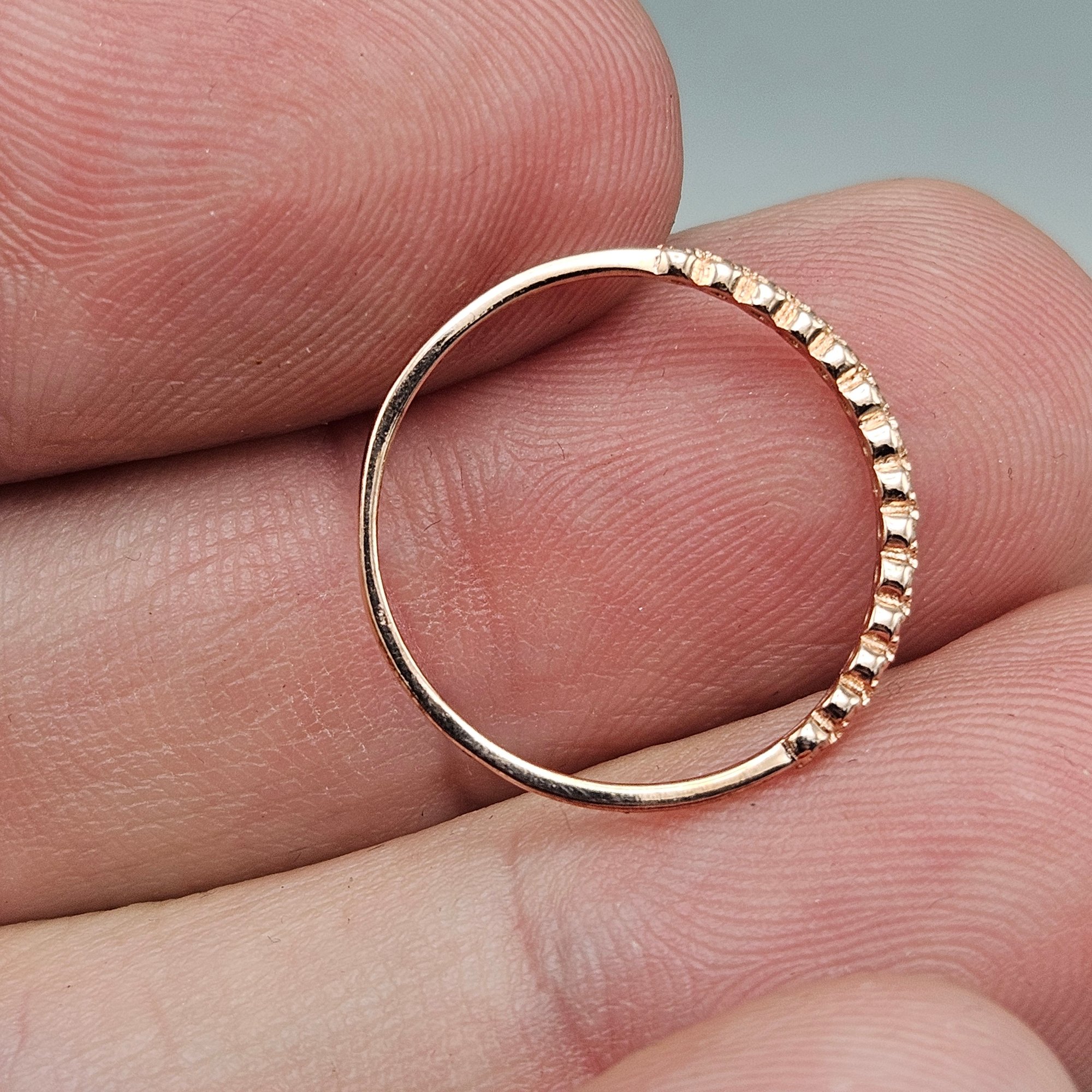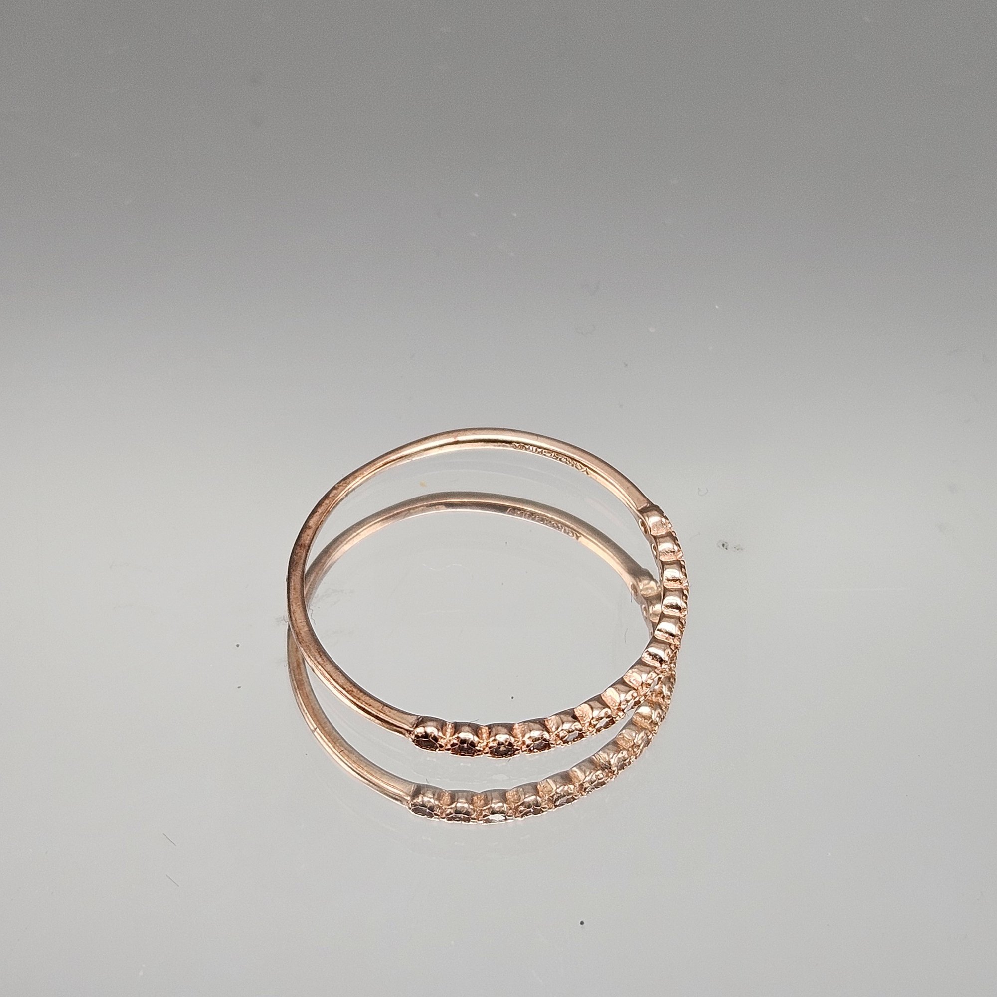 This delicate stacking ring is crafted from 925 sterling silver with a rose gold finish and features a half-band of shimmering pavé-set accents. It is a size 7.75 and is hallmarked YGI 925 CHINA.