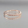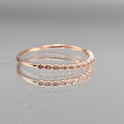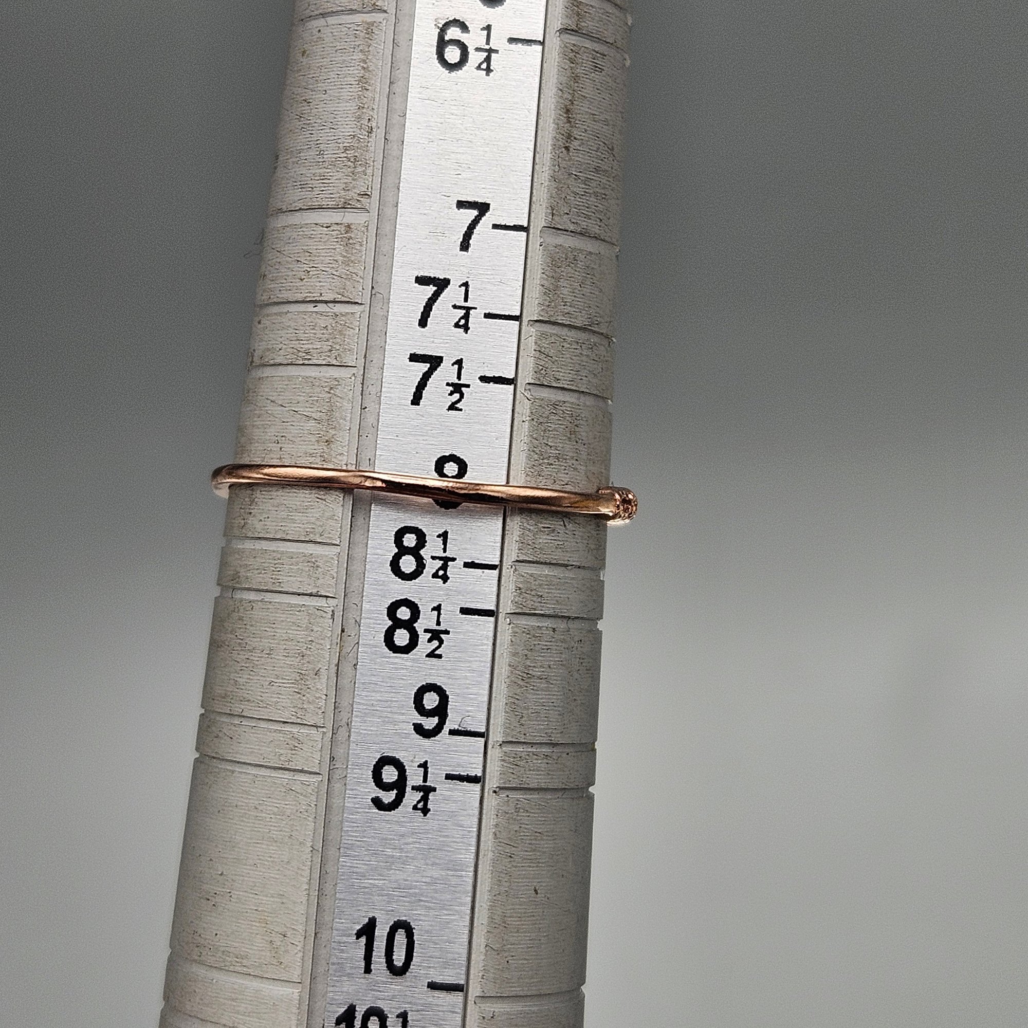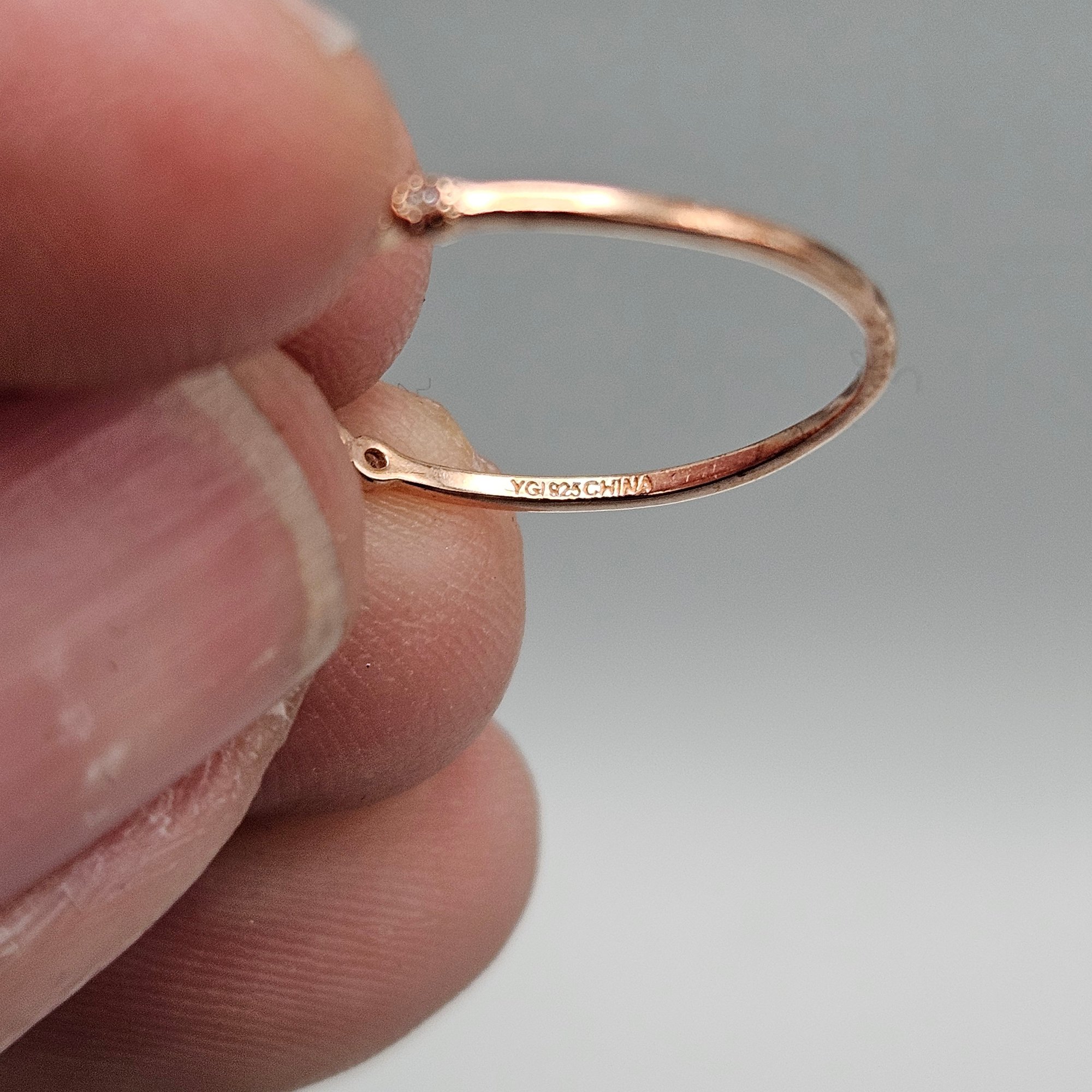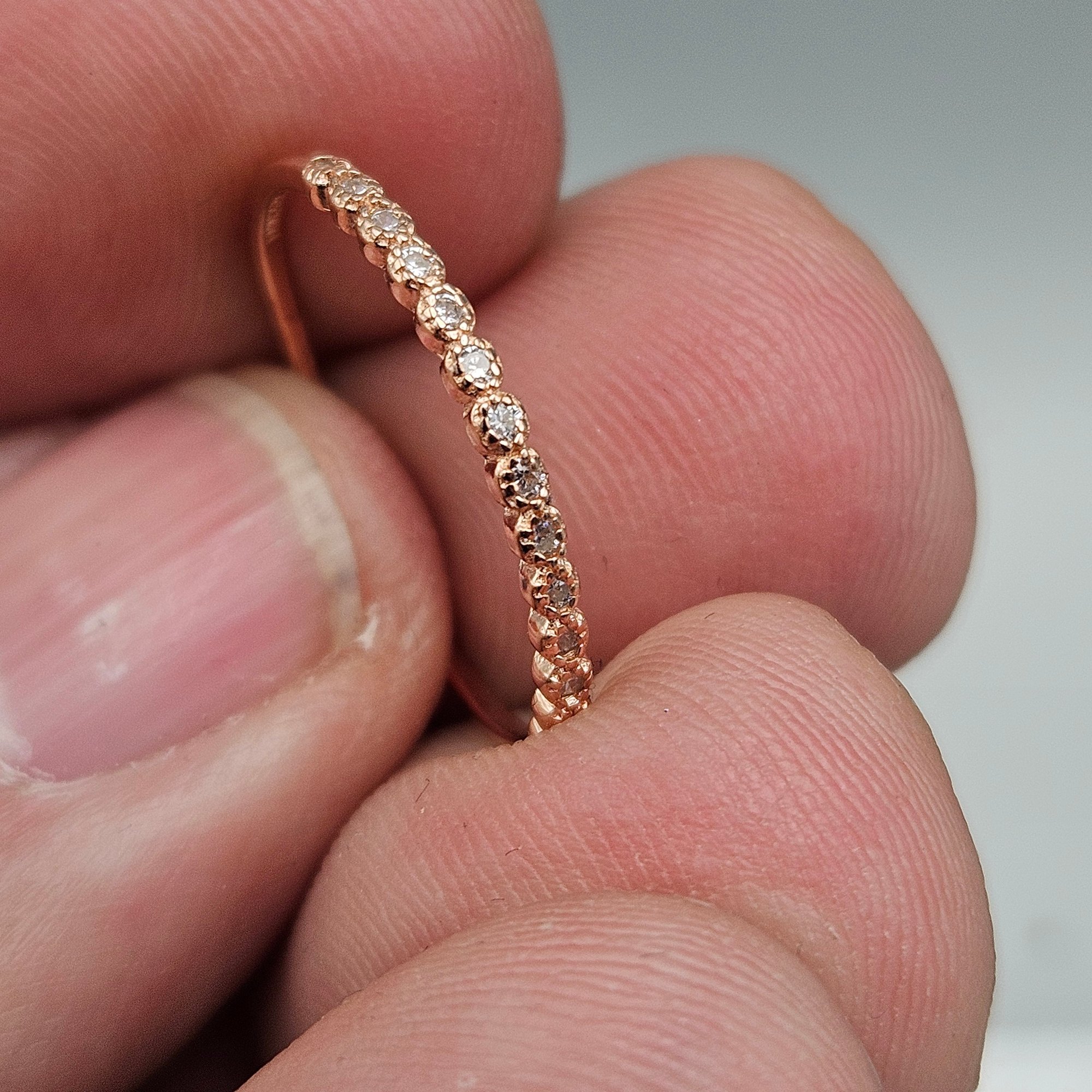 This delicate stacking ring is crafted from 925 sterling silver with a rose gold finish and features a half-band of shimmering pavé-set accents. It is a size 7.75 and is hallmarked YGI 925 CHINA.