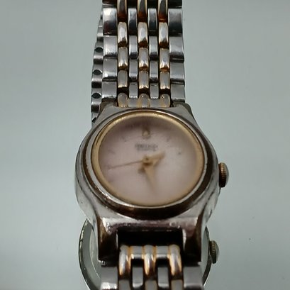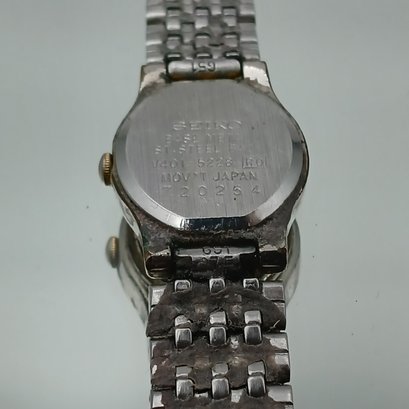 vintage-inspired accessory, this elegant watch showcases an oval white dial with gold-tone stick indexes, a matching two-tone stainless steel bracelet, and a high-quality Seiko quartz movement.