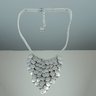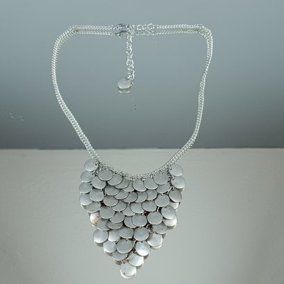 silver-tone bib necklace with a coin-shaped dangling design