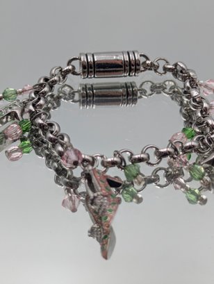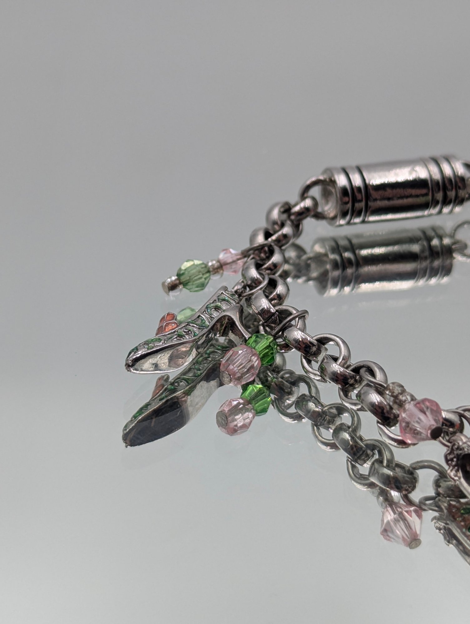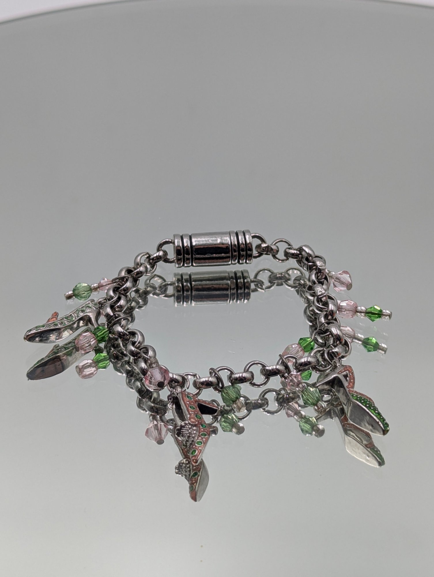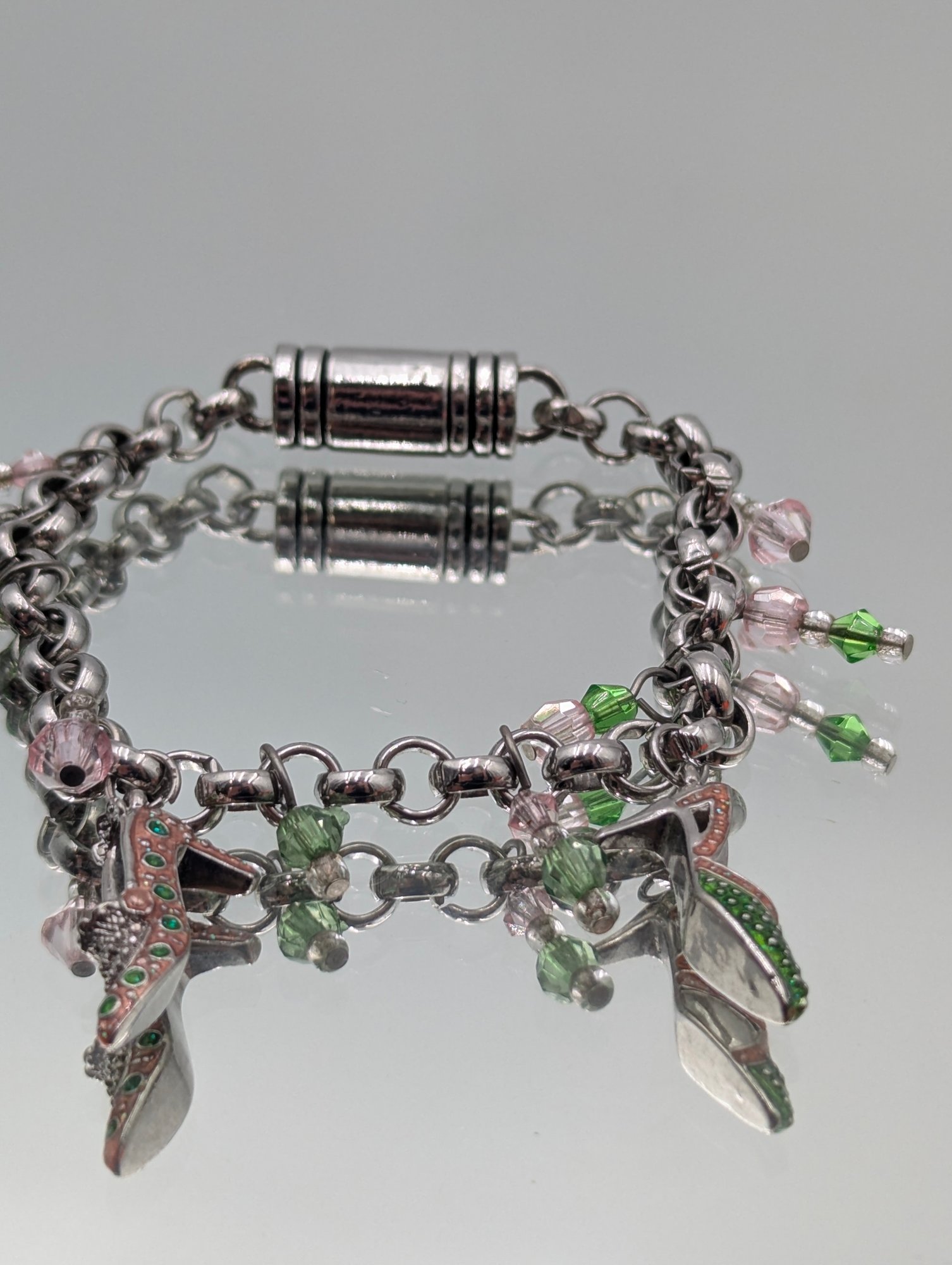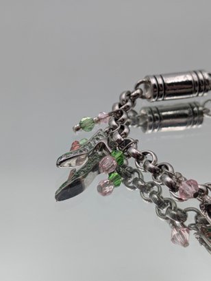 Silver-Tone High-Heel Charm Bracelet With Pink And Green Crystals