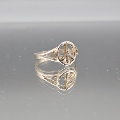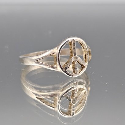 Silver Tone Peace Sign Symbol Ring, Cut-Out Split Shank - Size 10