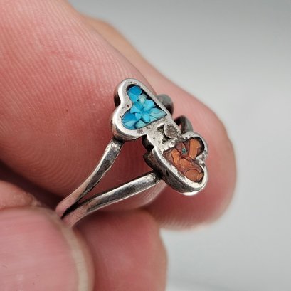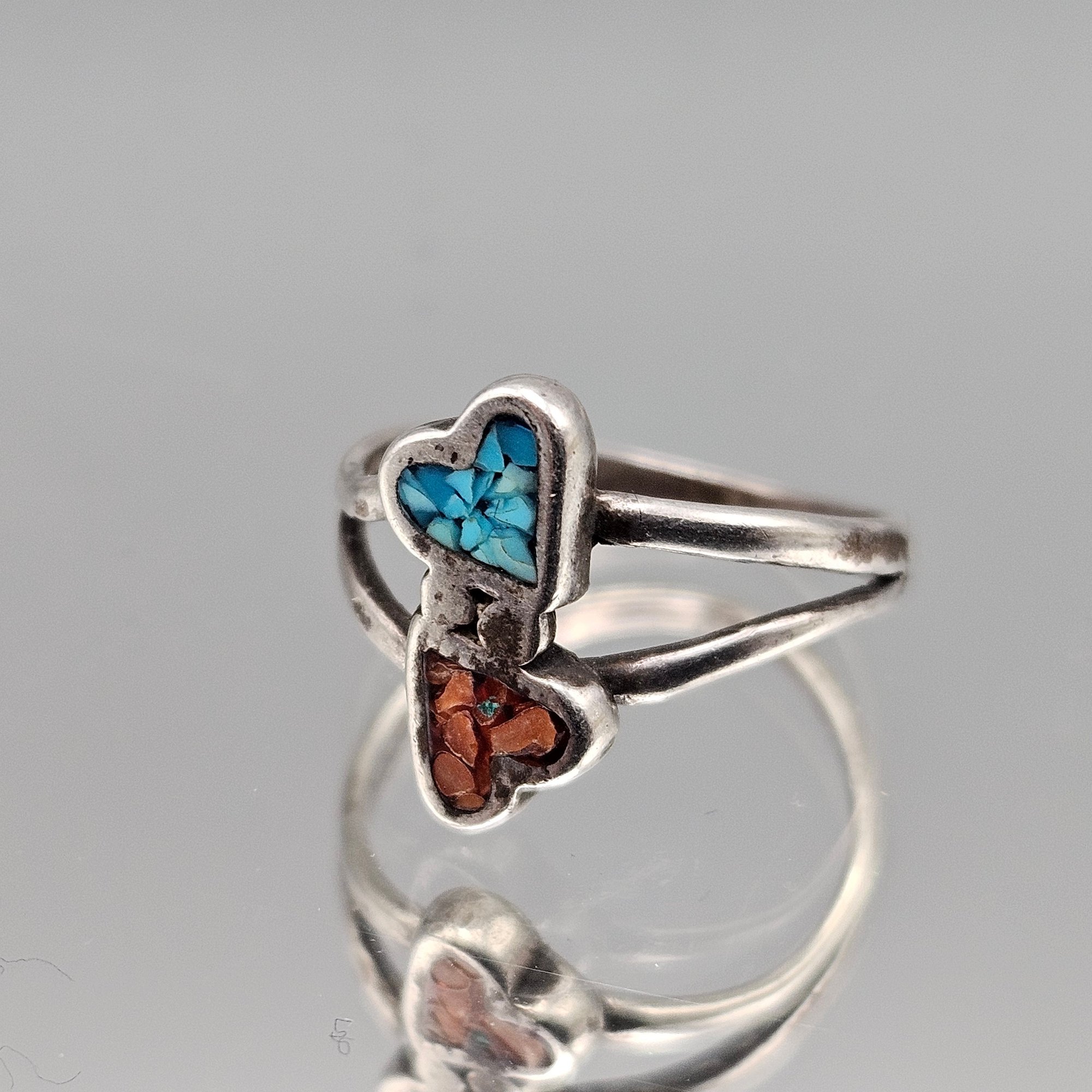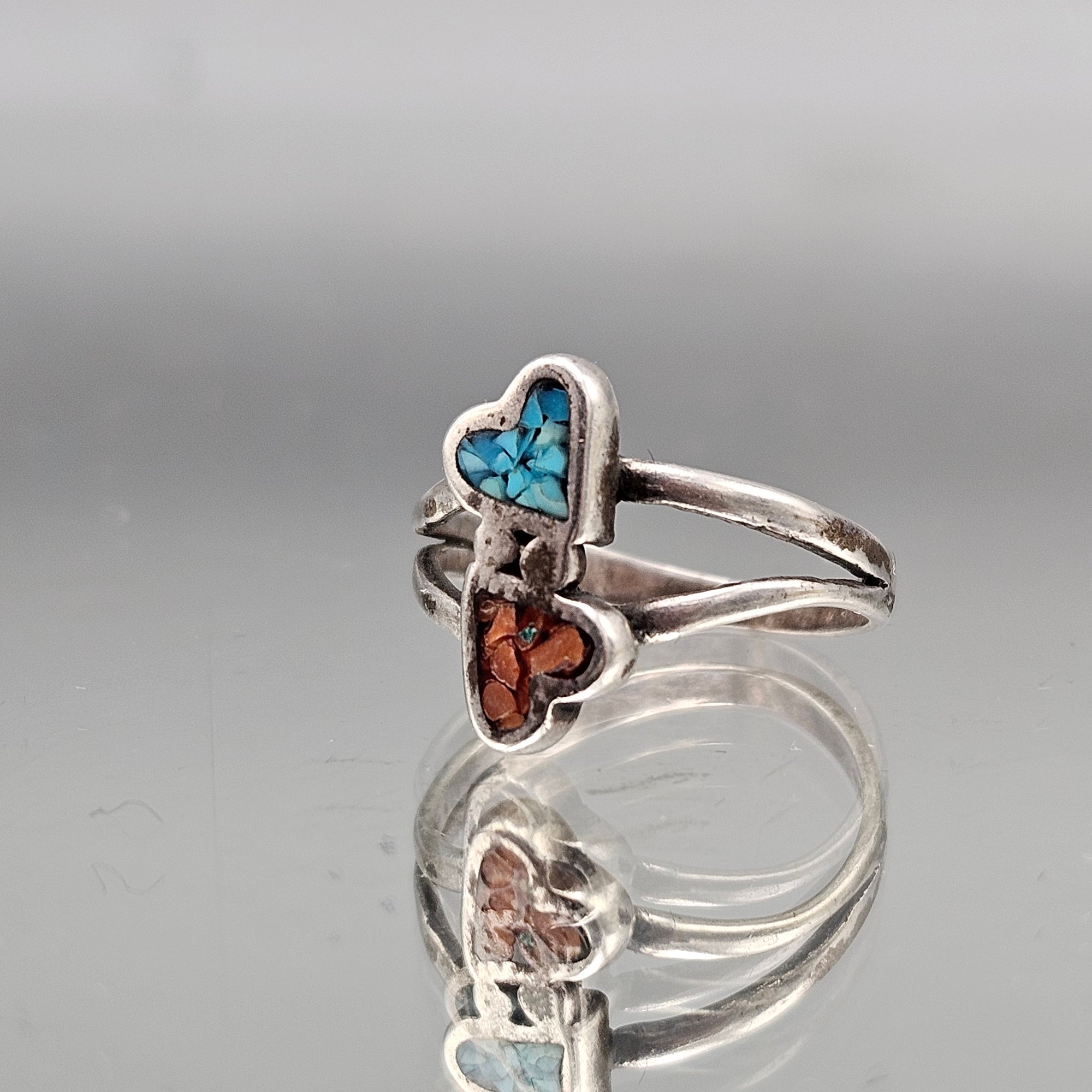 This charming vintage-style ring features a romantic double heart design meticulously crafted with vibrant turquoise and red coral chip inlay. The colorful motif is set in a polished sterling silver band that exemplifies classic Southwestern artisan craftsmanship.
