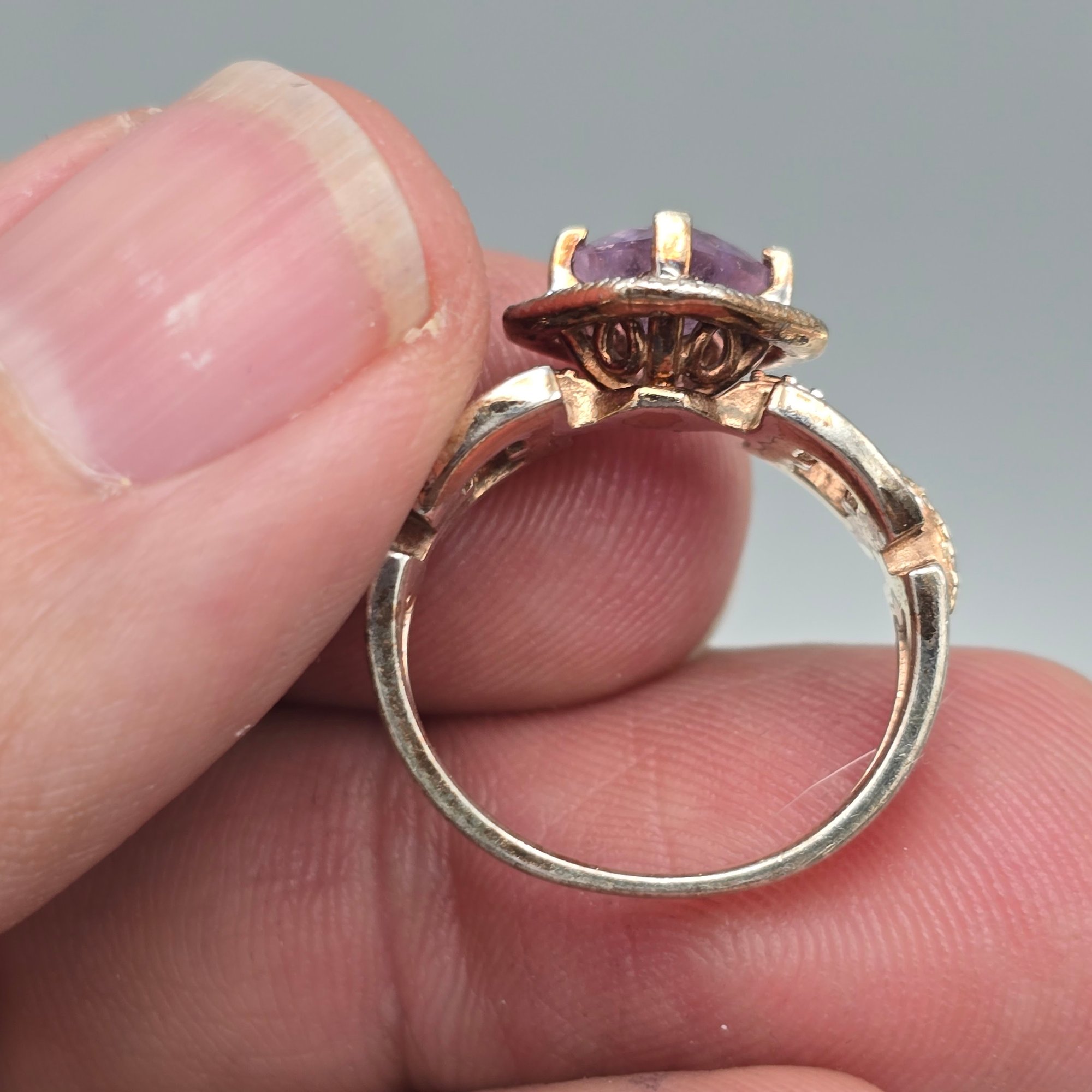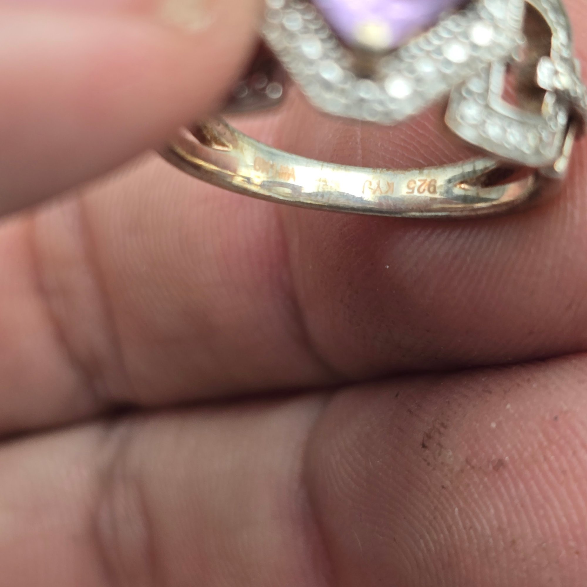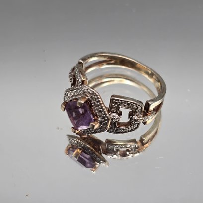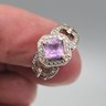 This elegant sterling silver ring features a cushion-cut purple amethyst center stone surrounded by a shimmering halo and unique buckle-style side accents.