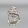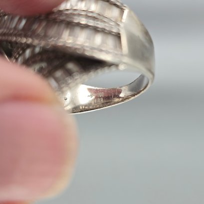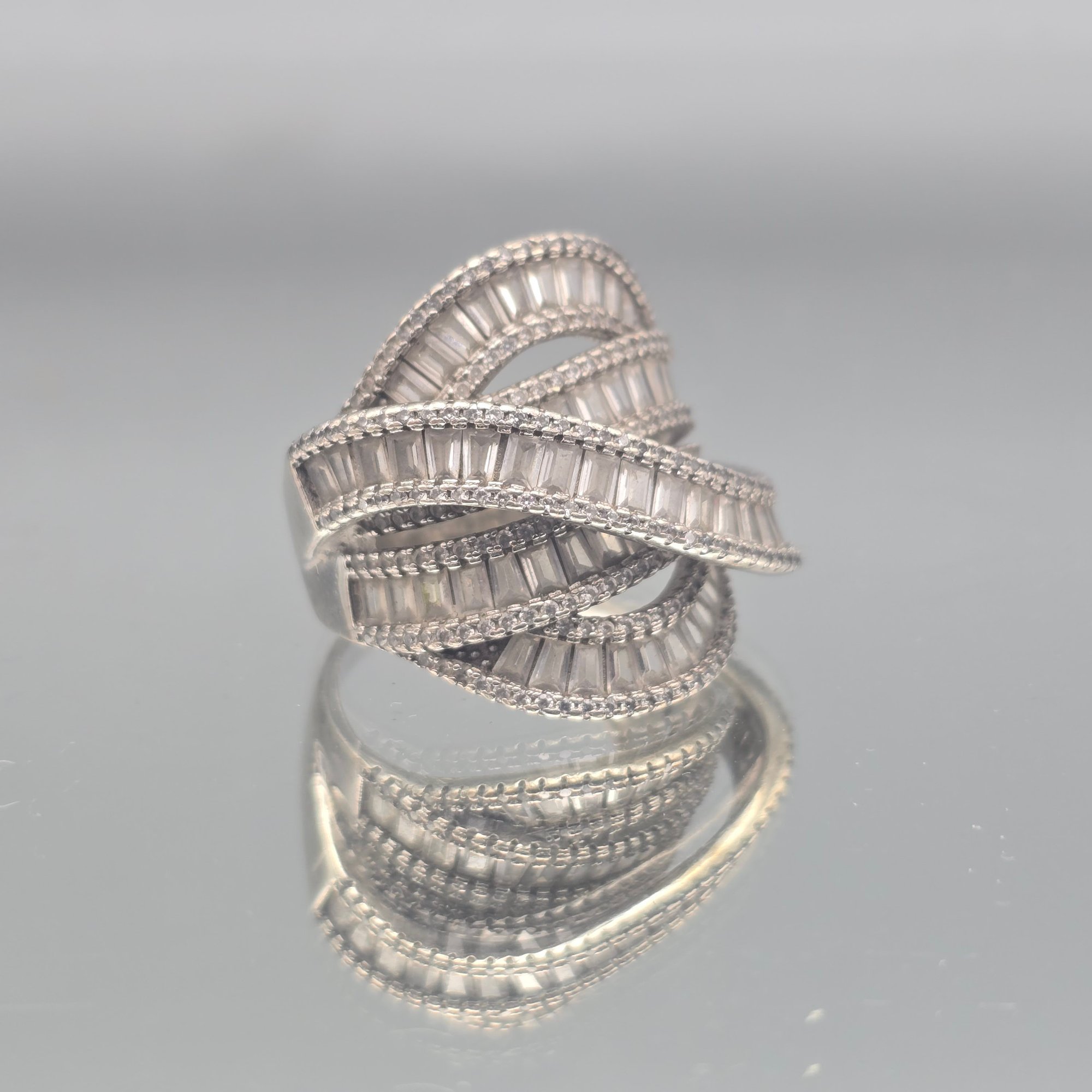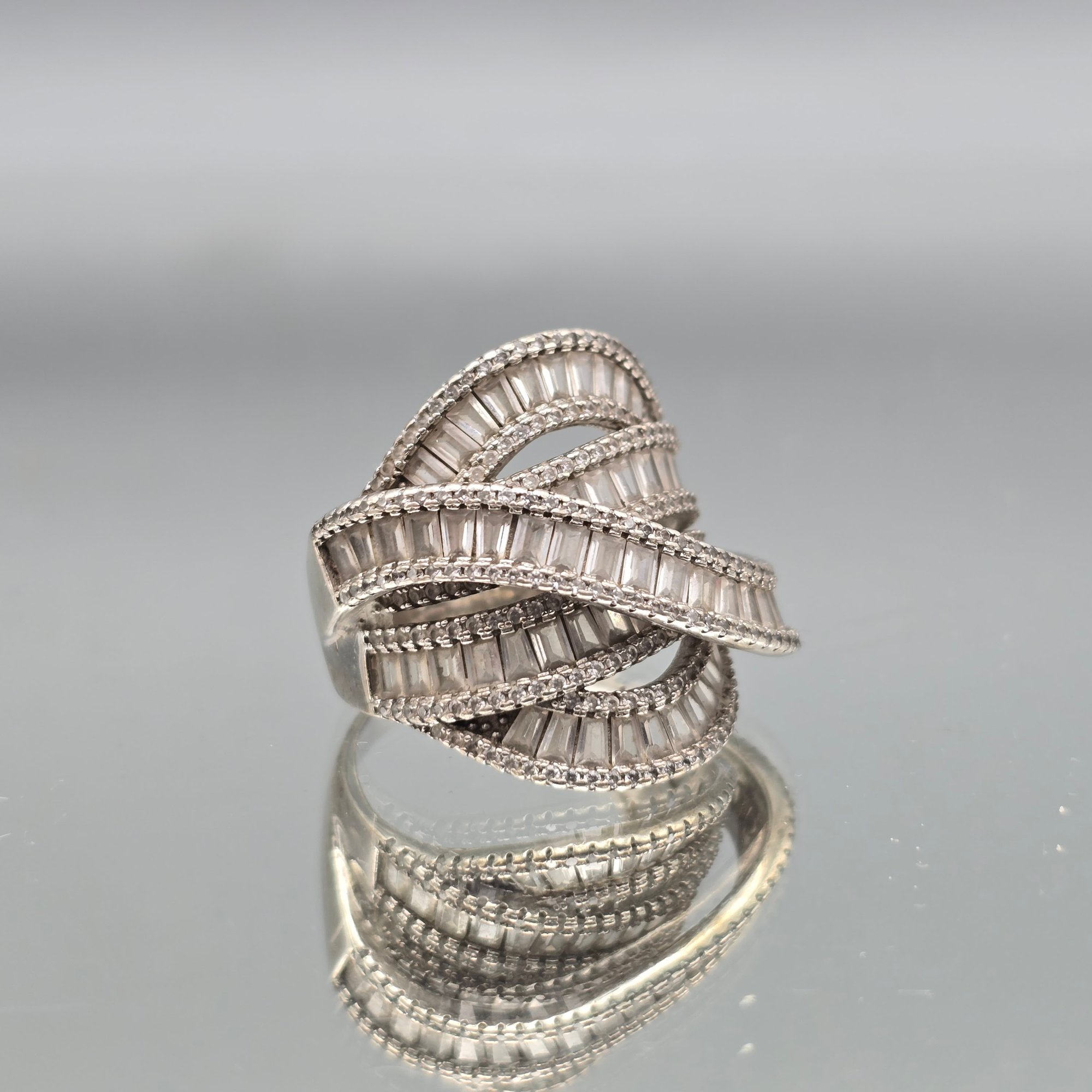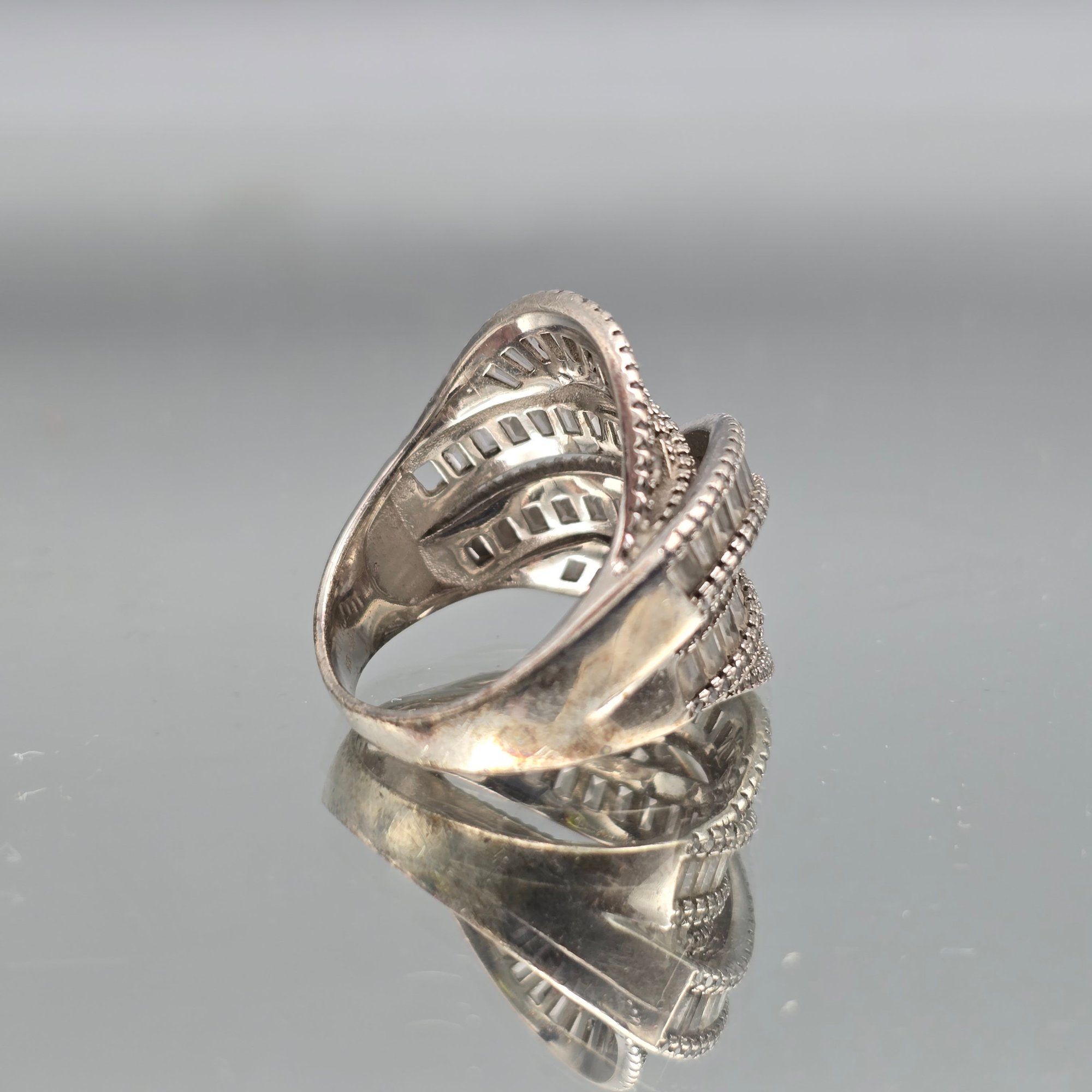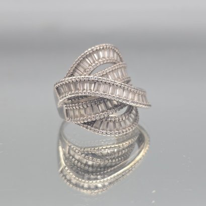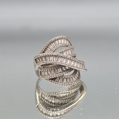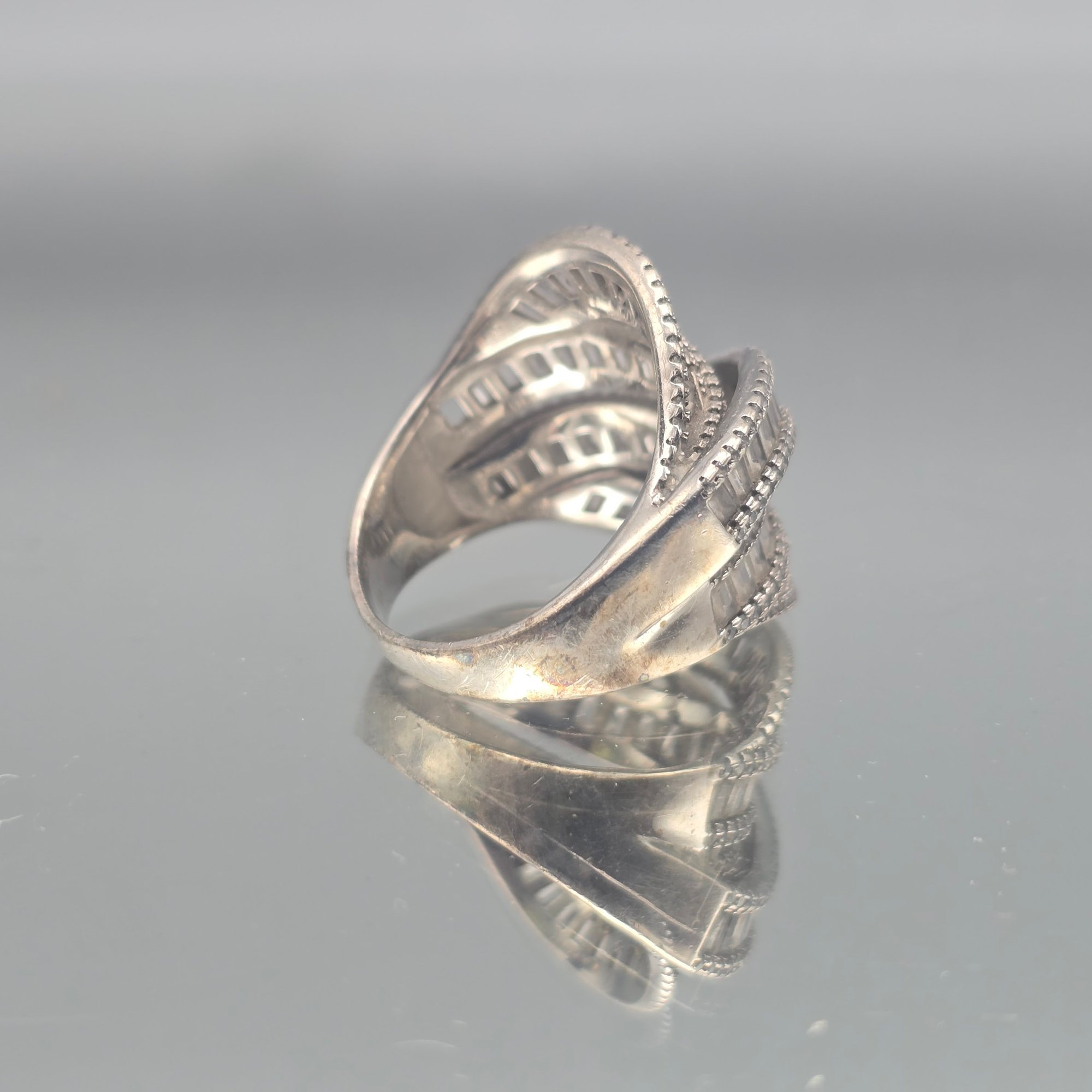 This elegant ring features multiple tiered bands of channel-set baguette stones bordered by delicate milgrain detailing, crafted in sterling silver with a striking, wide-profile crossover design.