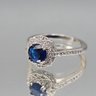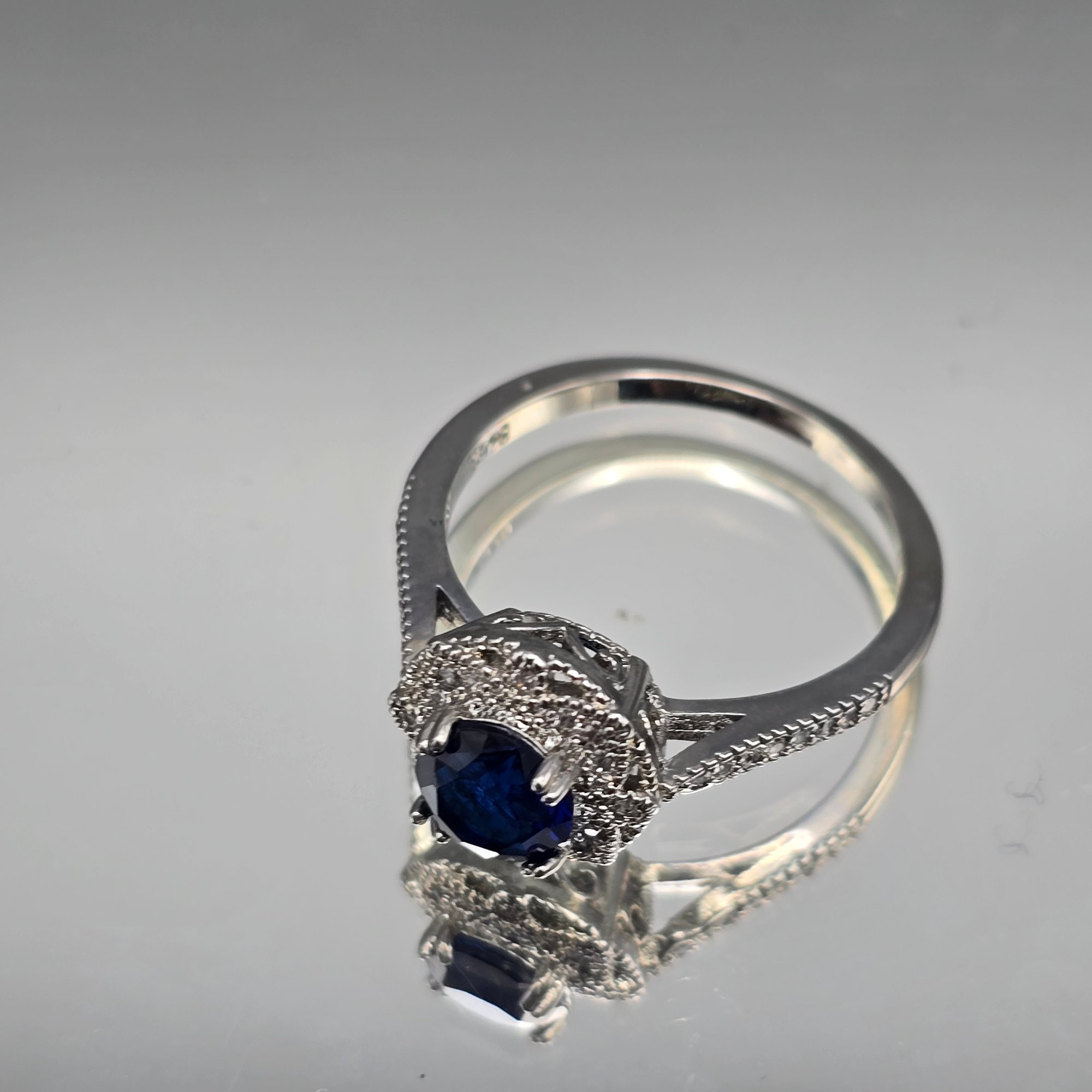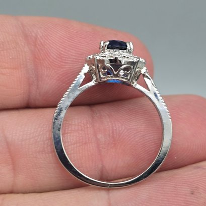 This elegant size 10.25 ring is crafted from sterling silver with a 925 hallmark and features a vibrant round-cut blue center stone surrounded by a shimmering halo and accented split-shank band.