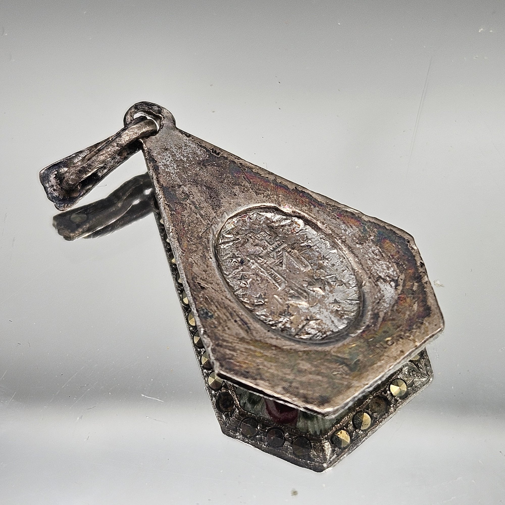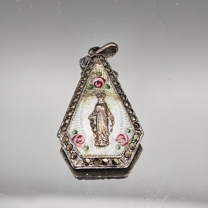 Sterling Silver Miraculous Medal Pendant with Enamel Roses & Marcasite Border