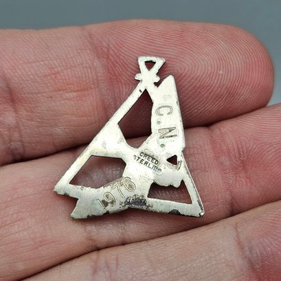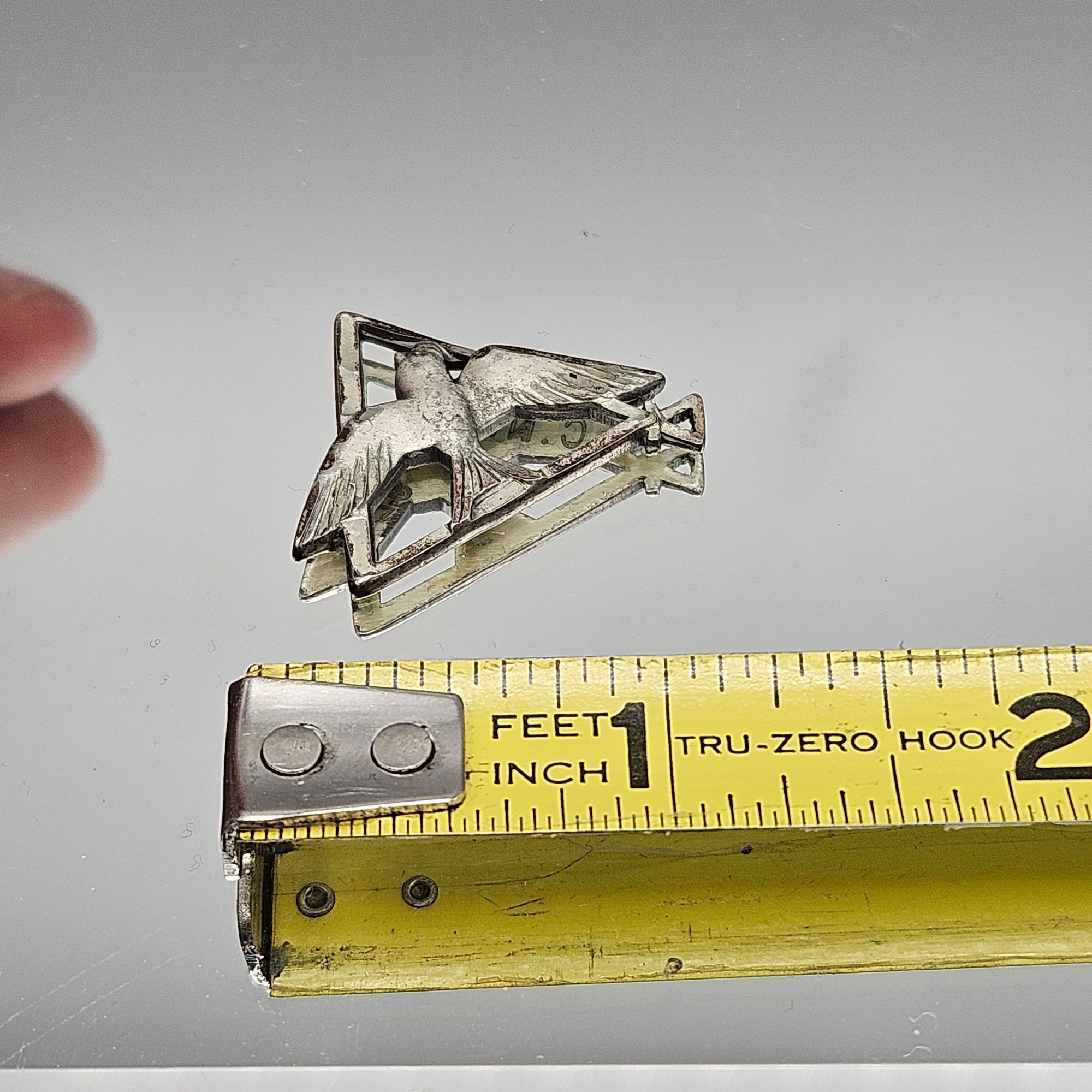 This authentic sterling silver charm by Creed features a detailed dove in flight set against a geometric triangle, measuring approximately one inch in width. Dated 1976 and marked "C.N.," this vintage piece combines mid-century religious symbolism with a classic brushed silver finish.