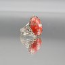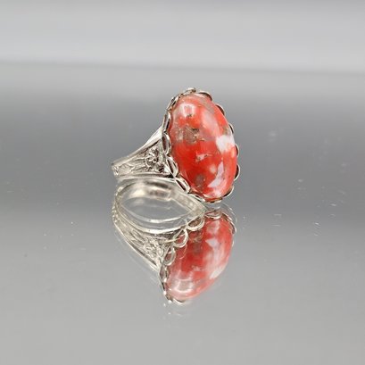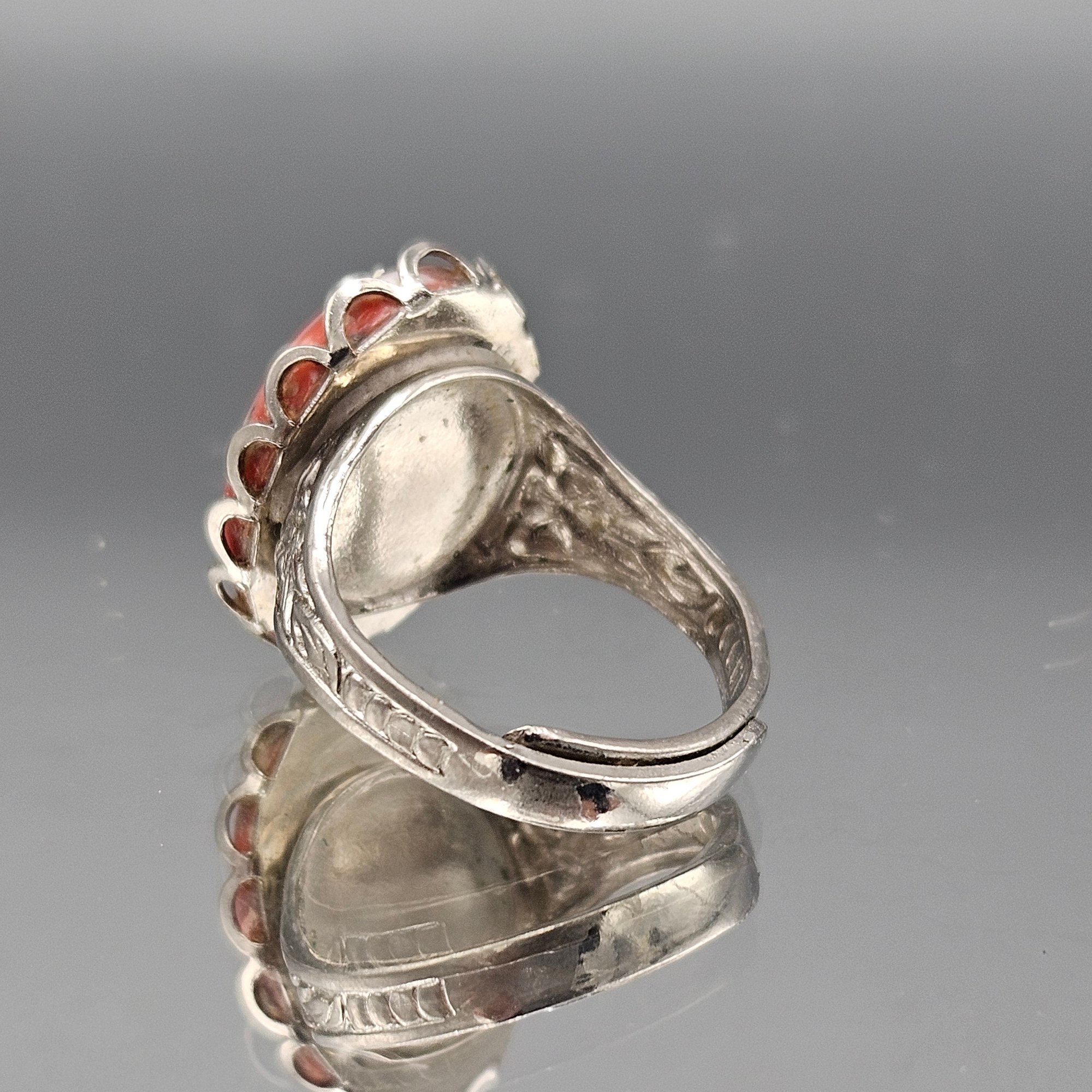 Vintage Adjustable Silver-Tone Ring with Oval Red and White Mottled Faux Stone