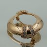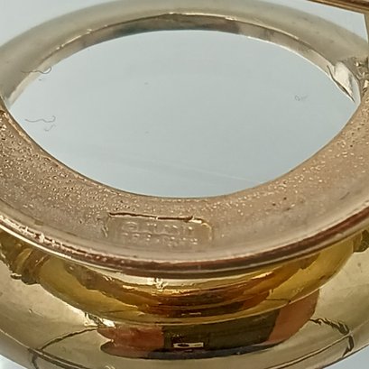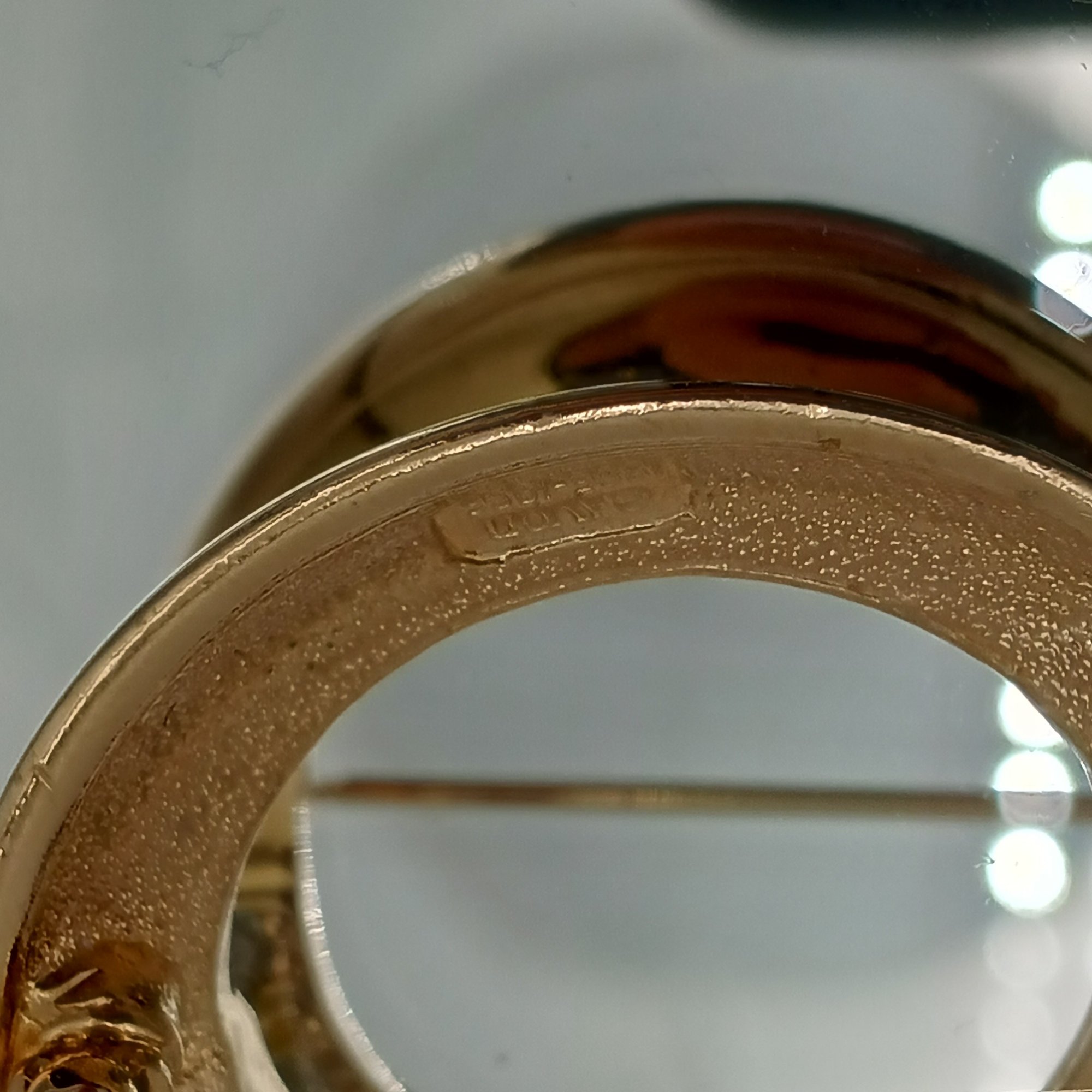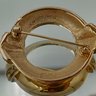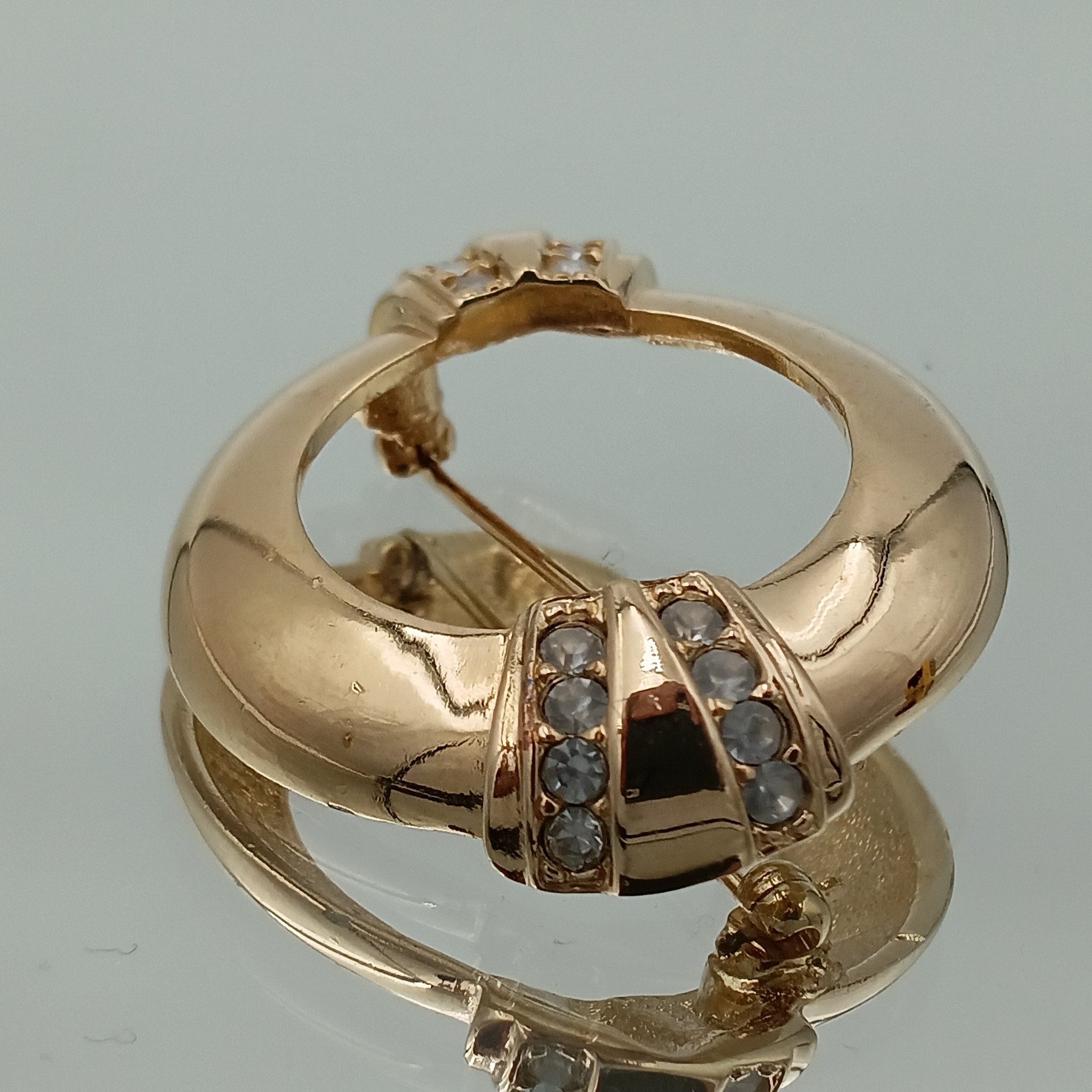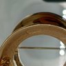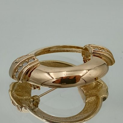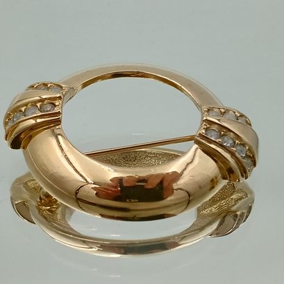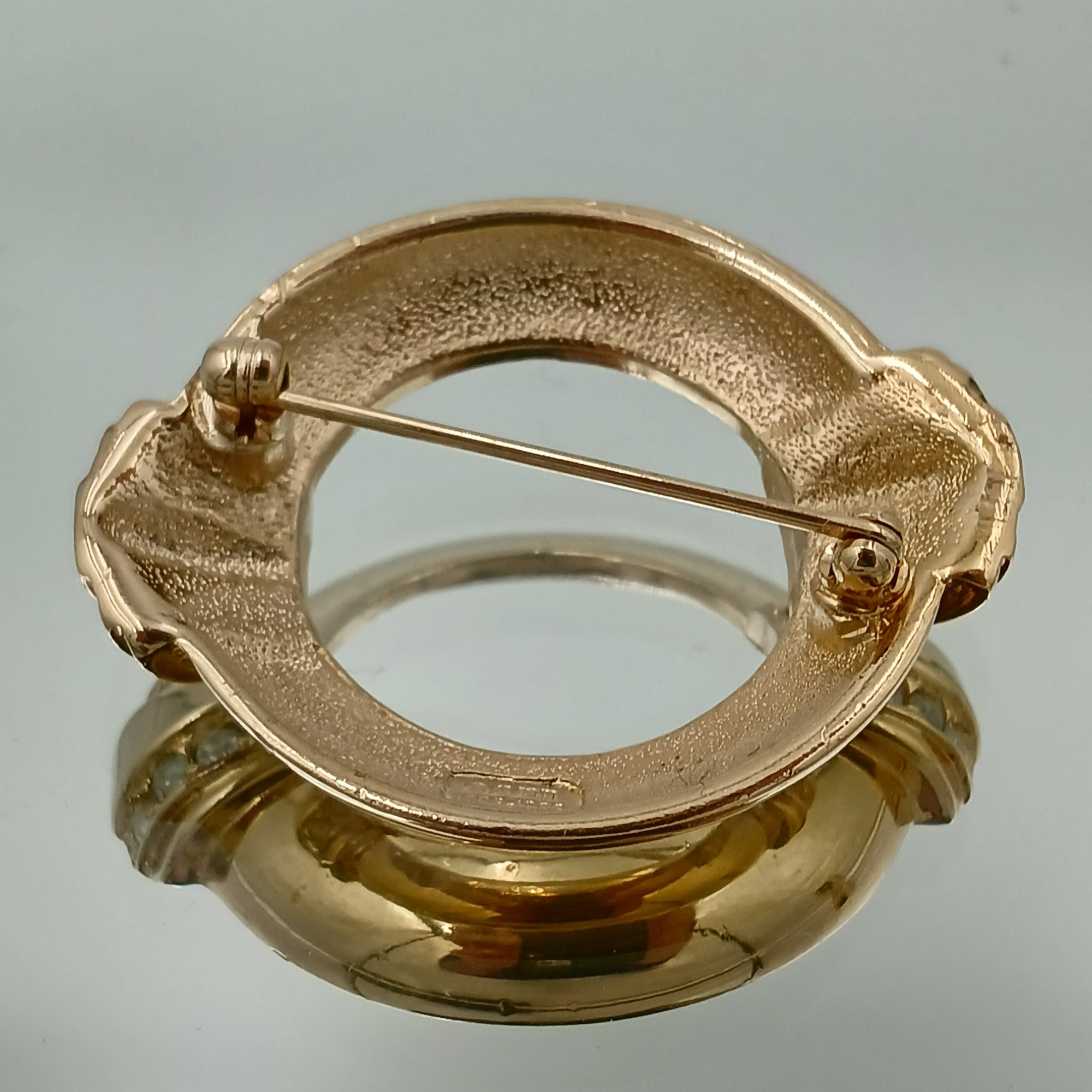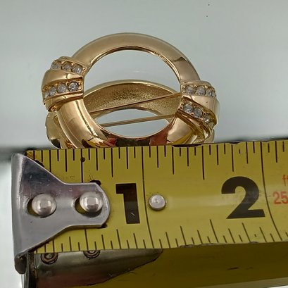 This elegant 1.5-inch circular brooch features a polished gold-tone finish accented by two decorative ribbed bands set with shimmering clear rhinestones