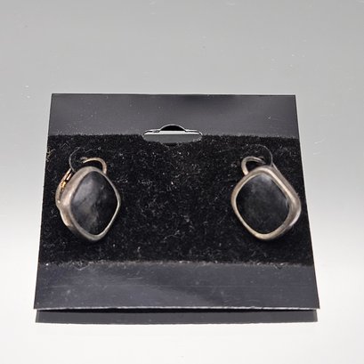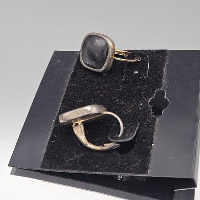 Vintage Black Stone Silver Tone Hinged Hoop Earrings
