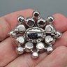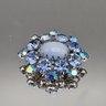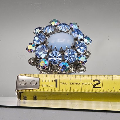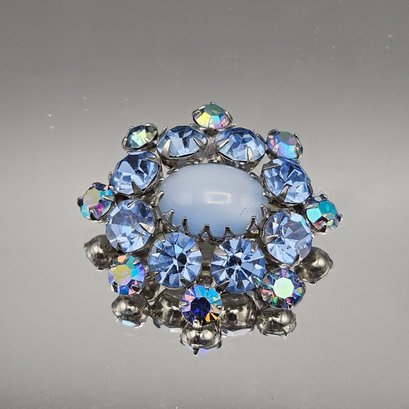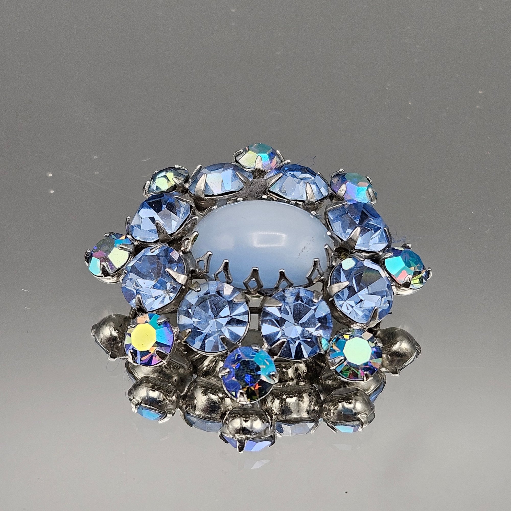 This charming vintage brooch features a large, milky blue oval cabochon center surrounded by a tiered halo of vibrant blue and shimmering Aurora Borealis rhinestones.