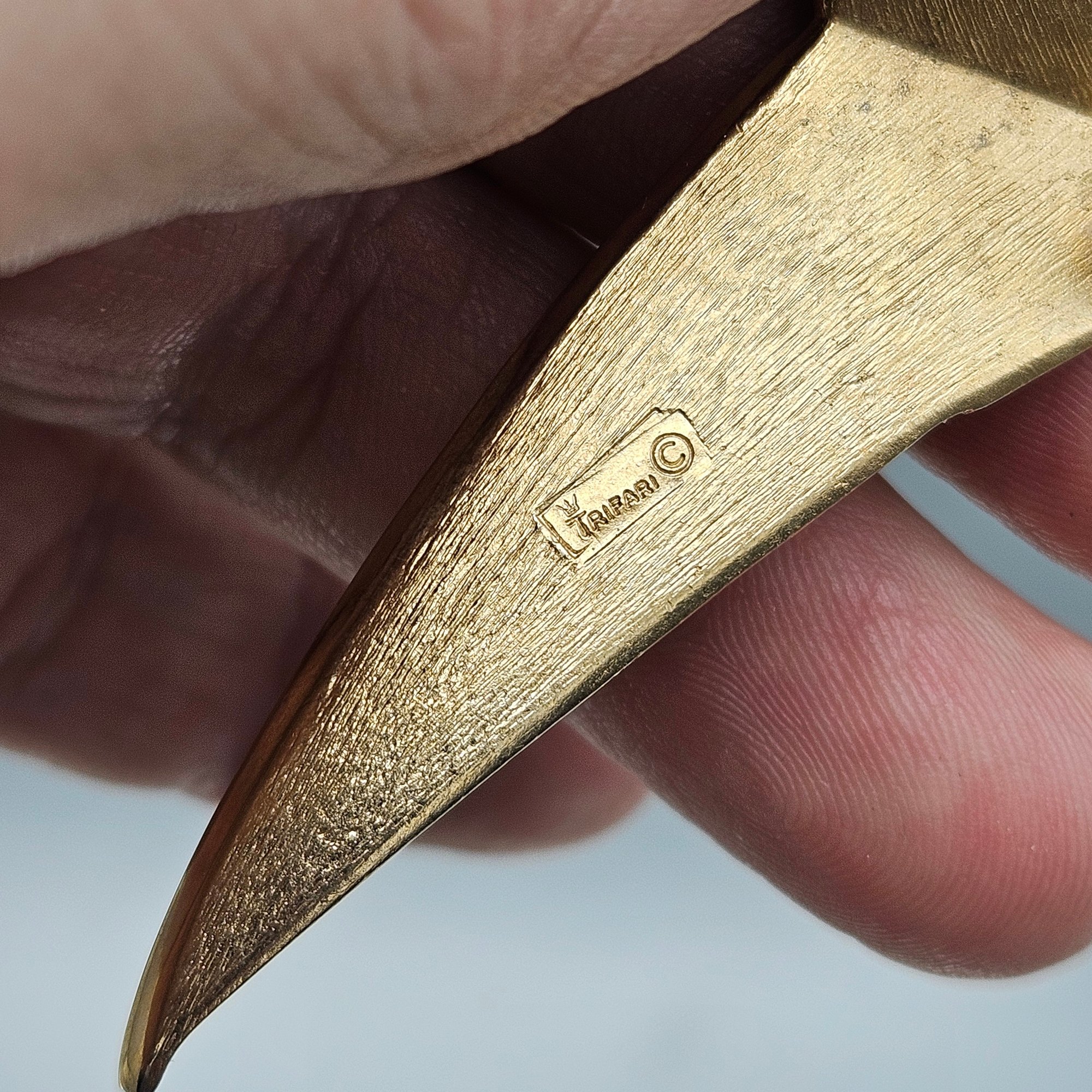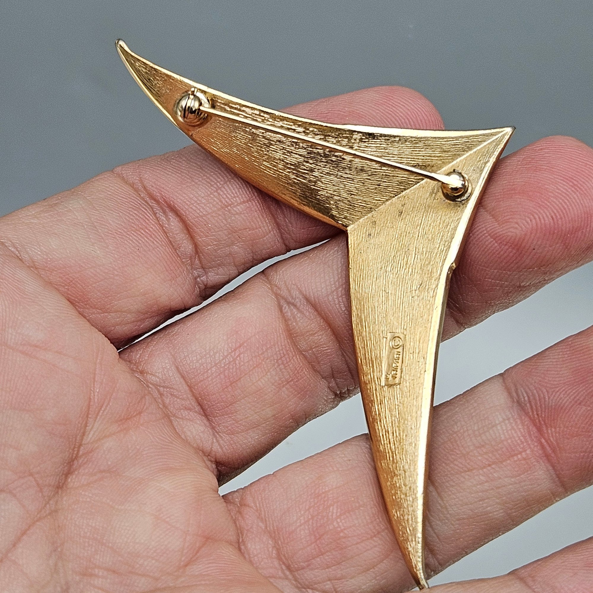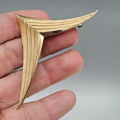 This elegant brooch from the mid-20th century features a modernist chevron or "angel wing" design crafted in a combination of textured and polished gold-tone metal