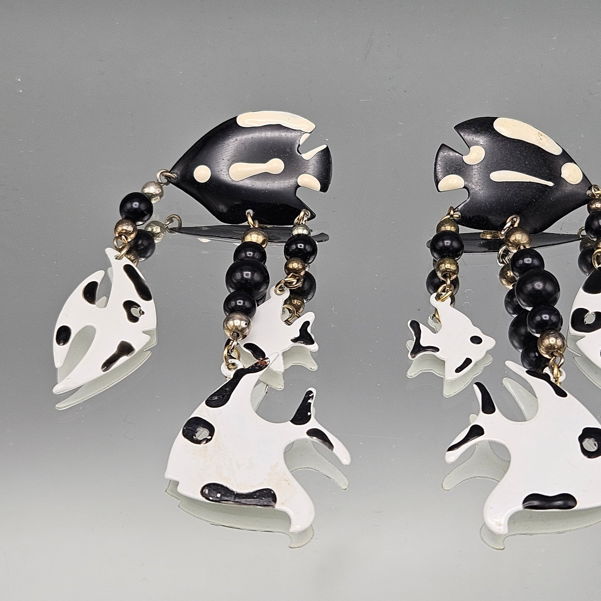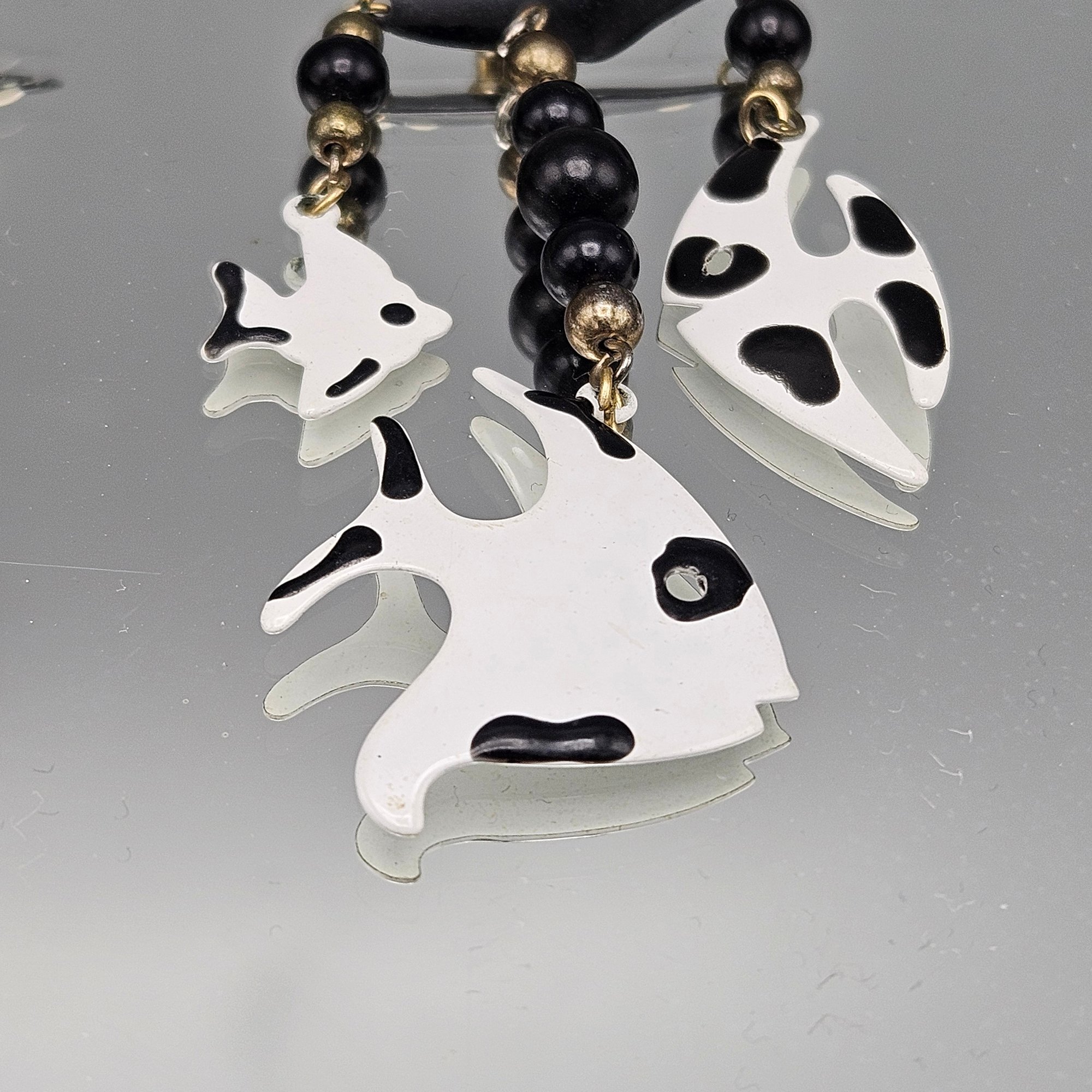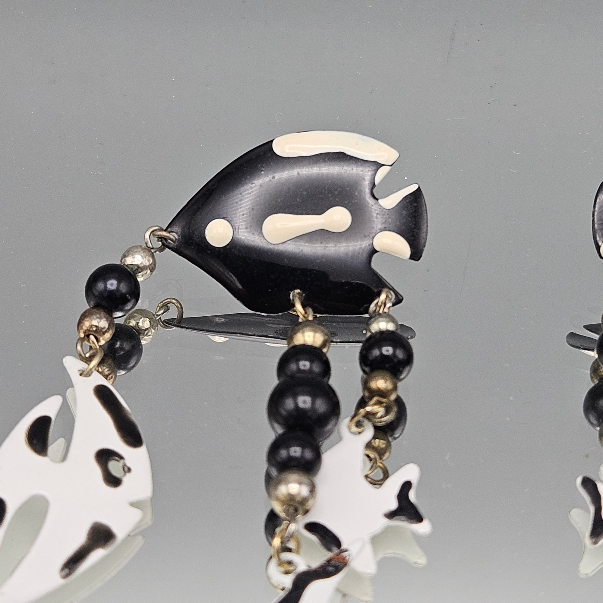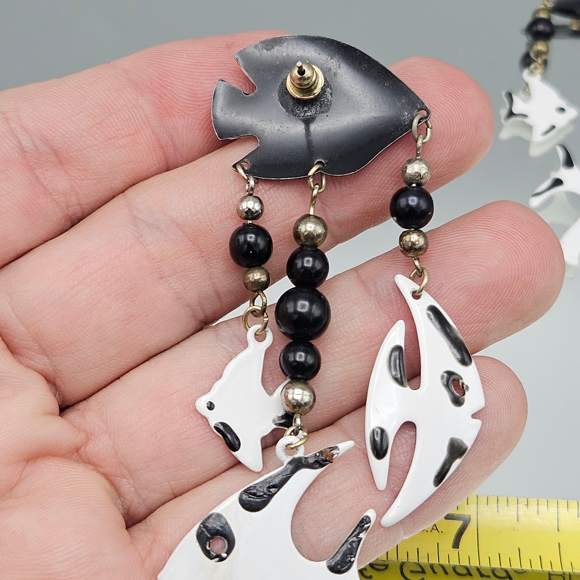 These striking statement earrings feature a bold black and white tropical fish design crafted from enamel and accented with tiered bead dangles. Measuring approximately 3.5 inches in length, they offer a playful, nautical aesthetic perfect for vintage jewelry collectors or summer styling.
