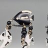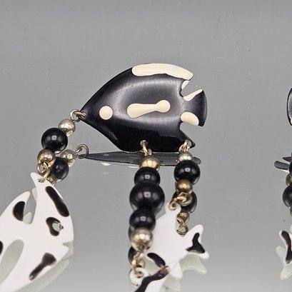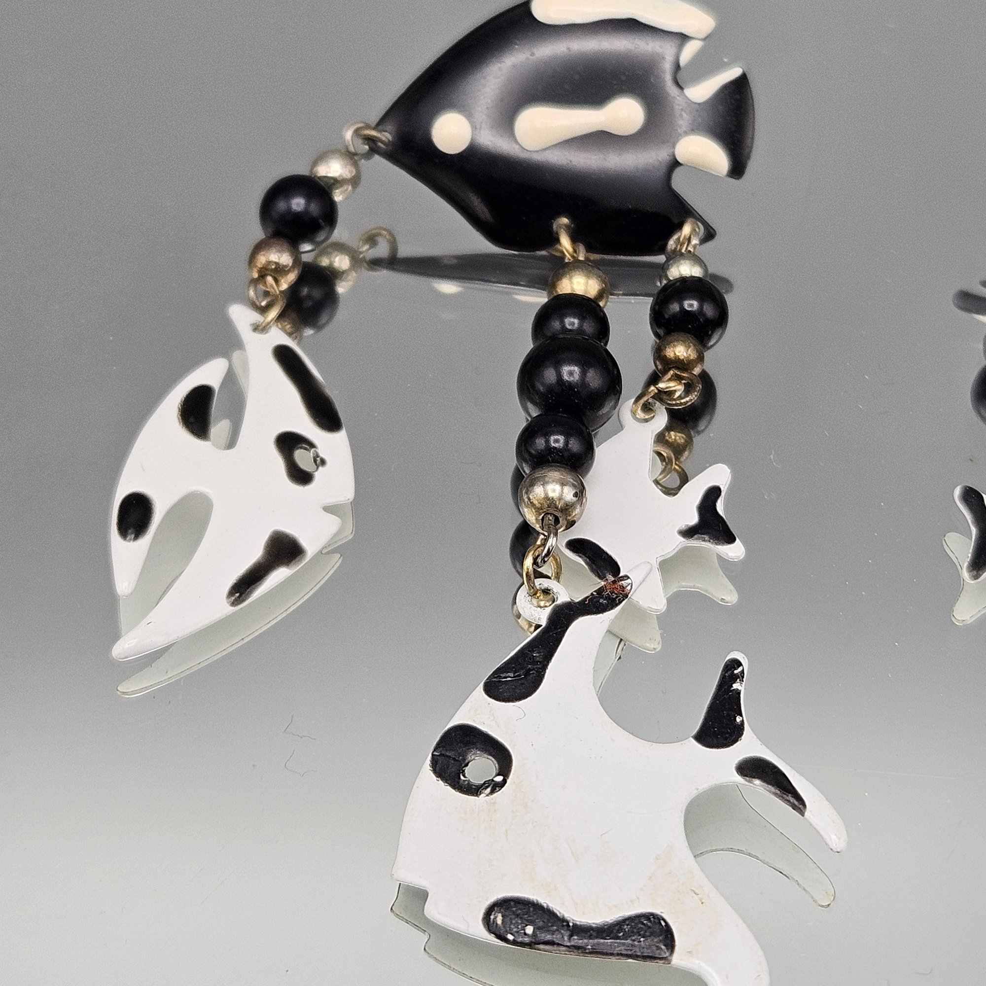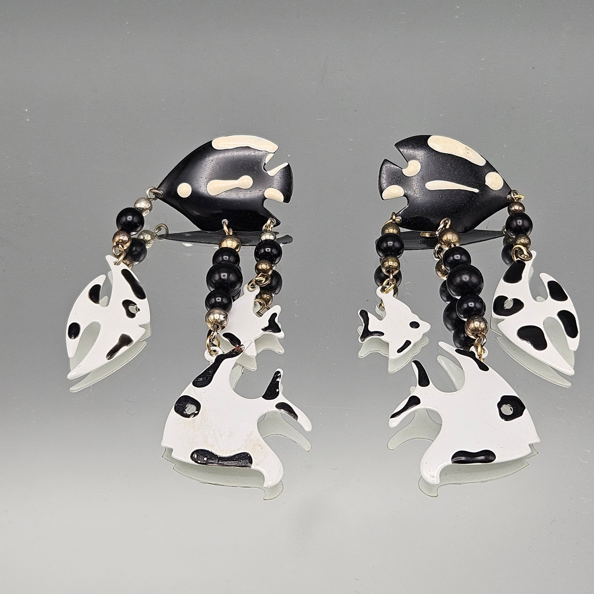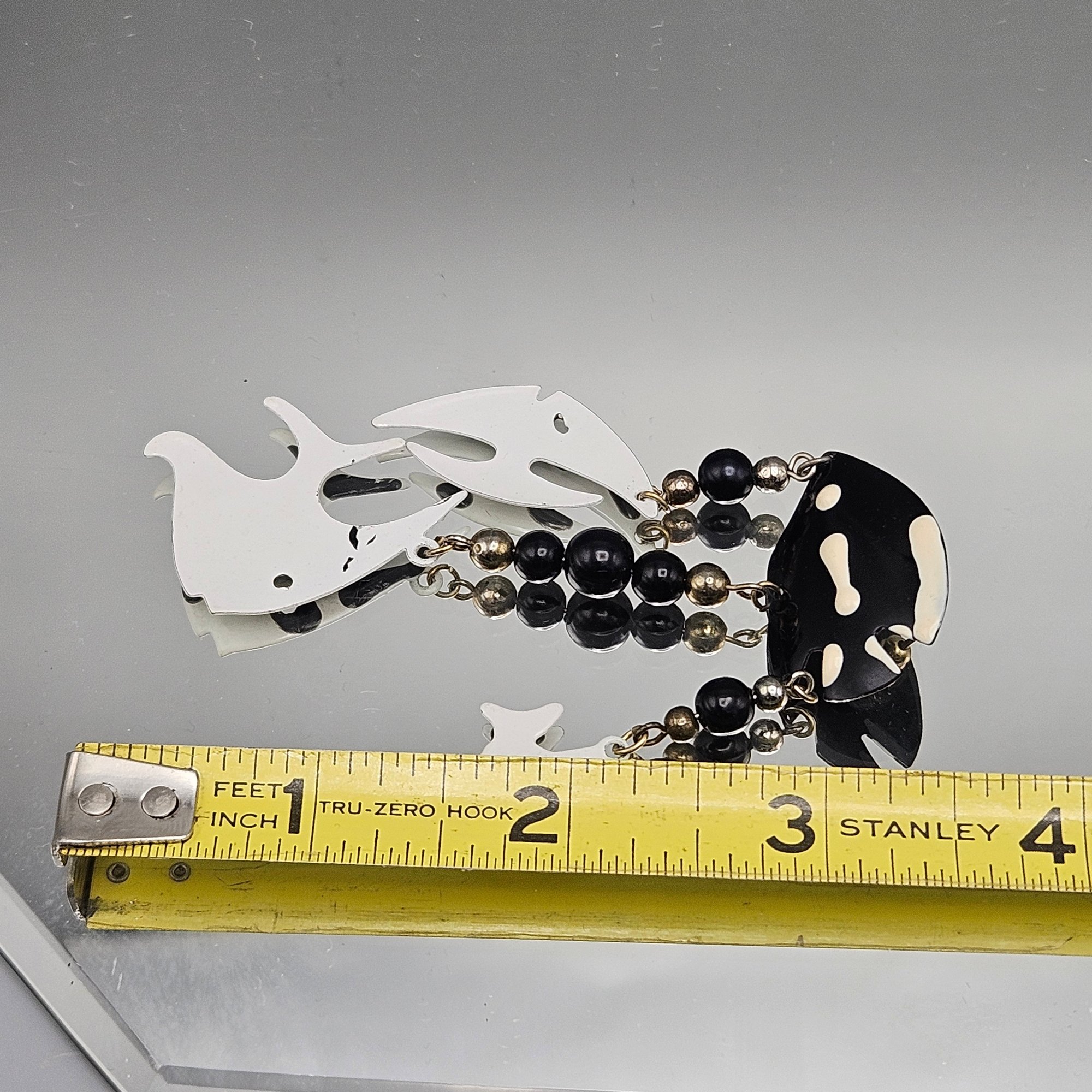 These striking statement earrings feature a bold black and white tropical fish design crafted from enamel and accented with tiered bead dangles. Measuring approximately 3.5 inches in length, they offer a playful, nautical aesthetic perfect for vintage jewelry collectors or summer styling.