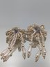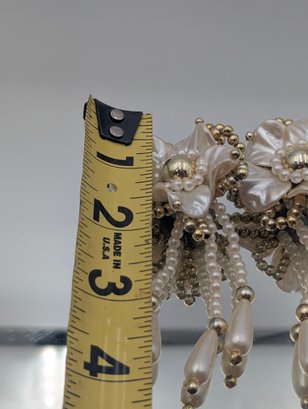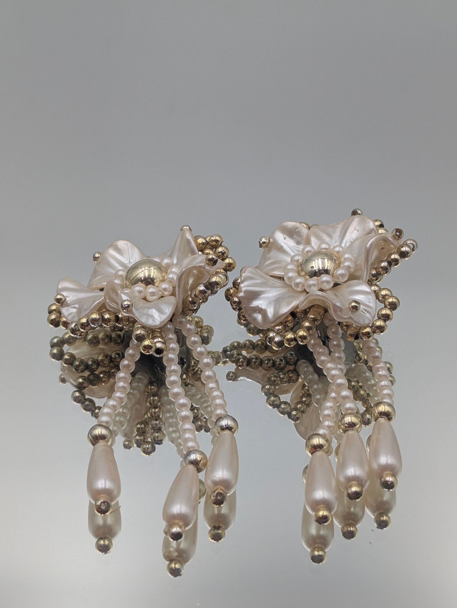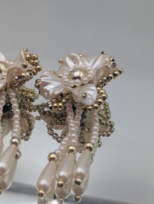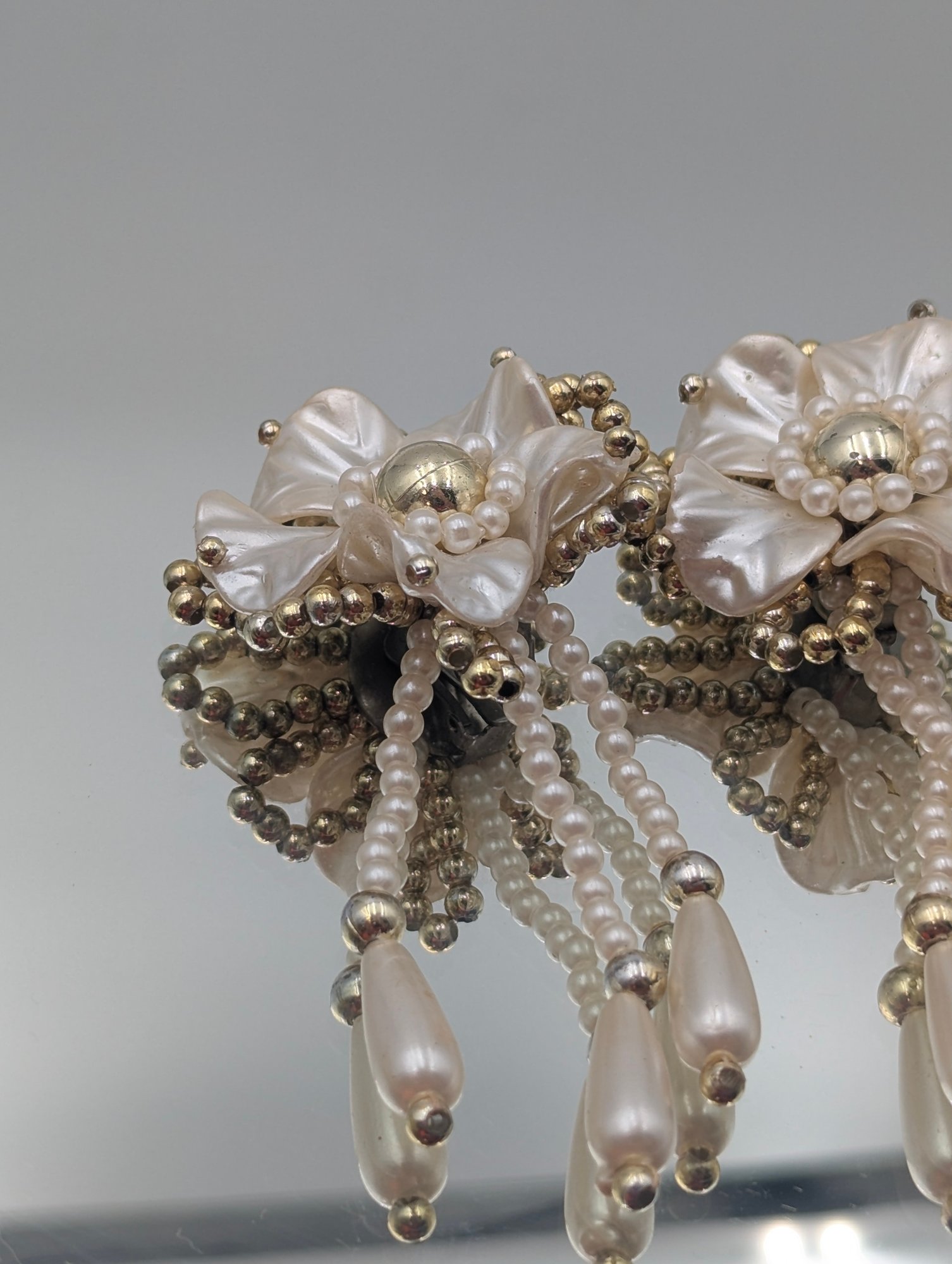 Vintage Faux Pearl Flower Clip-On Earrings With Beaded Tassel Dangle