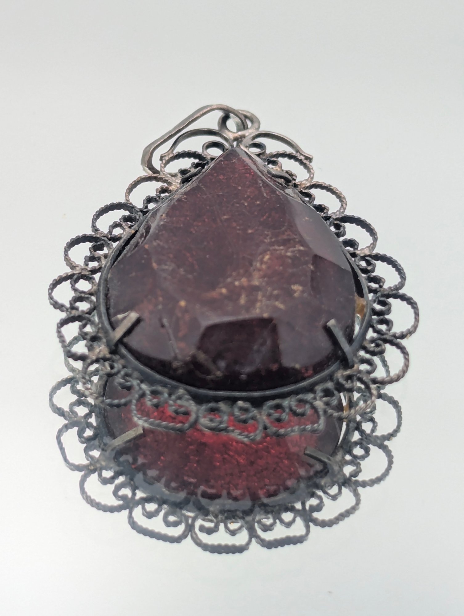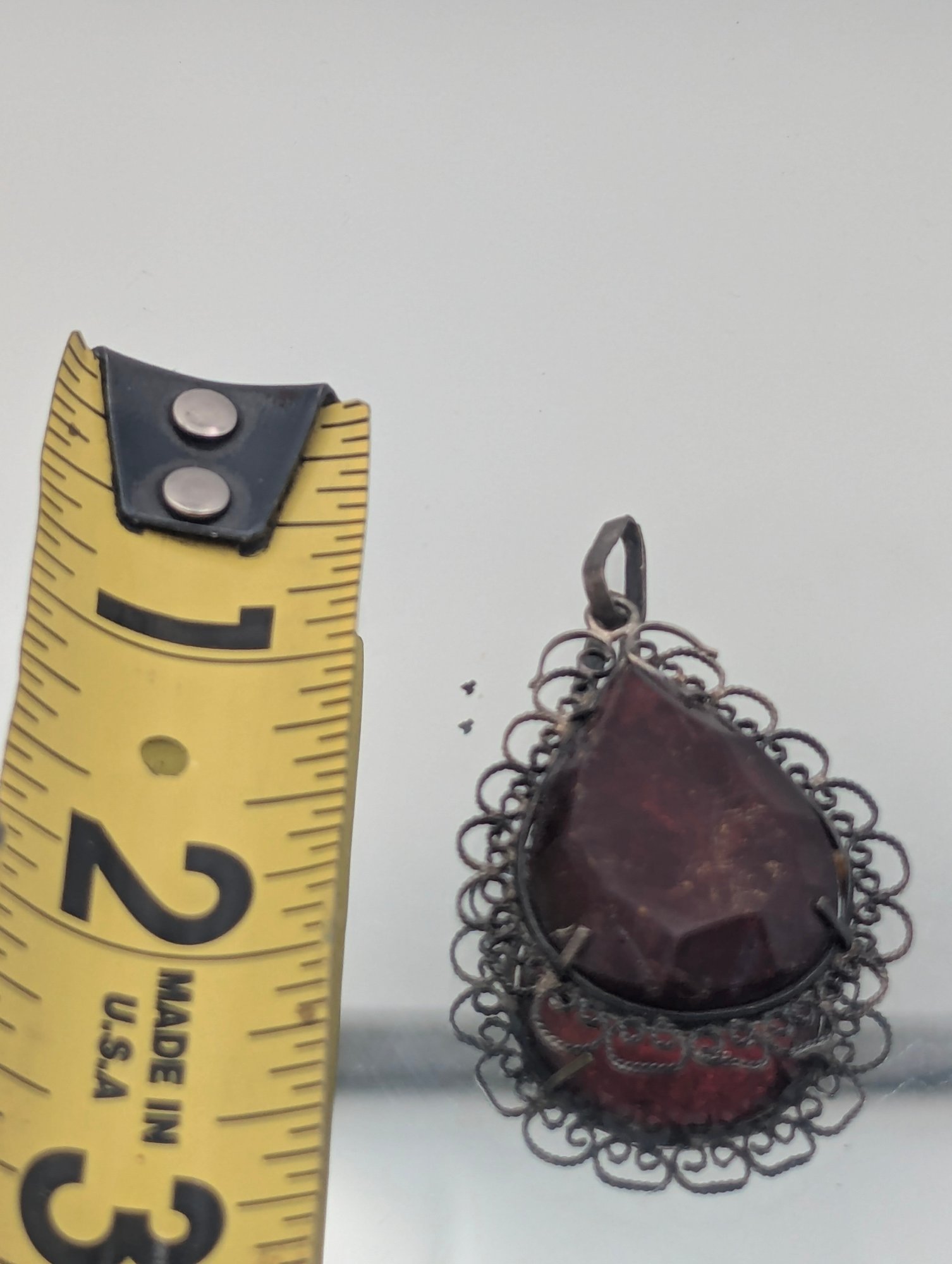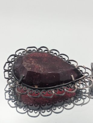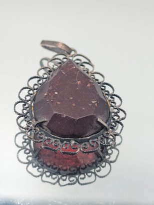 Vintage Filigree Cherry Amber Pear-Shaped Pendant Ornate Sterling Silver Frame