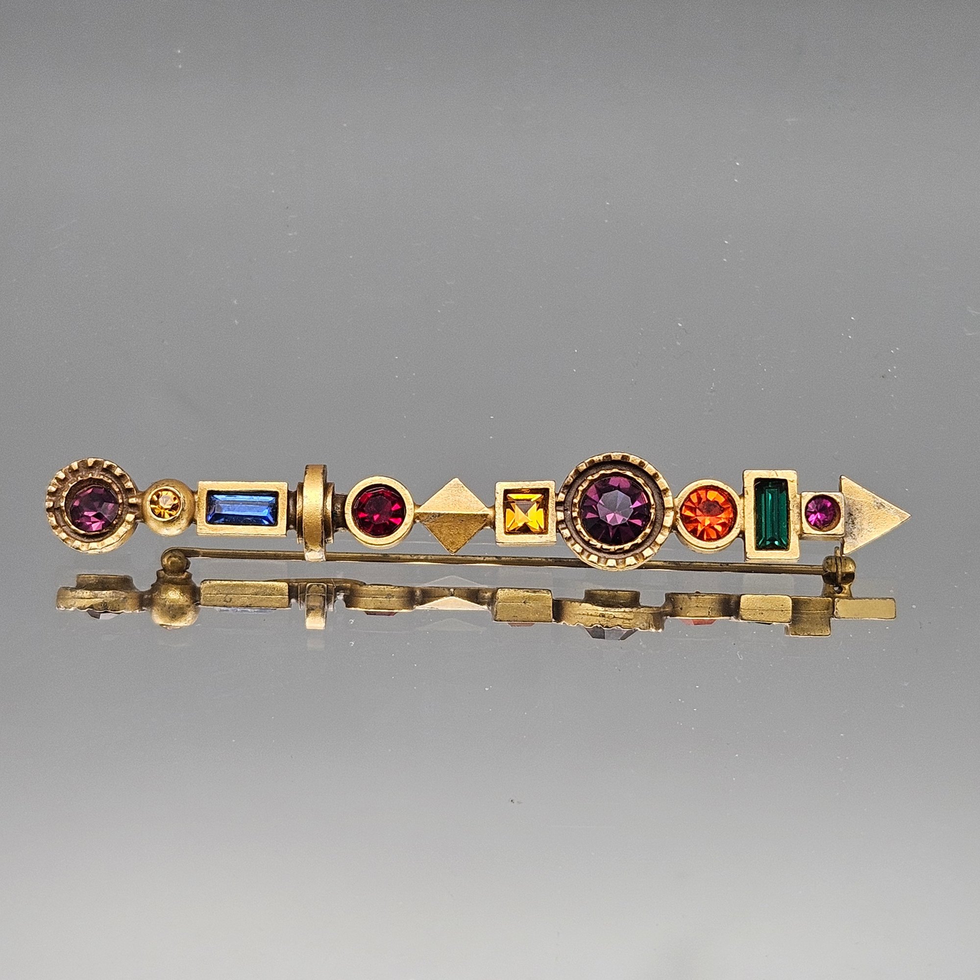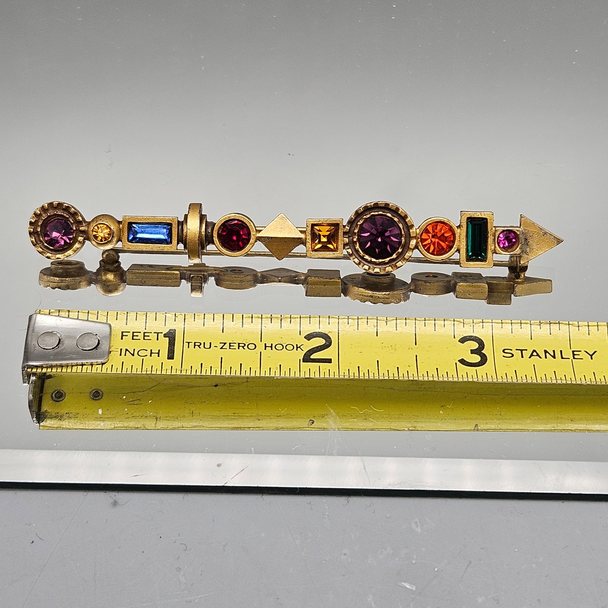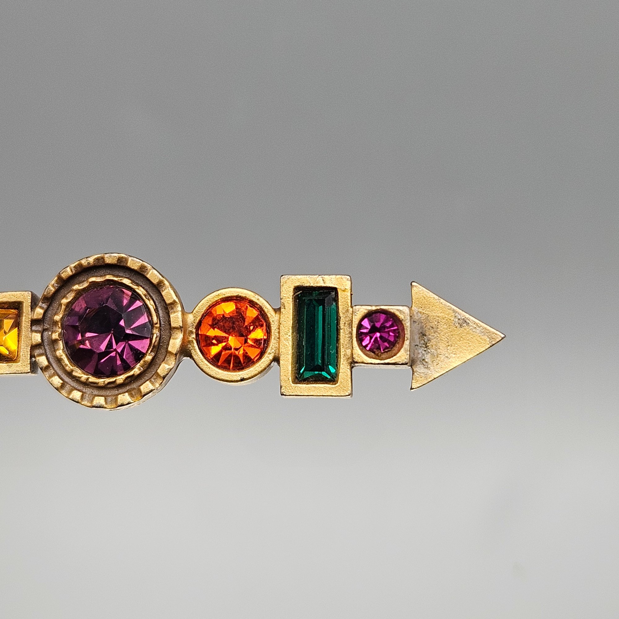 This vibrant 3.5-inch gold-tone bar brooch features a striking eclectic arrangement of colorful, multi-shaped rhinestones set in unique geometric frames that culminate in a stylized arrow tip.