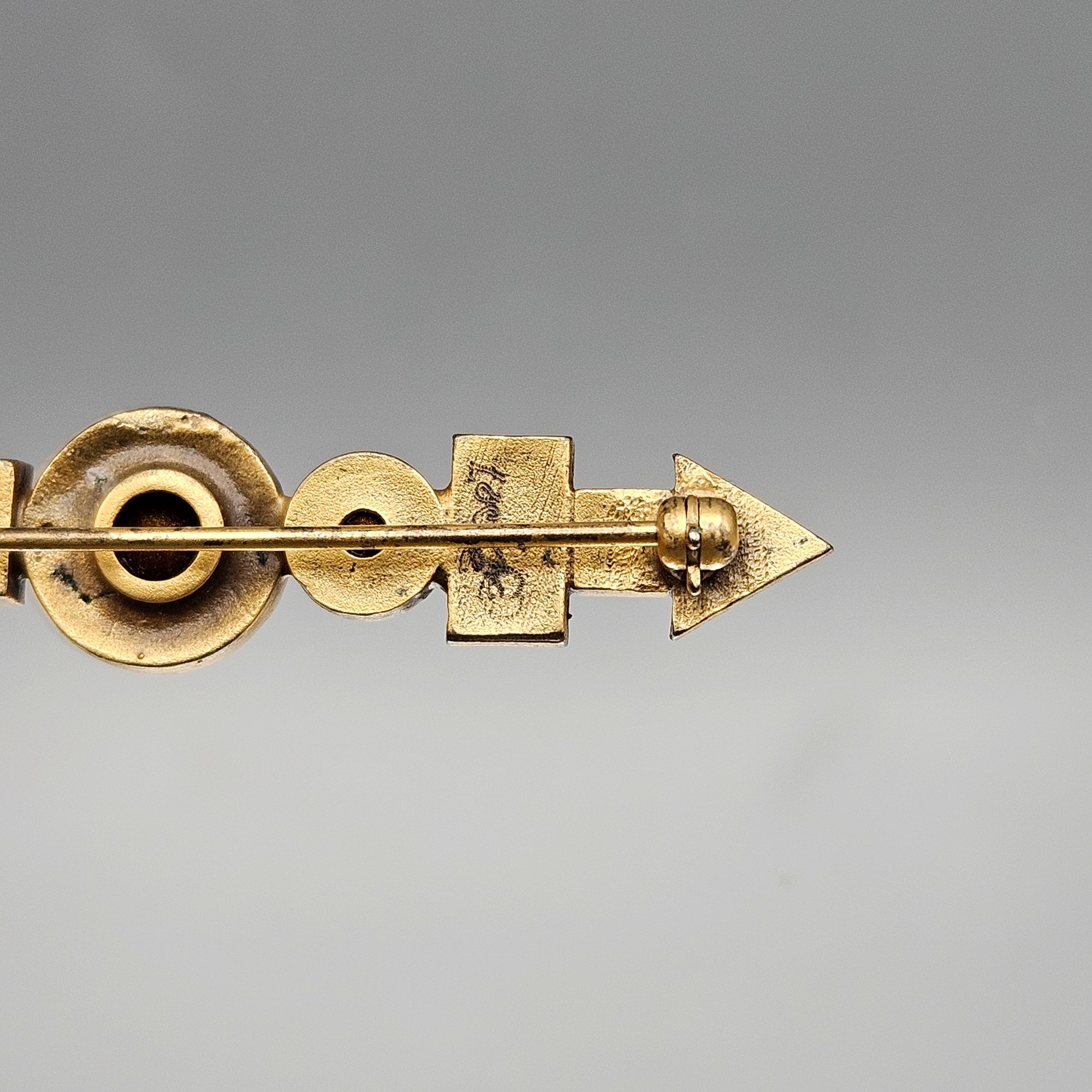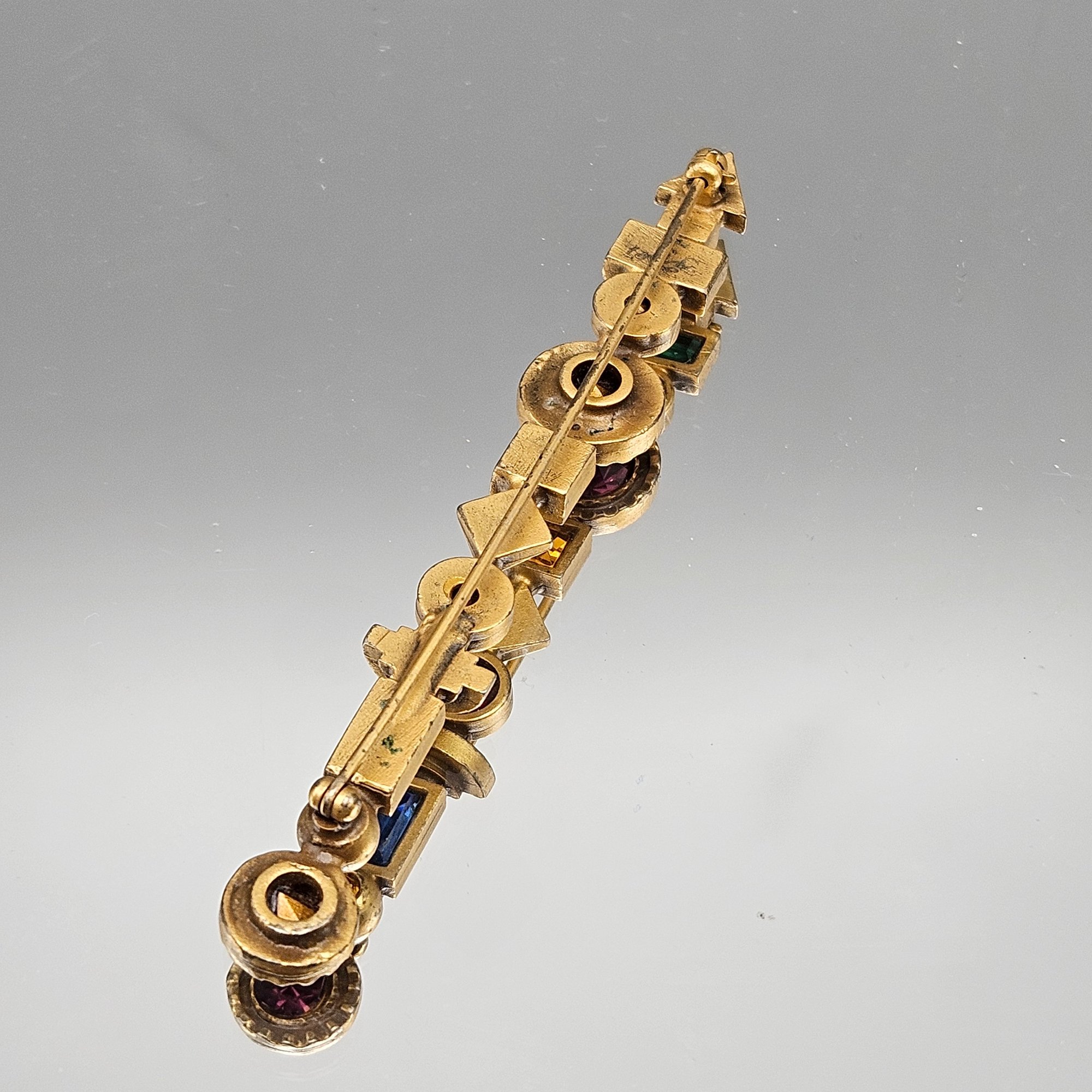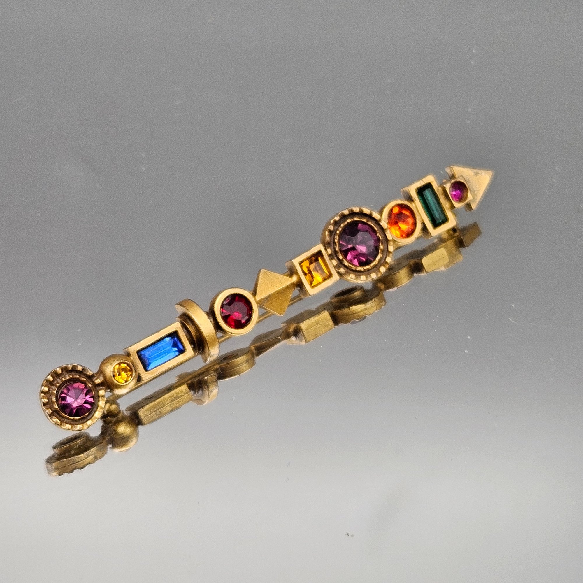 This vibrant 3.5-inch gold-tone bar brooch features a striking eclectic arrangement of colorful, multi-shaped rhinestones set in unique geometric frames that culminate in a stylized arrow tip.