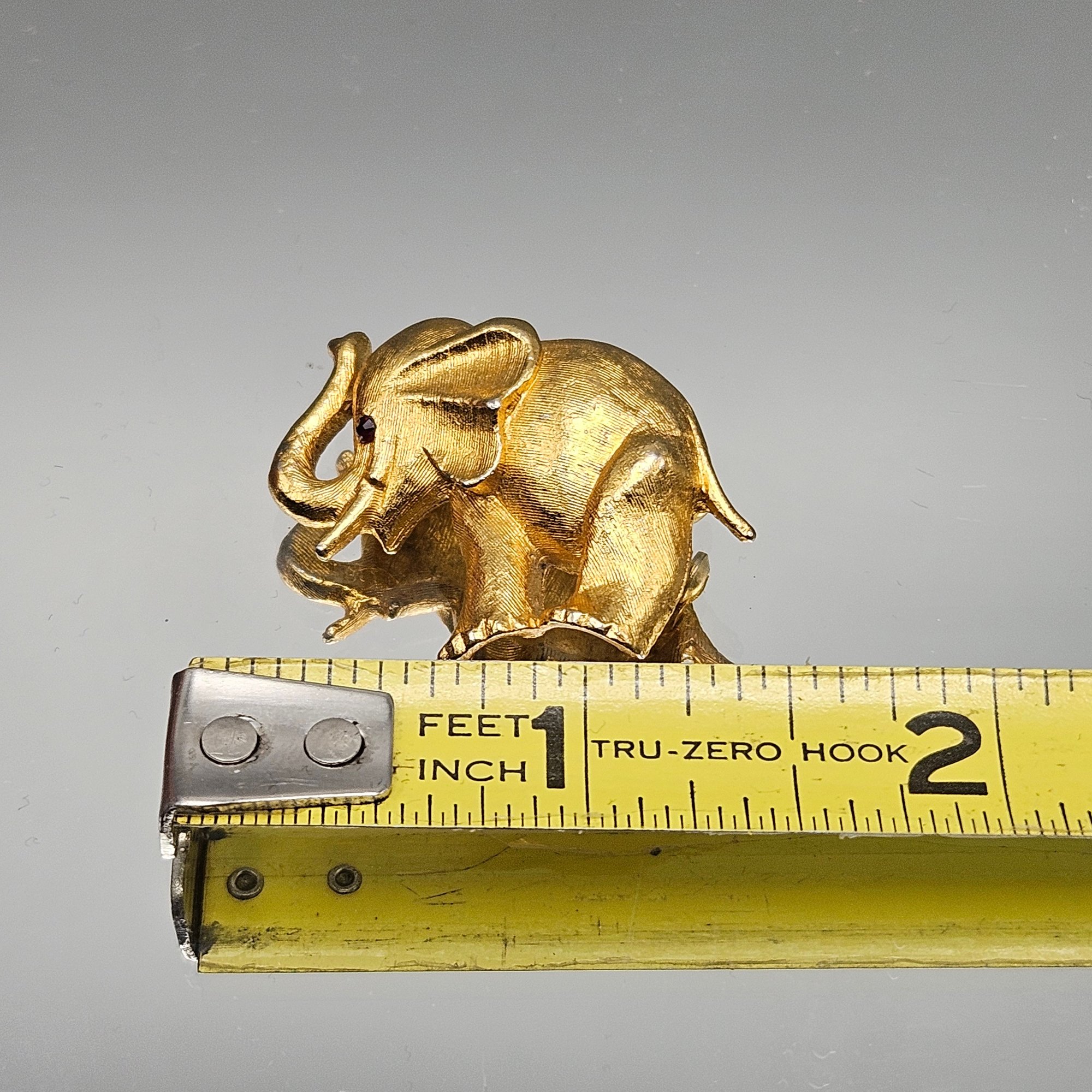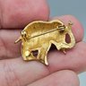 Charming vintage elephant brooch in a gold-tone finish with detailed texturing and raised design. Features a secure pin back and classic mid-century style—perfect for animal lovers or vintage jewelry collectors.