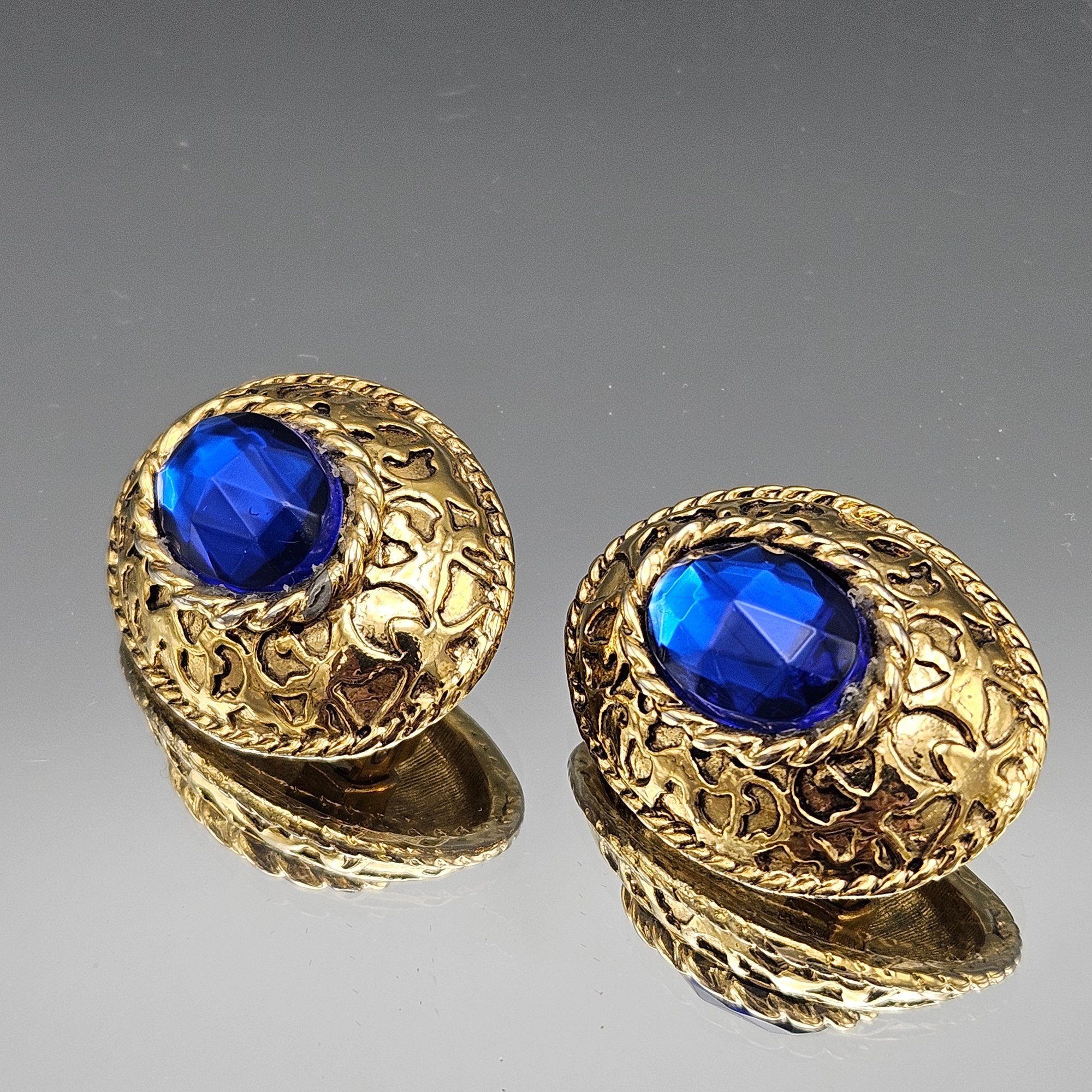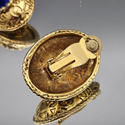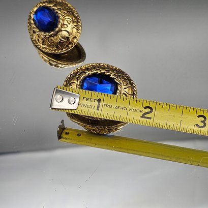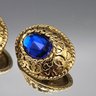 Vintage Gold-Tone Ornate Clip-On Statement Earrings With Blue Stone