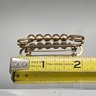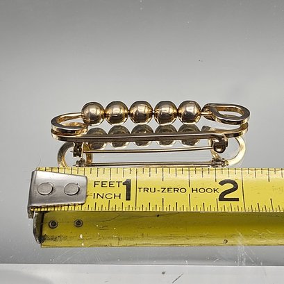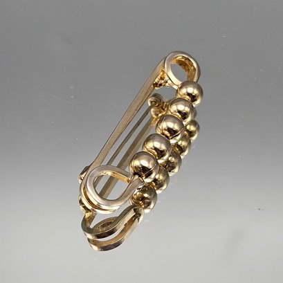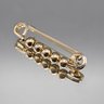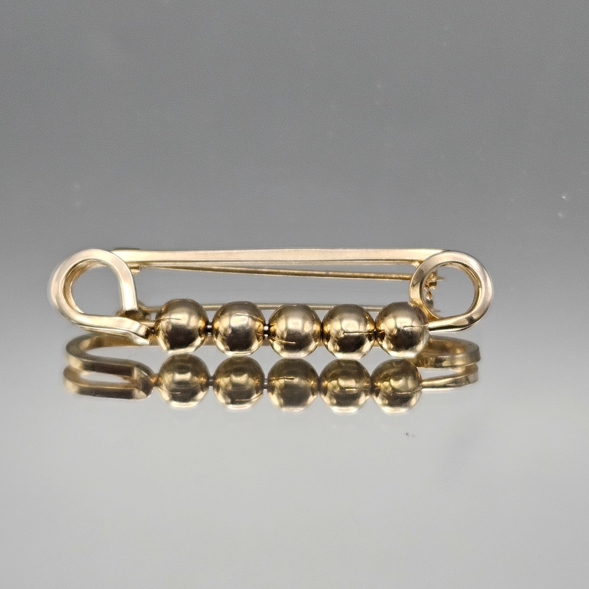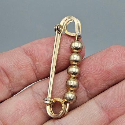 This classic gold-tone safety pin brooch measures approximately 1.5 inches long and features five highly polished, metallic spherical beads for a minimalist, vintage-inspired look.
