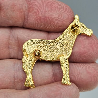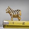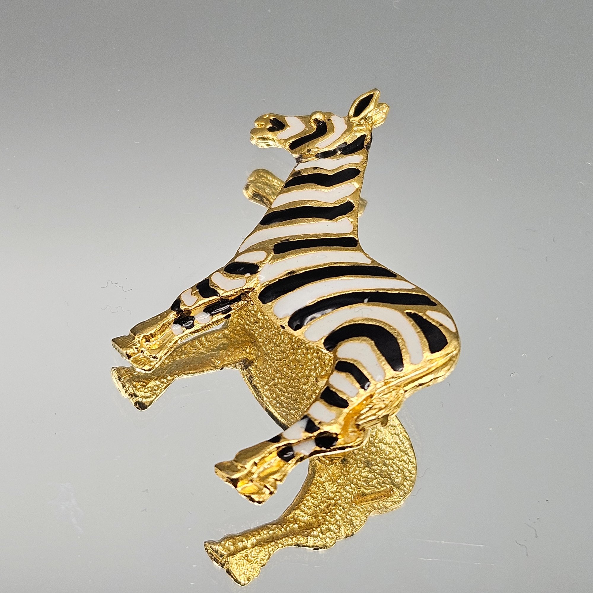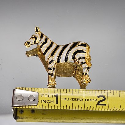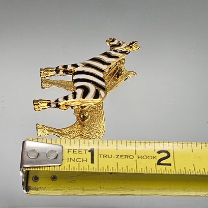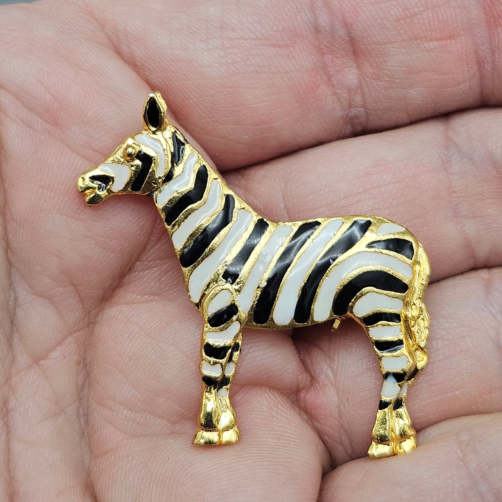 Striking vintage zebra brooch in gold-tone metal with glossy black and white enamel striping. Detailed figural design with secure pin back—perfect for animal lovers or statement jewelry collectors.