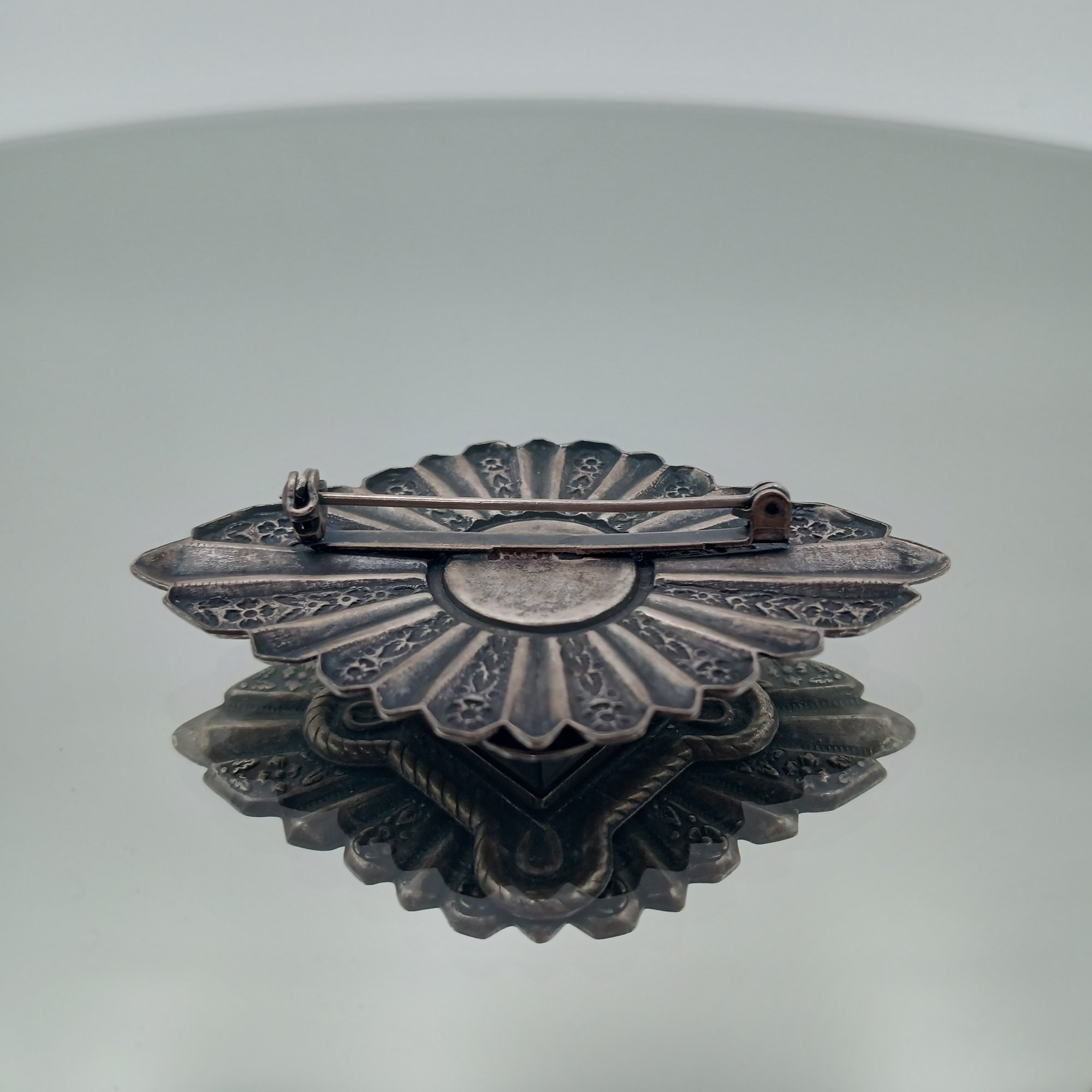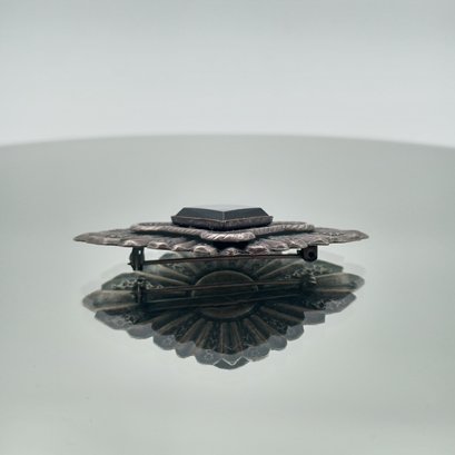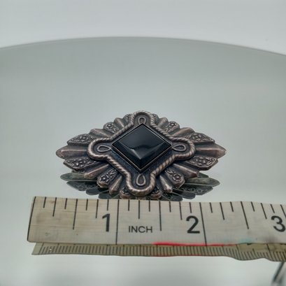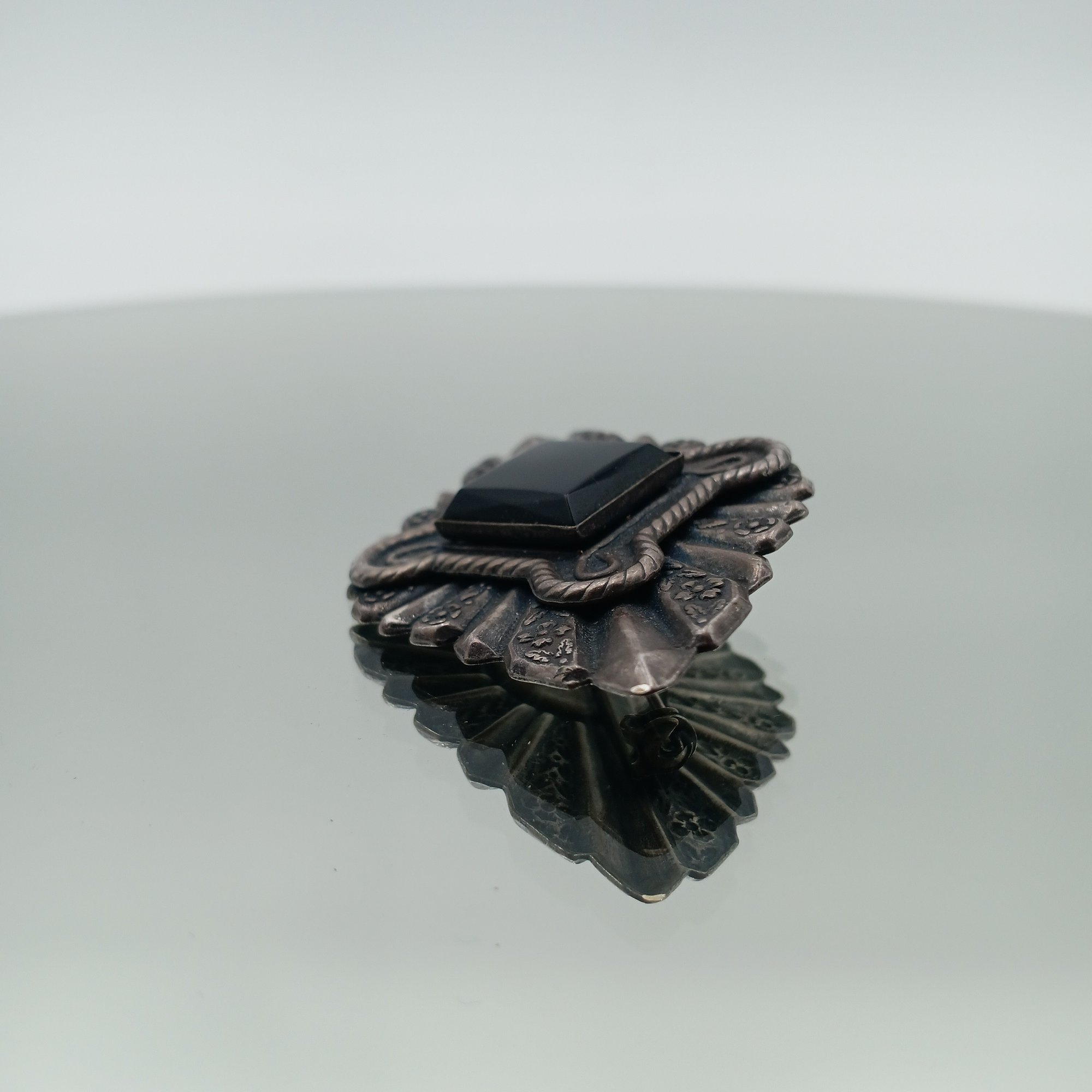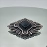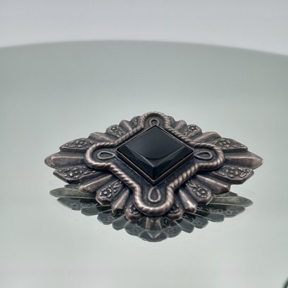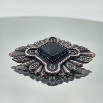 This ornate, Victorian-inspired brooch features a center-set, lozenge-shaped black stone framed by intricate rope detailing and a sunburst of floral-etched silver-tone petals