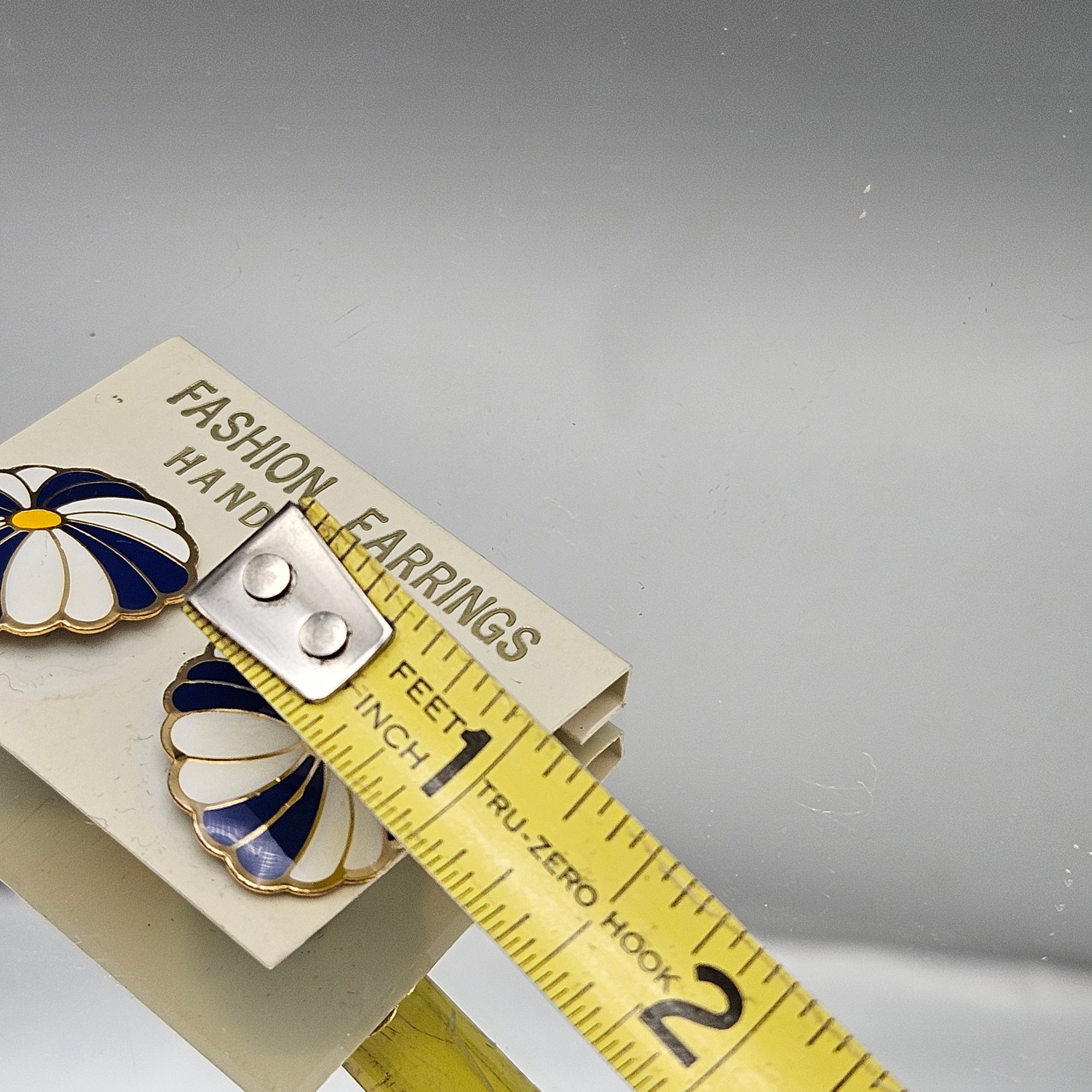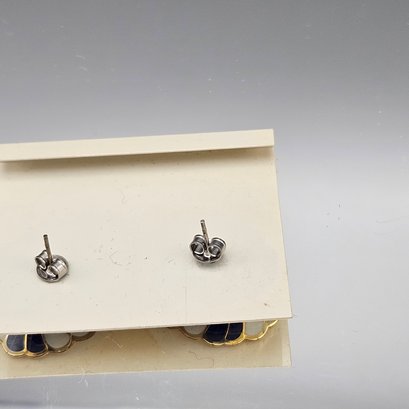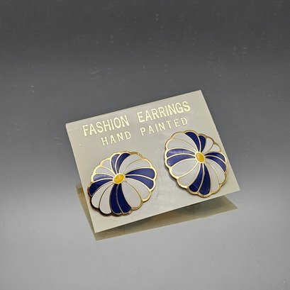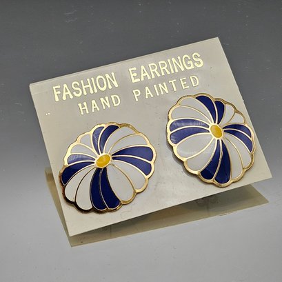 Vintage Hand-Painted Blue & White Enamel Floral Stud Earrings