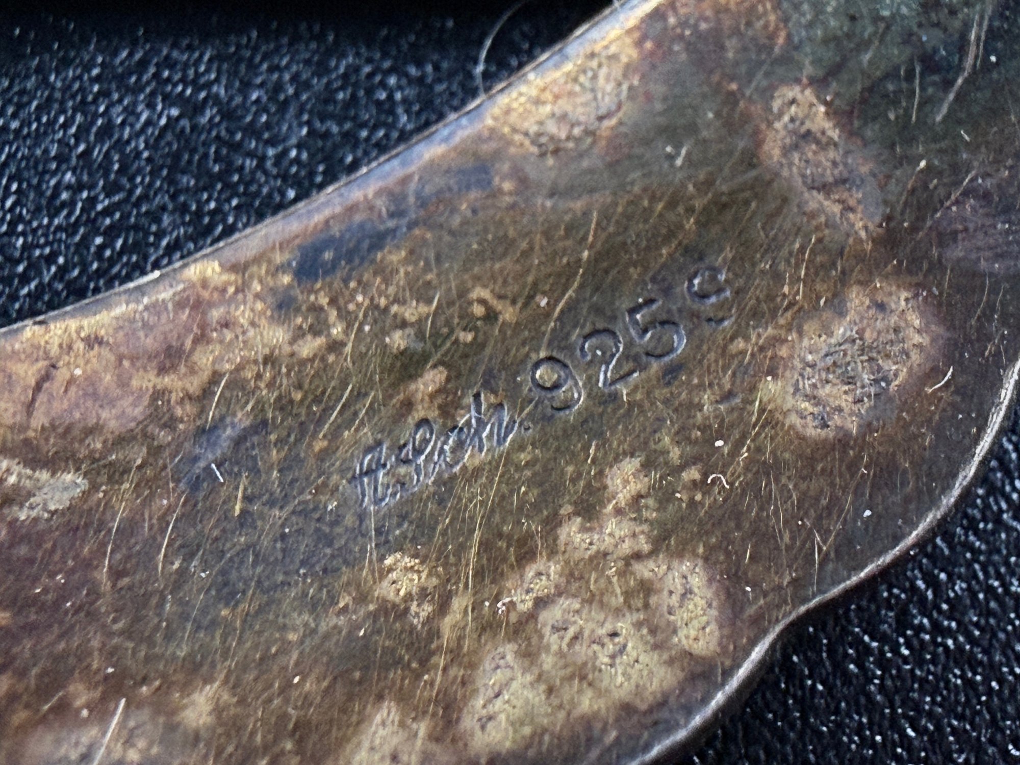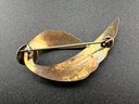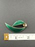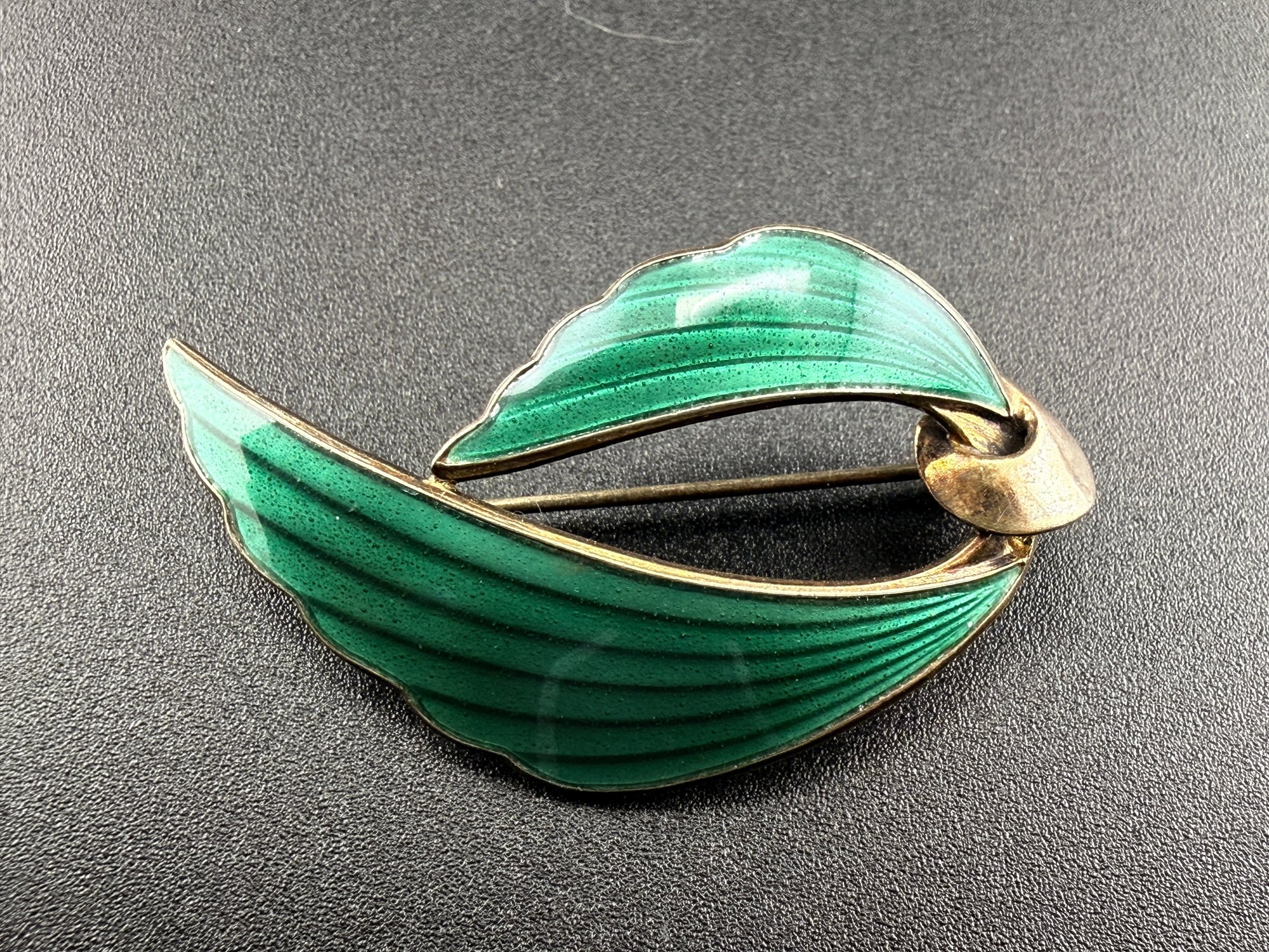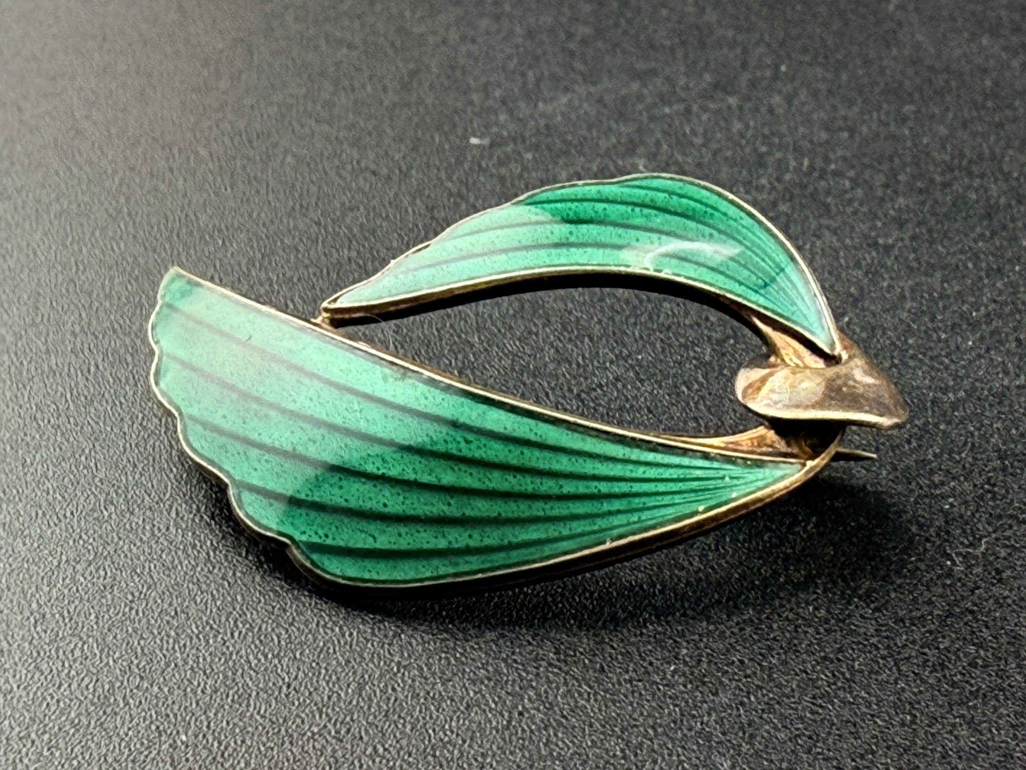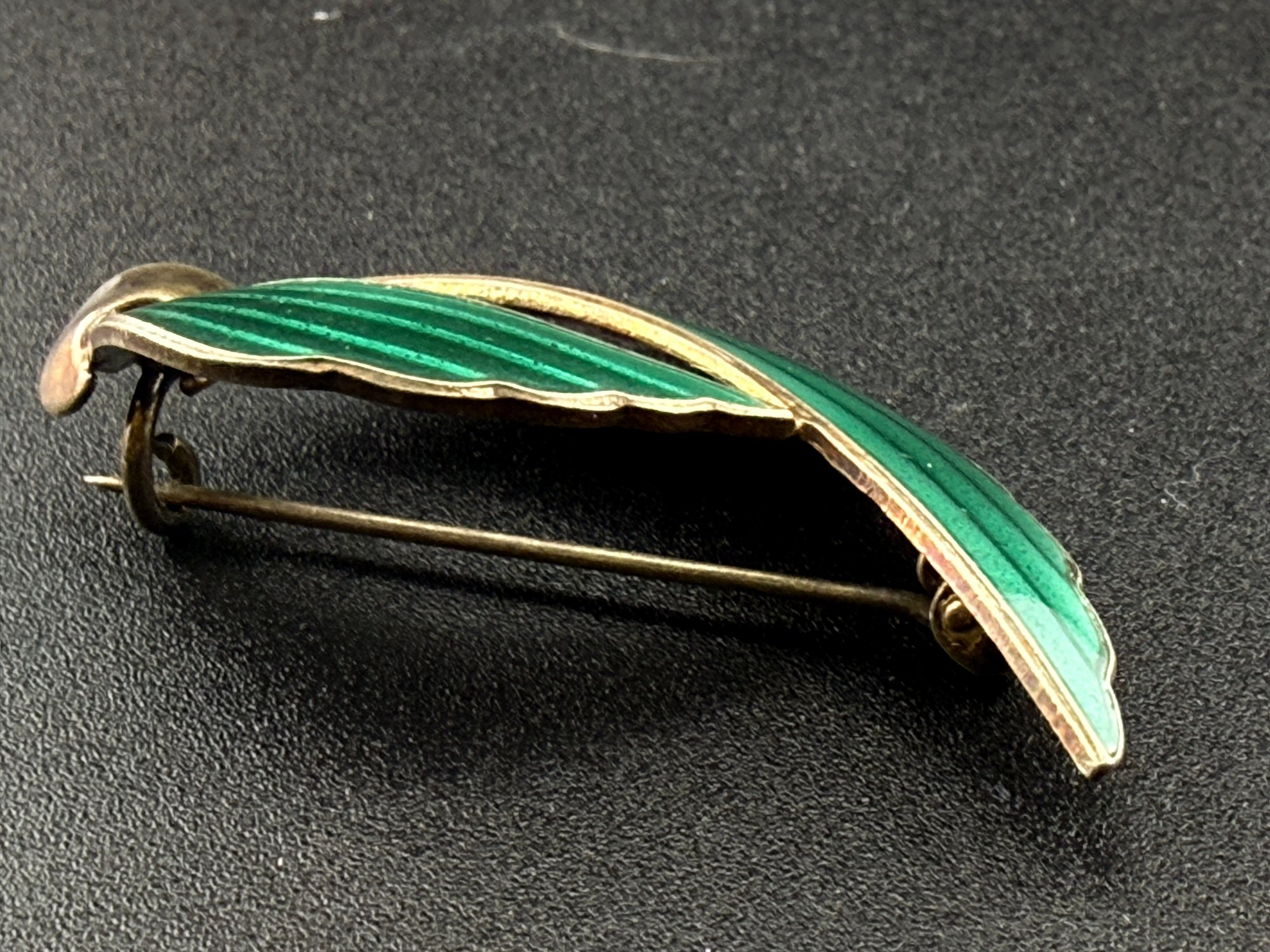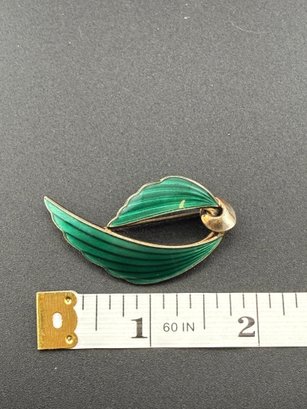 Vintage Hans Christian Schullin Style Green Guilloché Enamel & 925 Sterling Silver Leaf Brooch