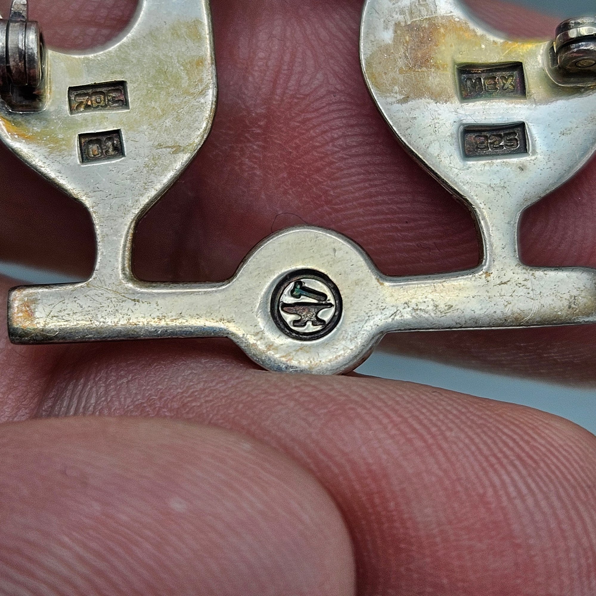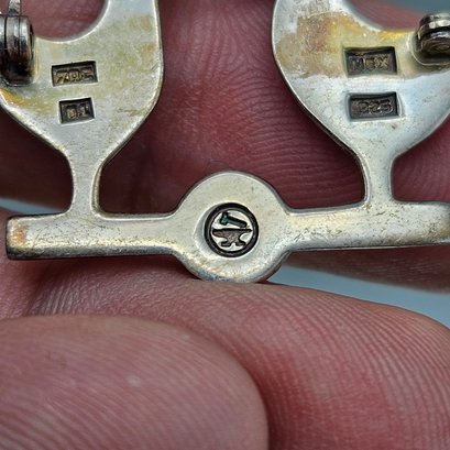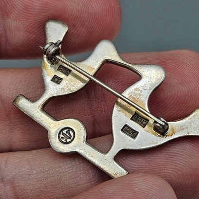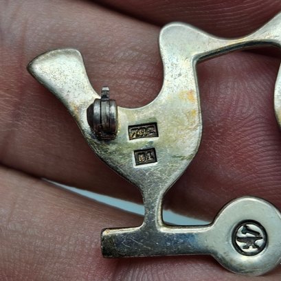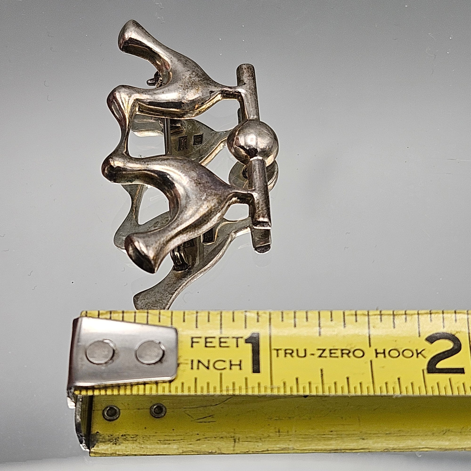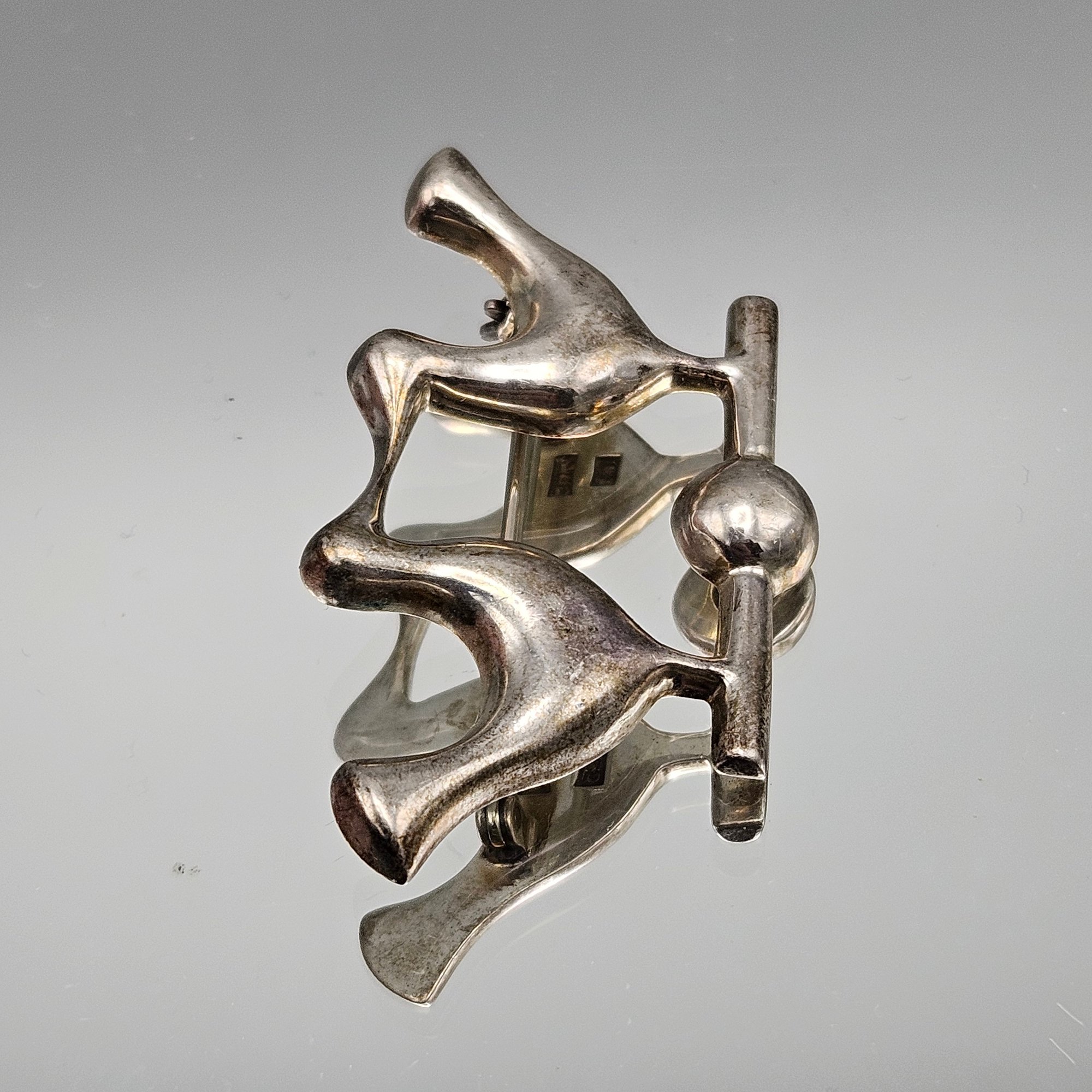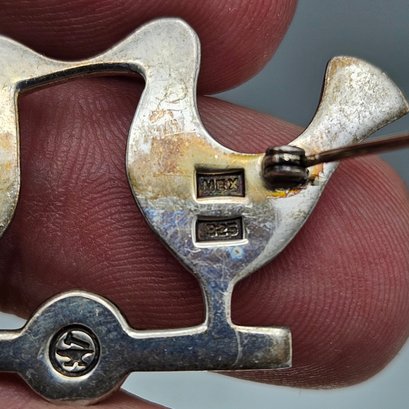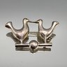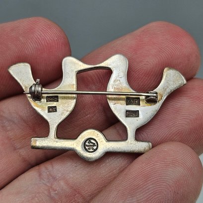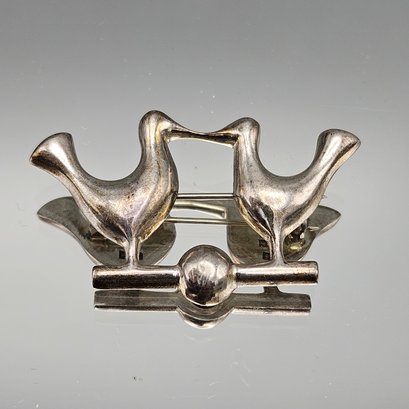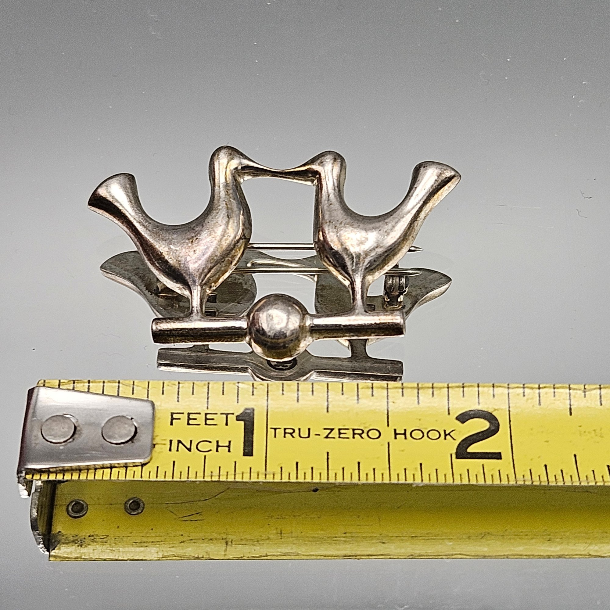 Vintage Mexican 925 sterling silver brooch featuring two stylized love birds in a modernist design. Marked MEX 925 on back. Solid, well-made piece measuring approx. 1.75 inches wide. A charming collectible pin with timeless appeal.