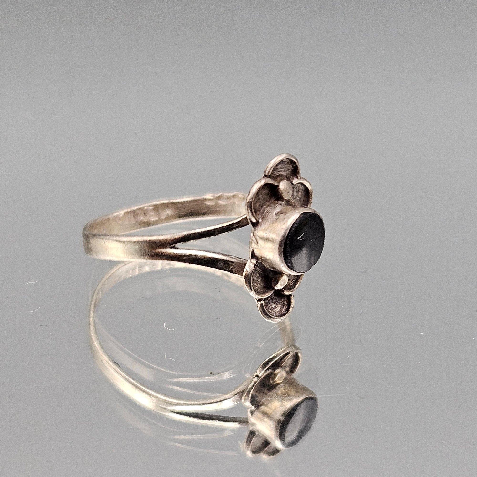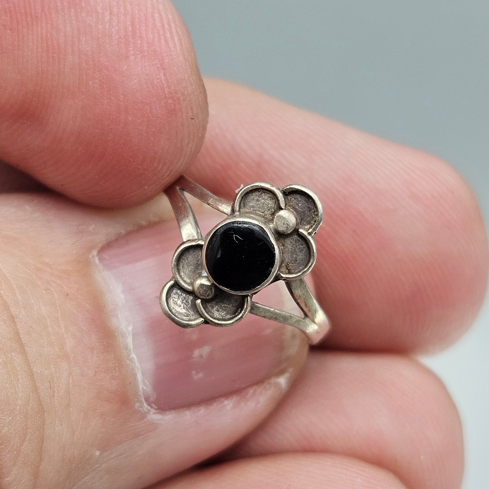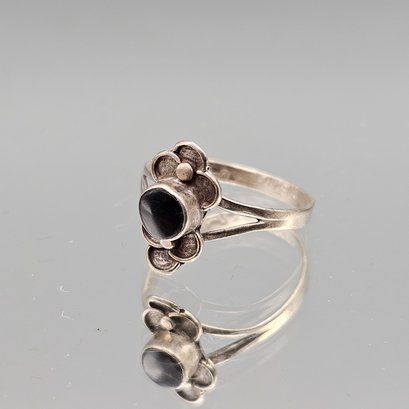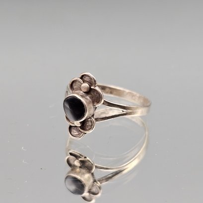 This charming vintage ring features a stylized floral setting centered with a round, polished black onyx cabochon. Handcrafted in Mexico, the sterling silver piece is designed with delicate scalloped petals and a split-shoulder shank that tapers into a size 4.75 band