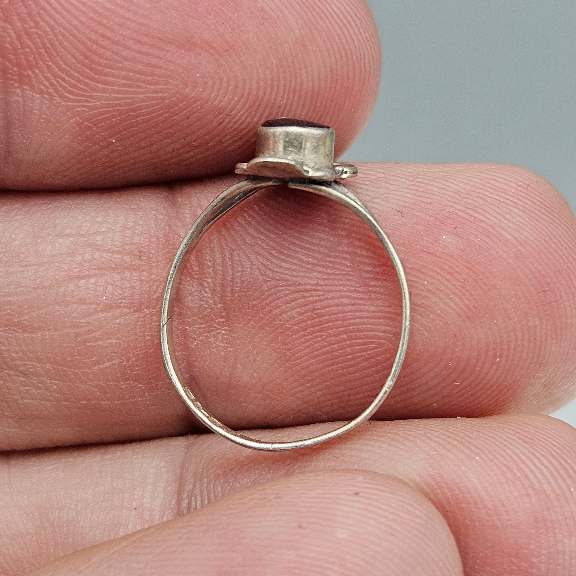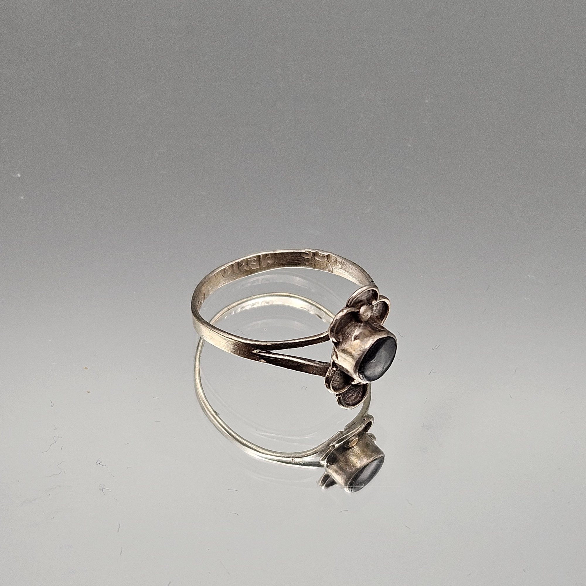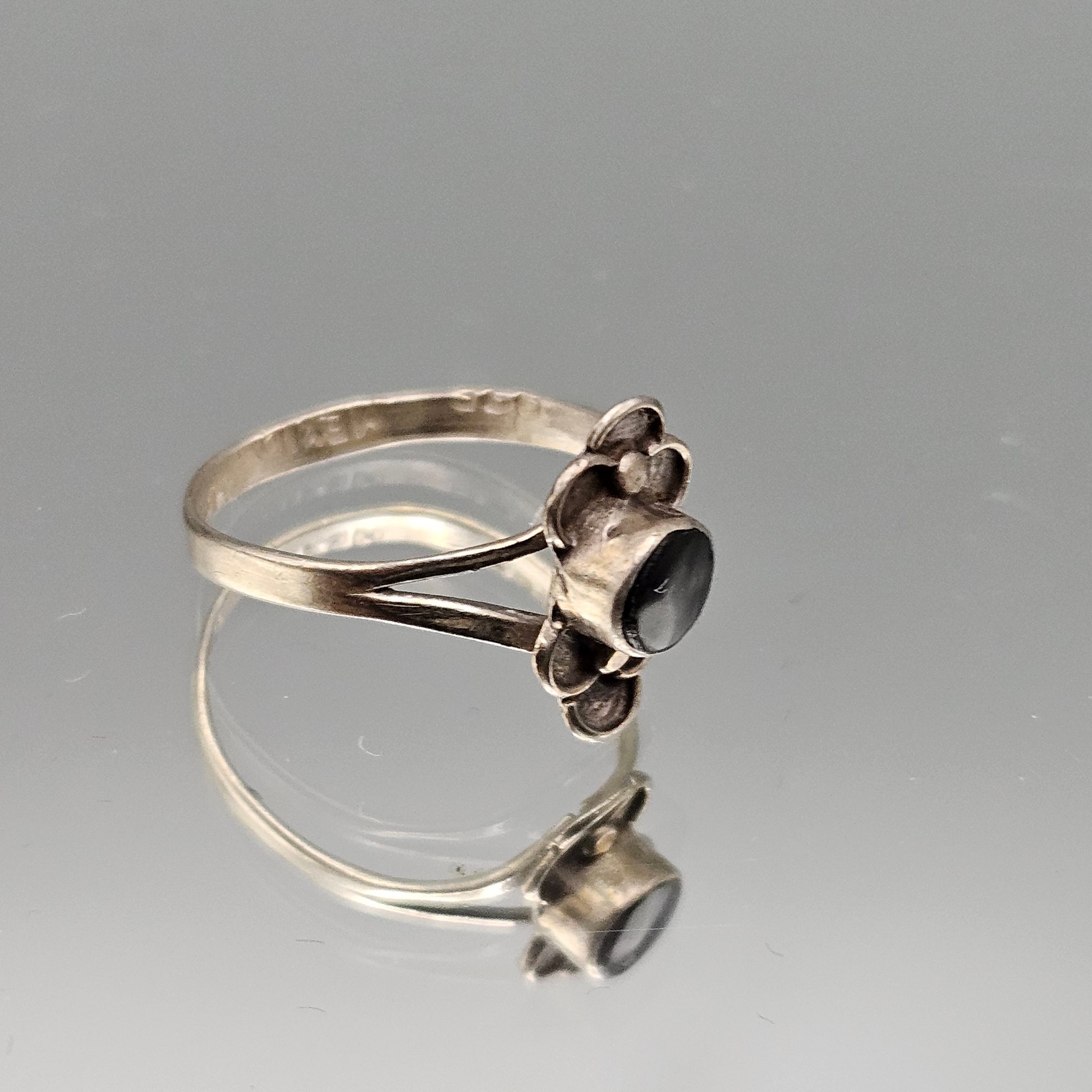 This charming vintage ring features a stylized floral setting centered with a round, polished black onyx cabochon. Handcrafted in Mexico, the sterling silver piece is designed with delicate scalloped petals and a split-shoulder shank that tapers into a size 4.75 band