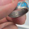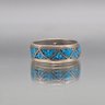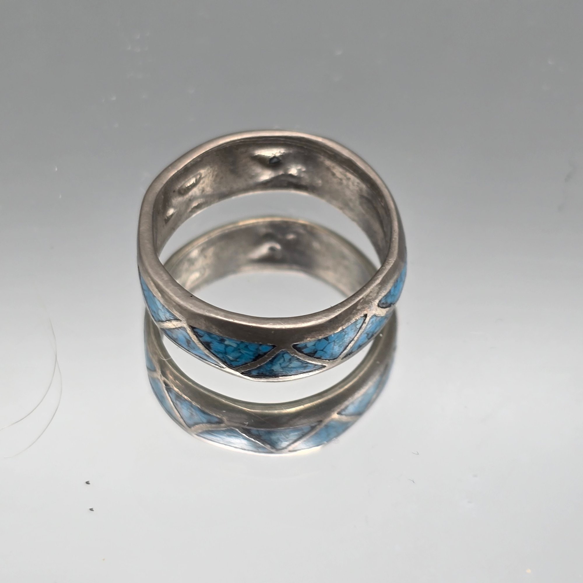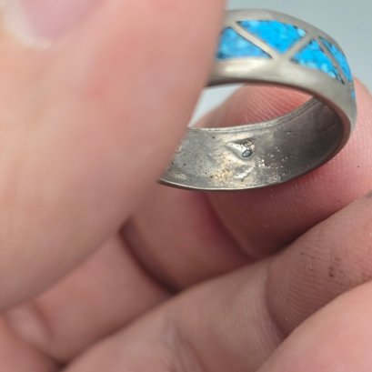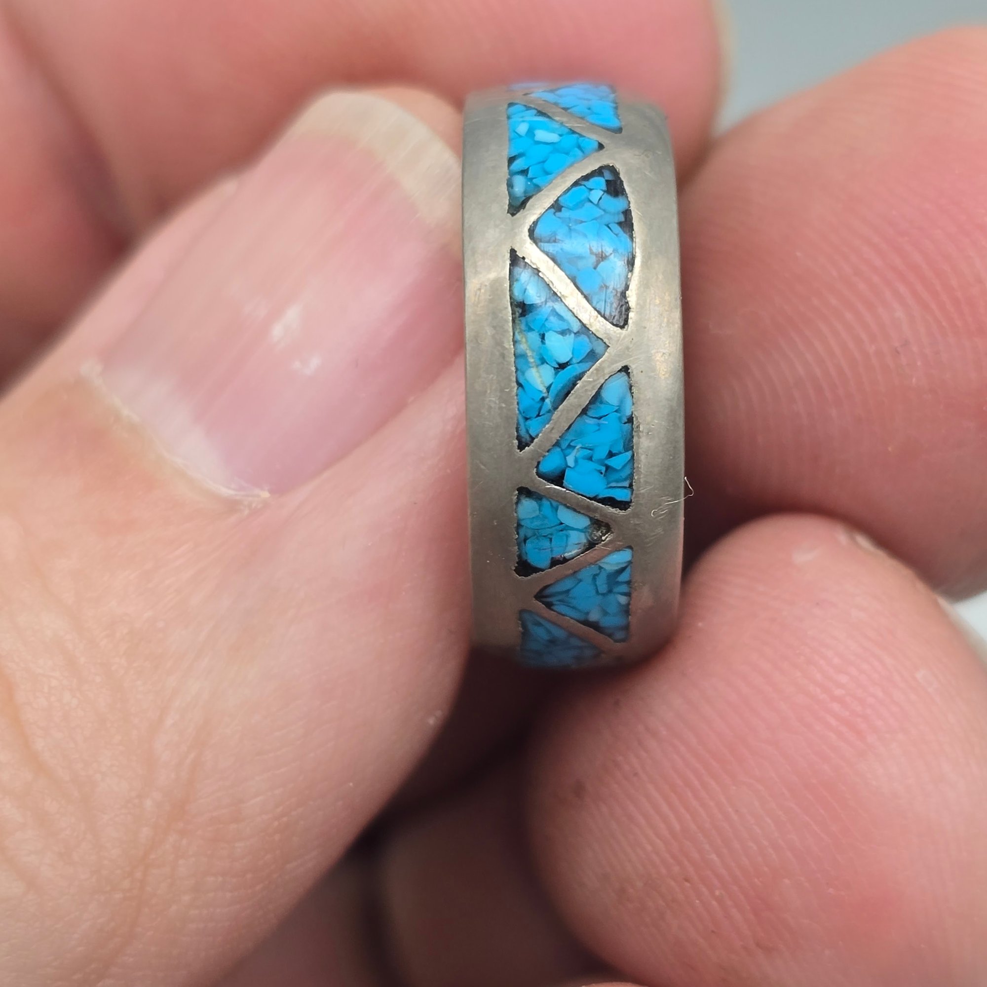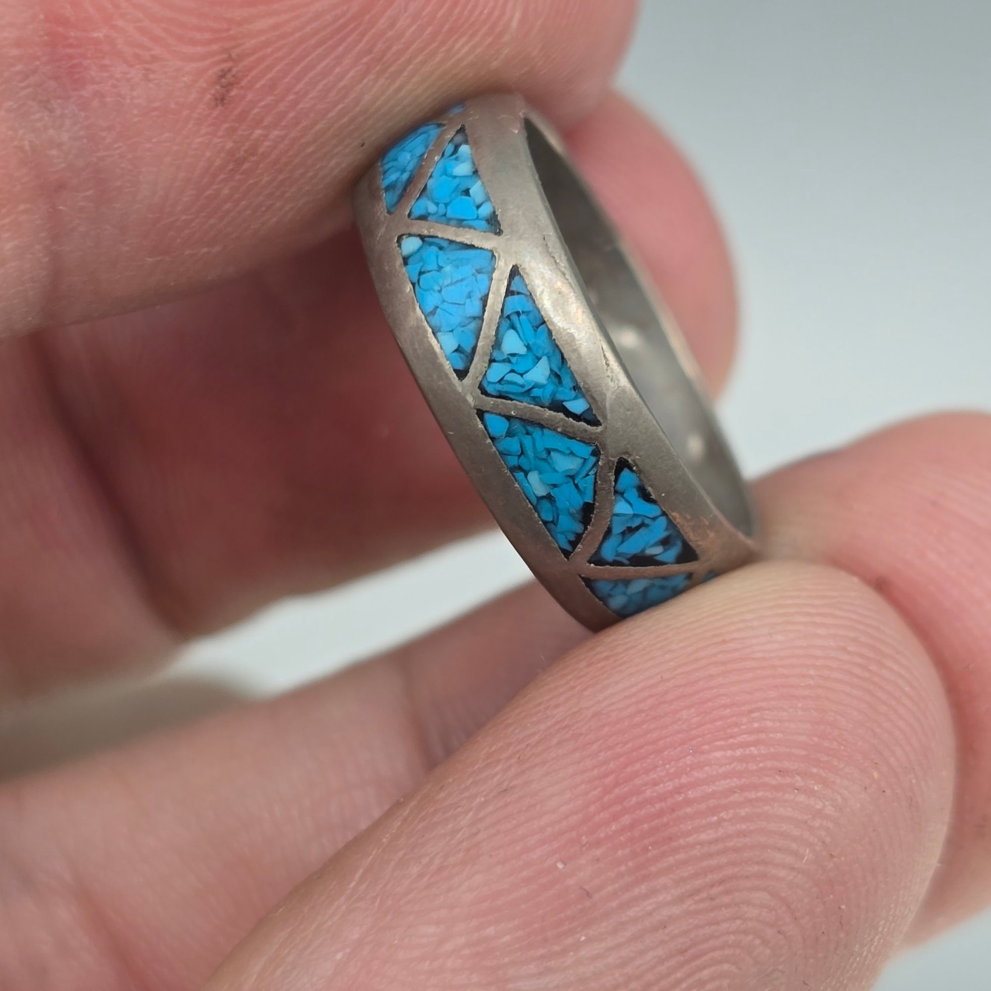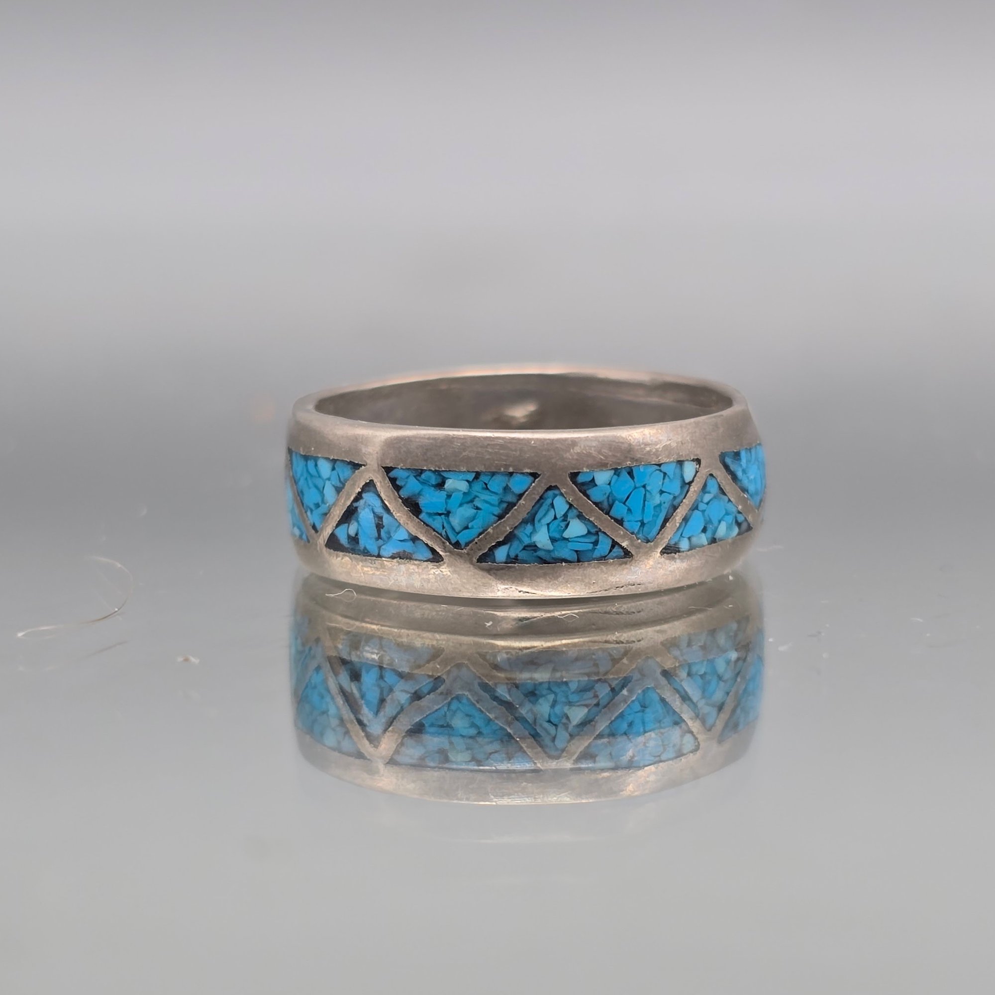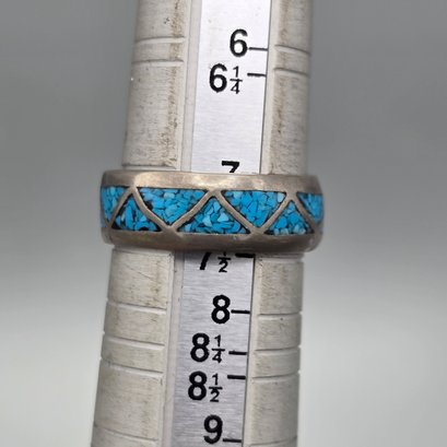 This handcrafted ring features a geometric triangle pattern filled with vibrant crushed turquoise chip inlay set into a durable silver-tone band