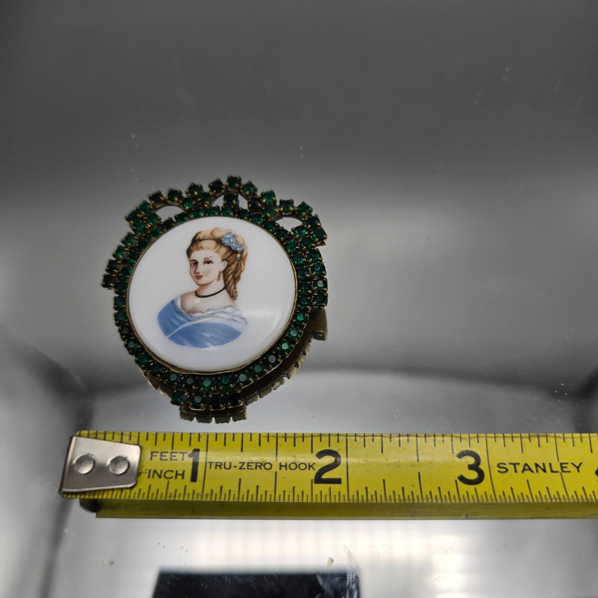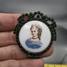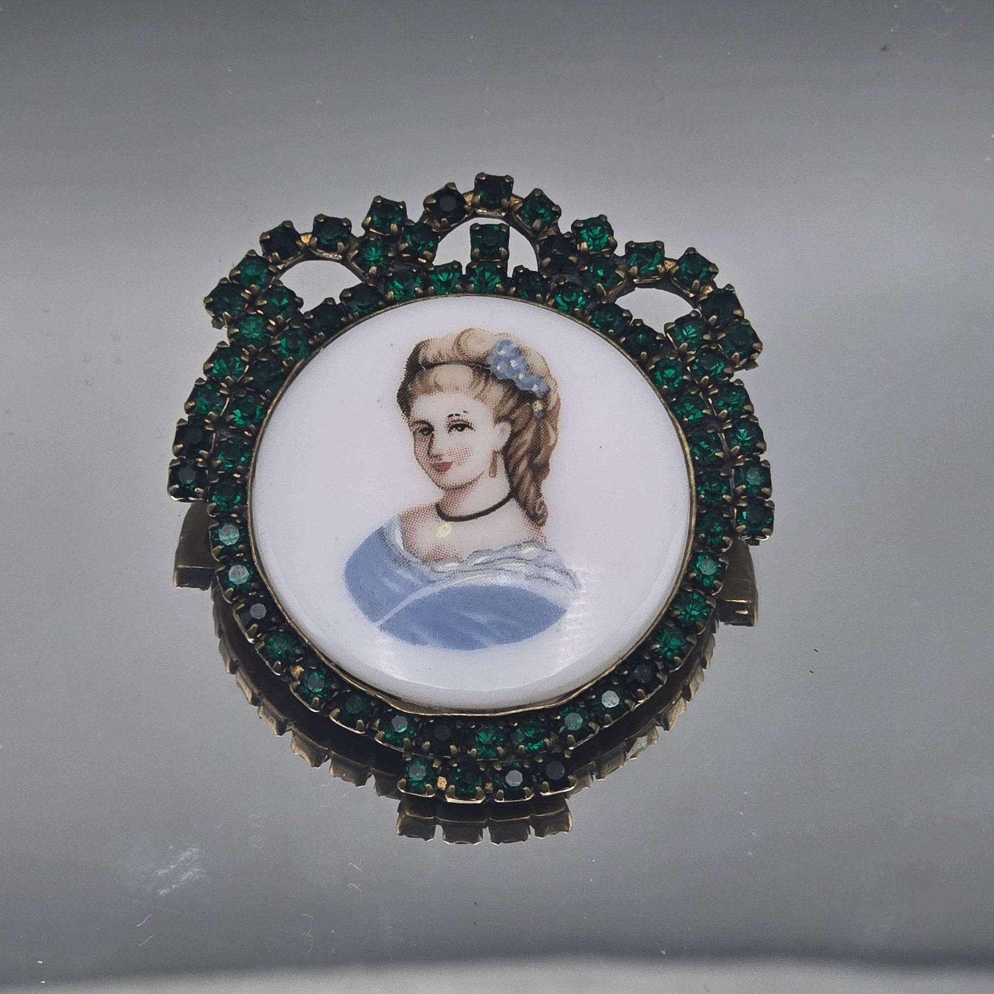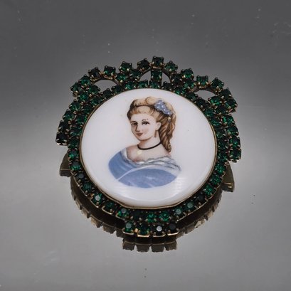 Vintage round portrait cameo brooch featuring a hand-painted style lady bust set against a white ground, surrounded by an ornate emerald green rhinestone halo. Gold-tone metal setting with classic pin-back closure, measuring approximately 2 inches, perfect for Victorian or romantic-inspired styling