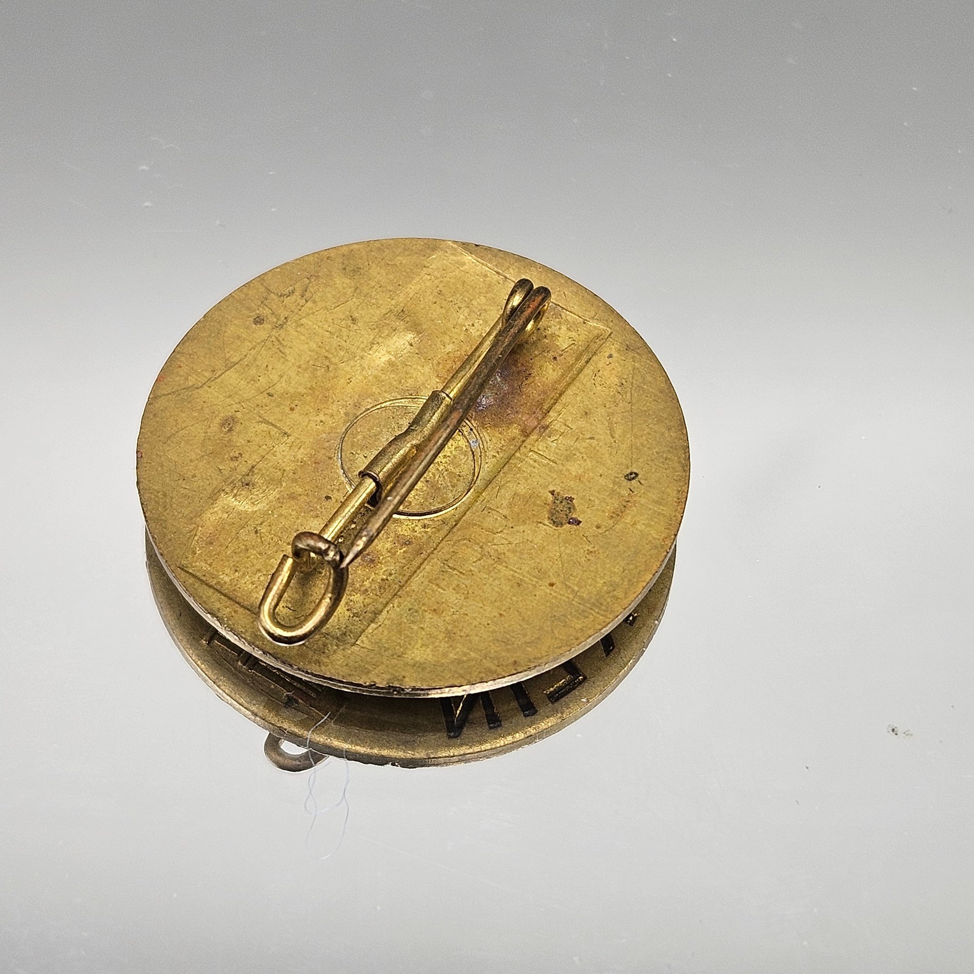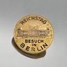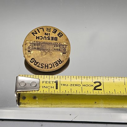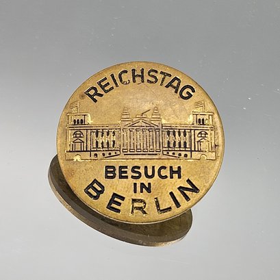 This is a small, brass-toned commemorative souvenir pin from Berlin featuring an engraving of the Reichstag building and the German phrase "Besuch in Berlin" (Visit in Berlin).