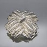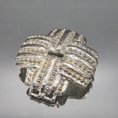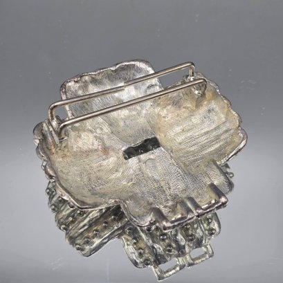 This vintage 1980s accessory features a classic bow design with a textured, silver-tone metal finish that exemplifies the bold aesthetic of that era