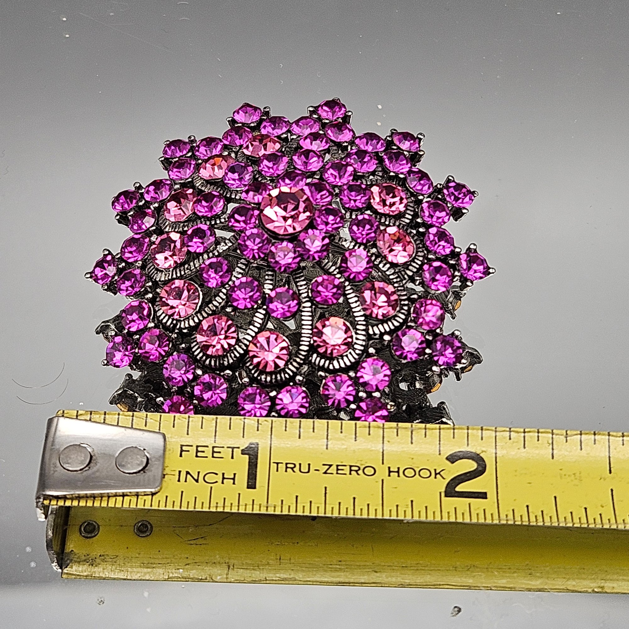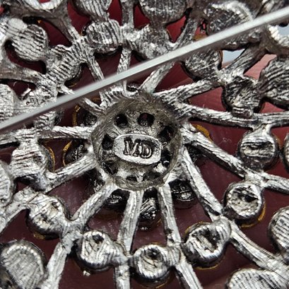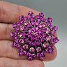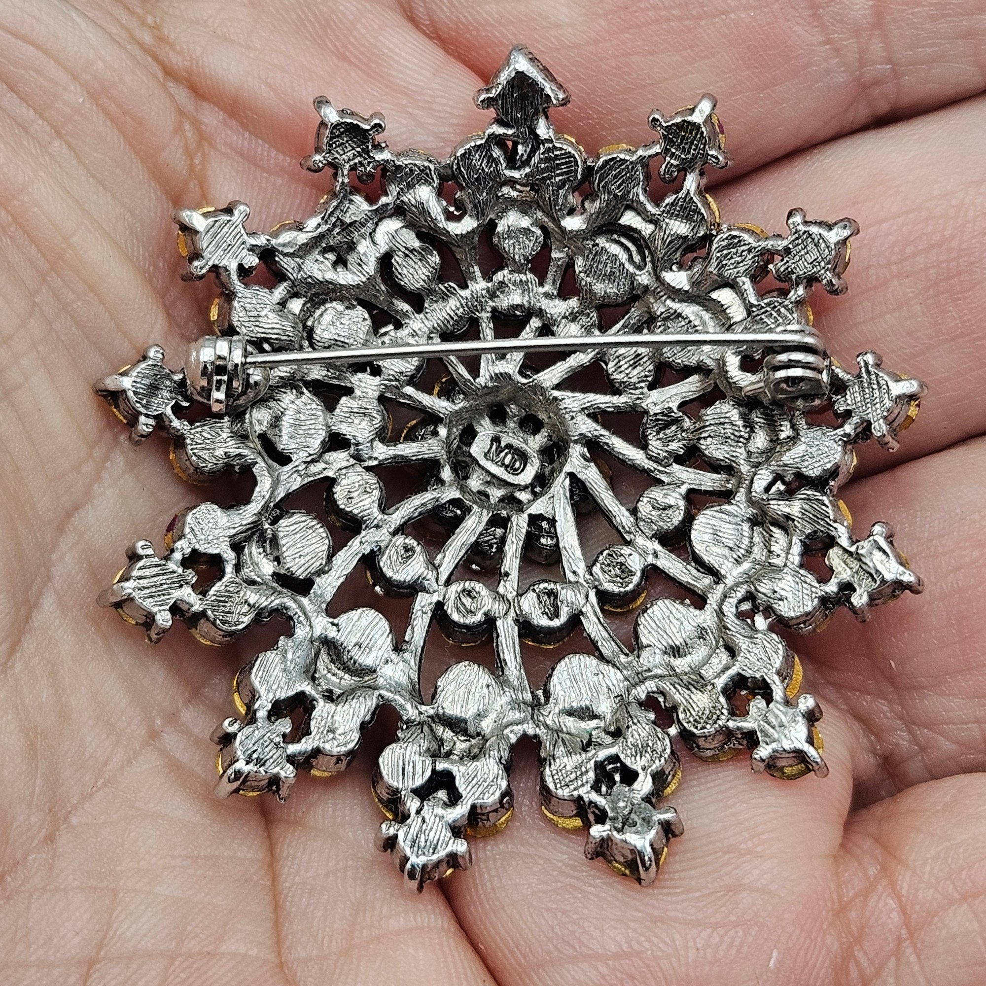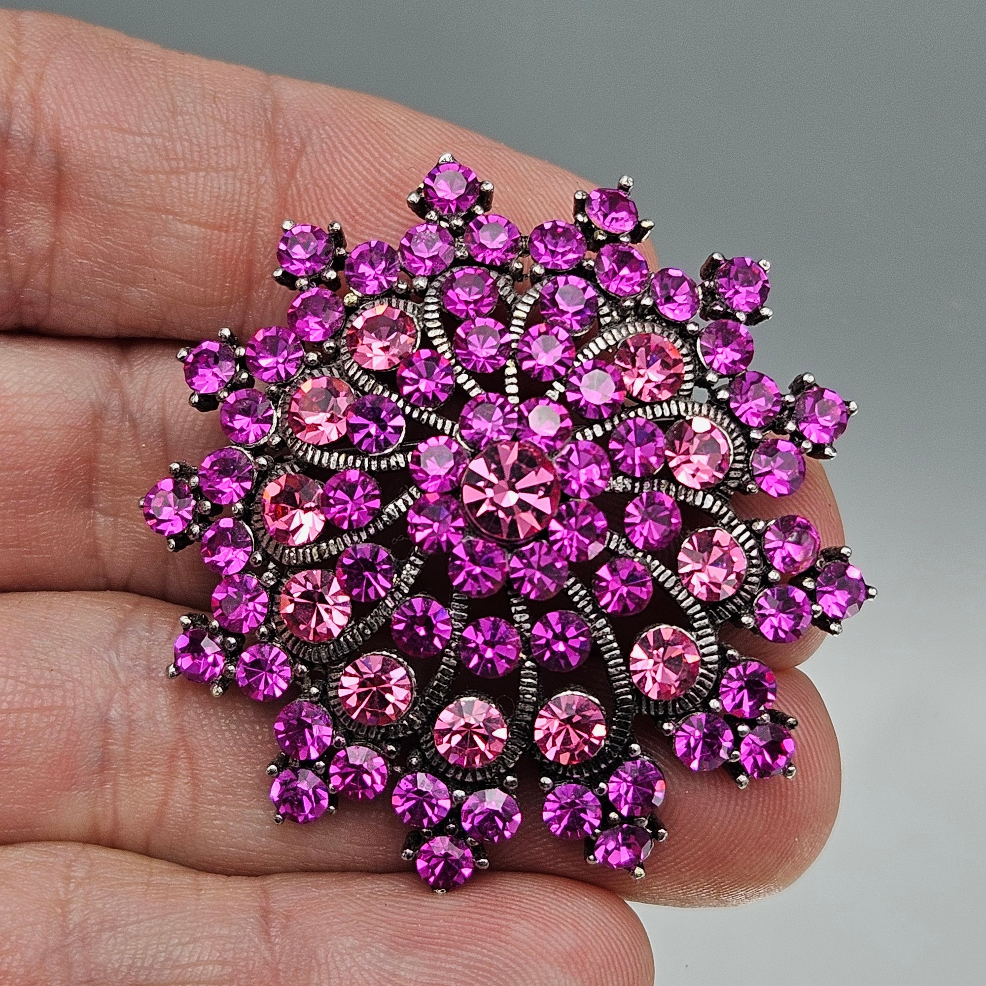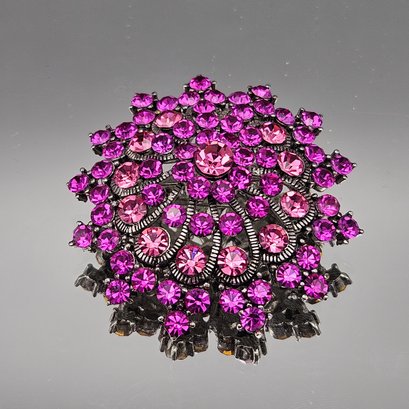 This striking starburst brooch showcases a vibrant array of fuchsia and light pink rhinestones set in an intricate, tiered silver-tone frame. The back features a secure pin closure and an "MD" maker's mark, with the piece measuring approximately 2 inches in diameter.