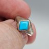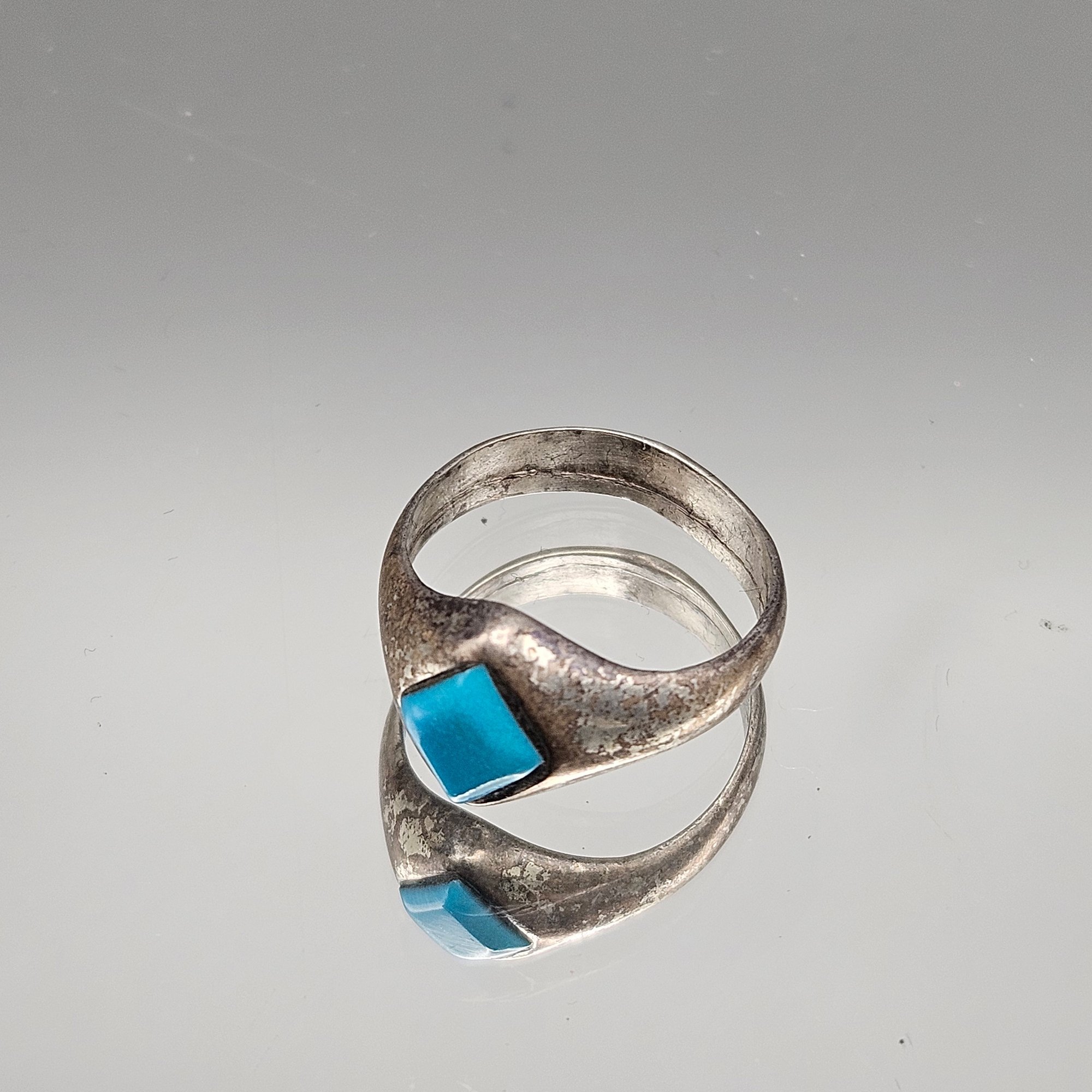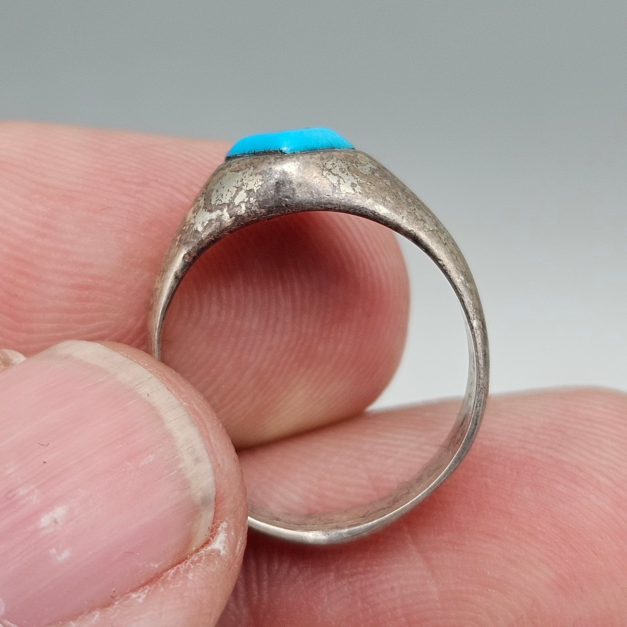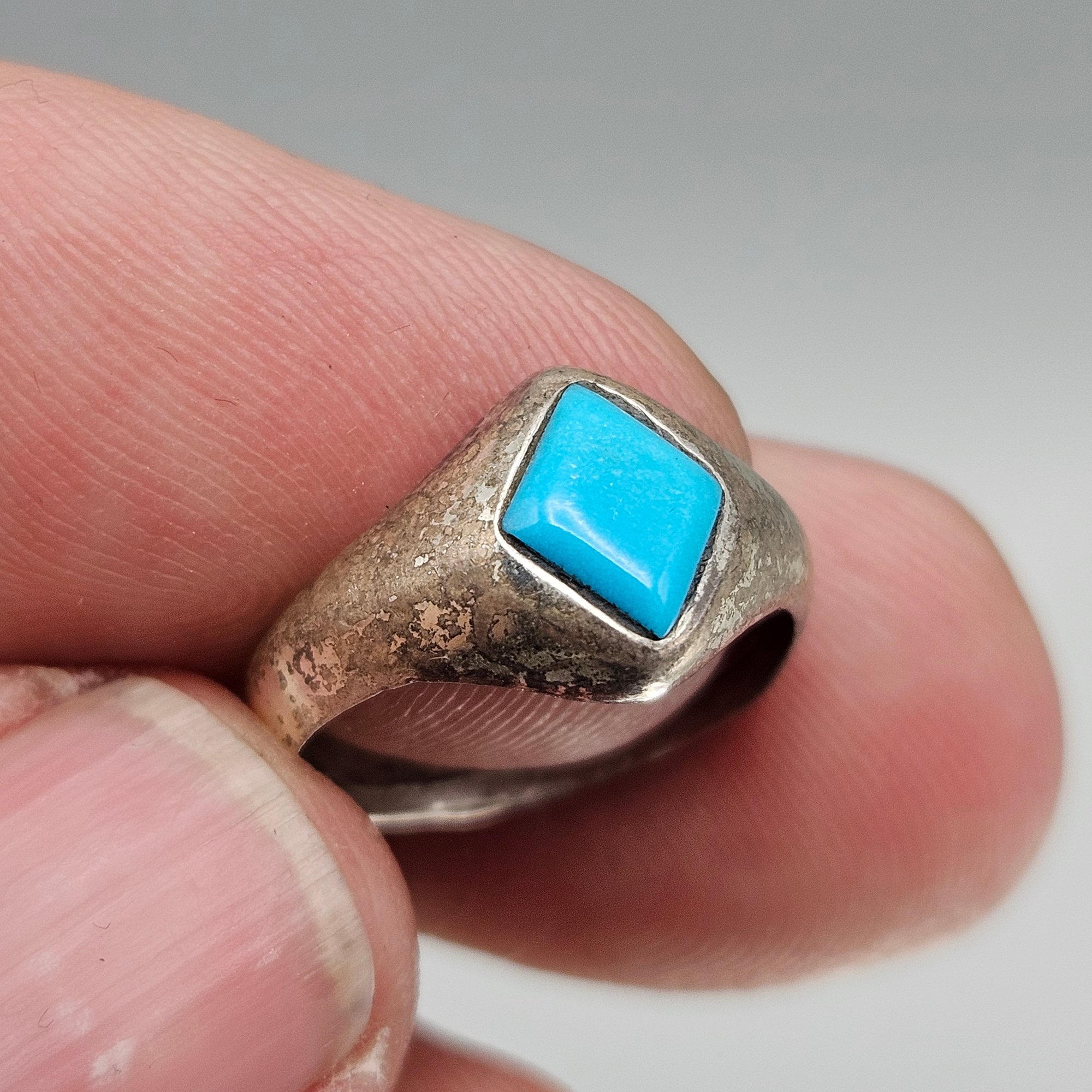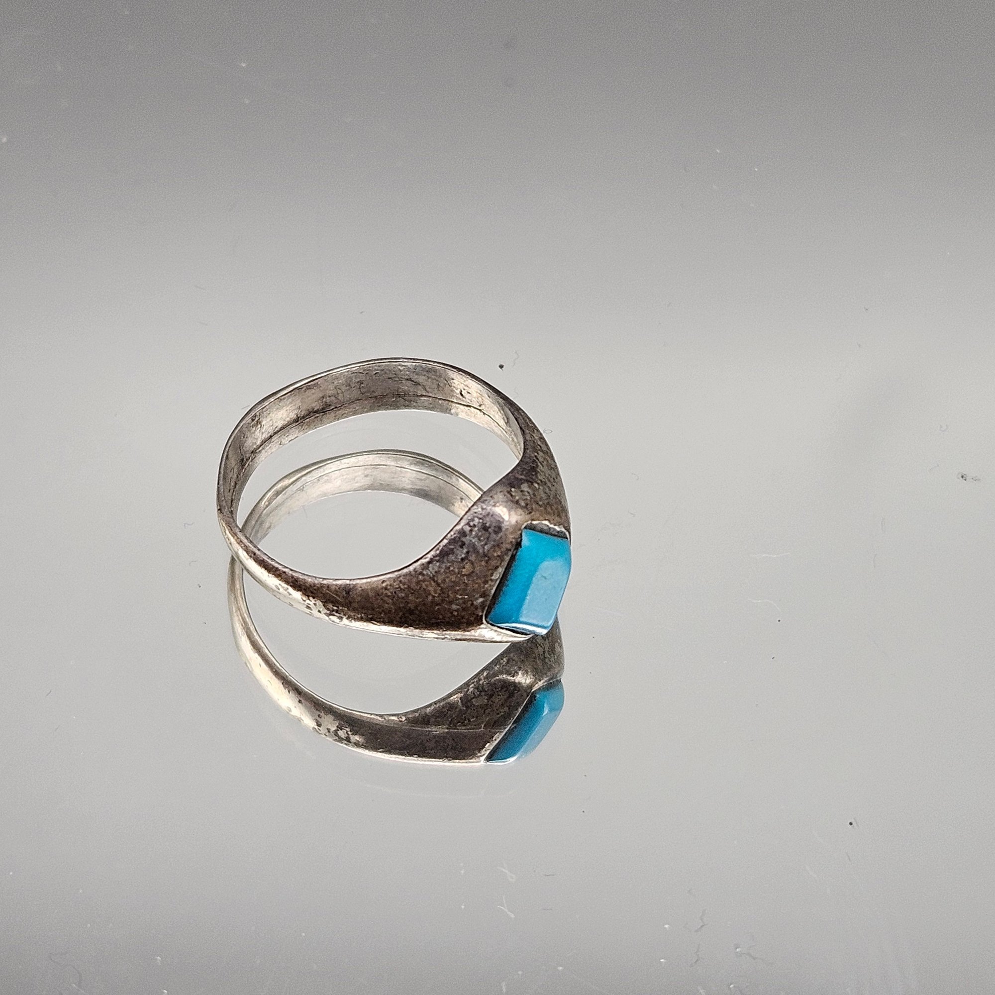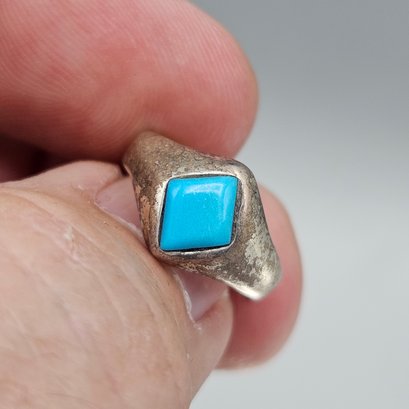 This vintage signet-style ring features a vibrant, diamond-cut turquoise stone set into a tapered band with a weathered, antique patina. It is a size 5.5