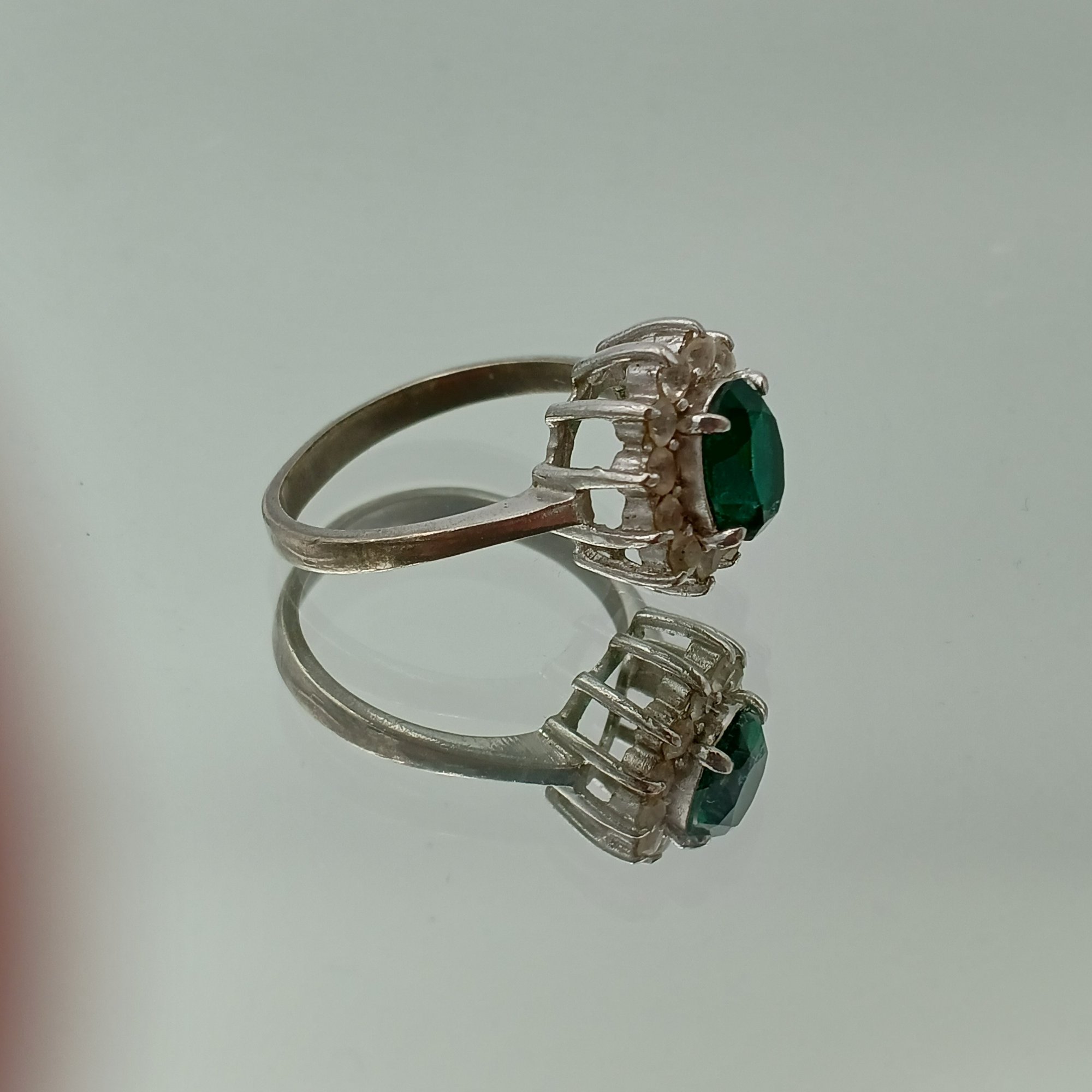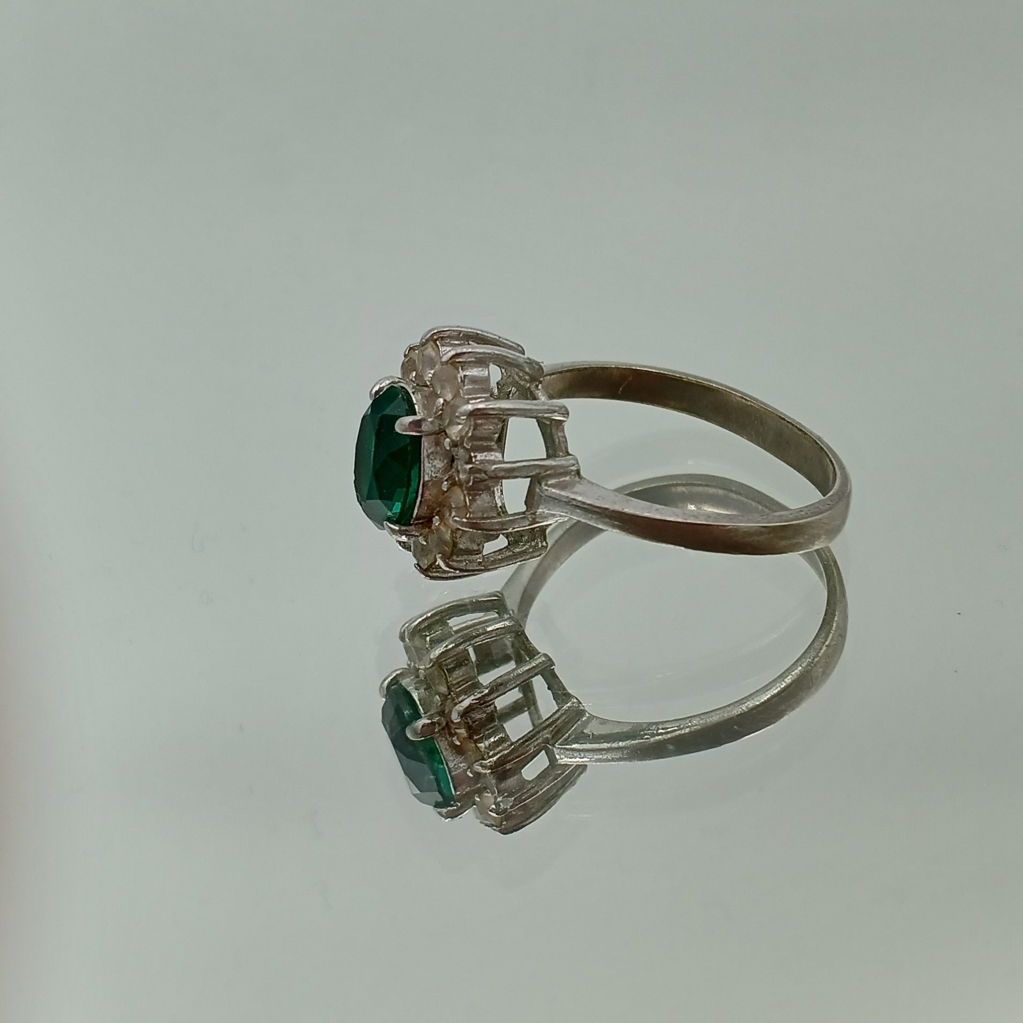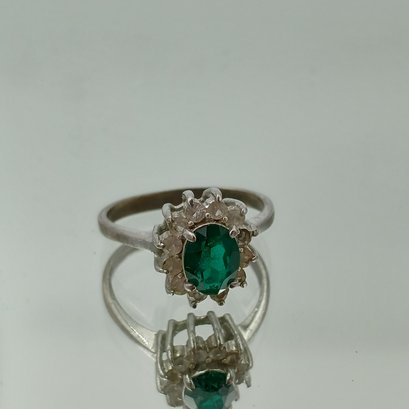 This elegant silver-tone cocktail ring features a vibrant oval-cut emerald green center stone surrounded by a halo of clear accents