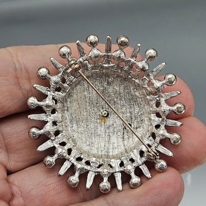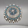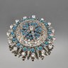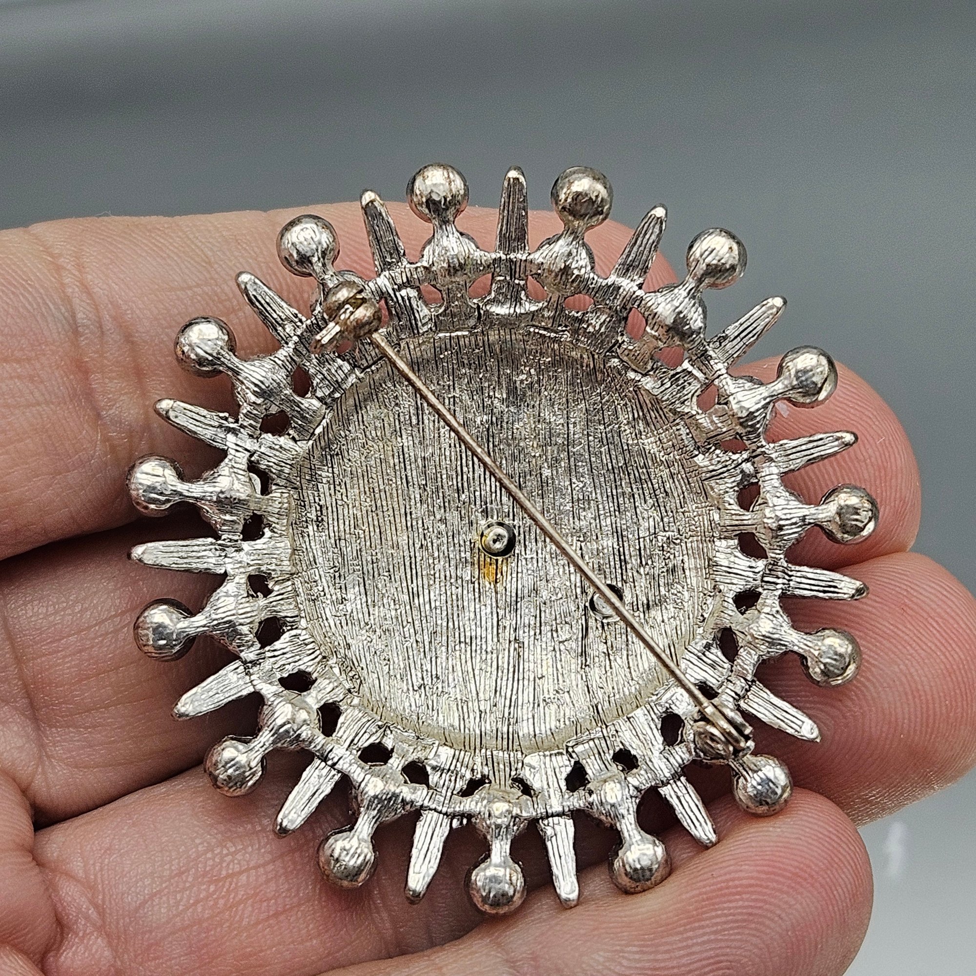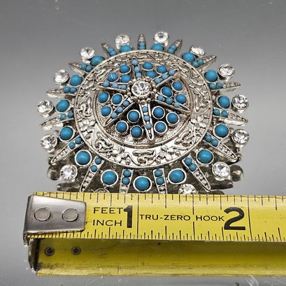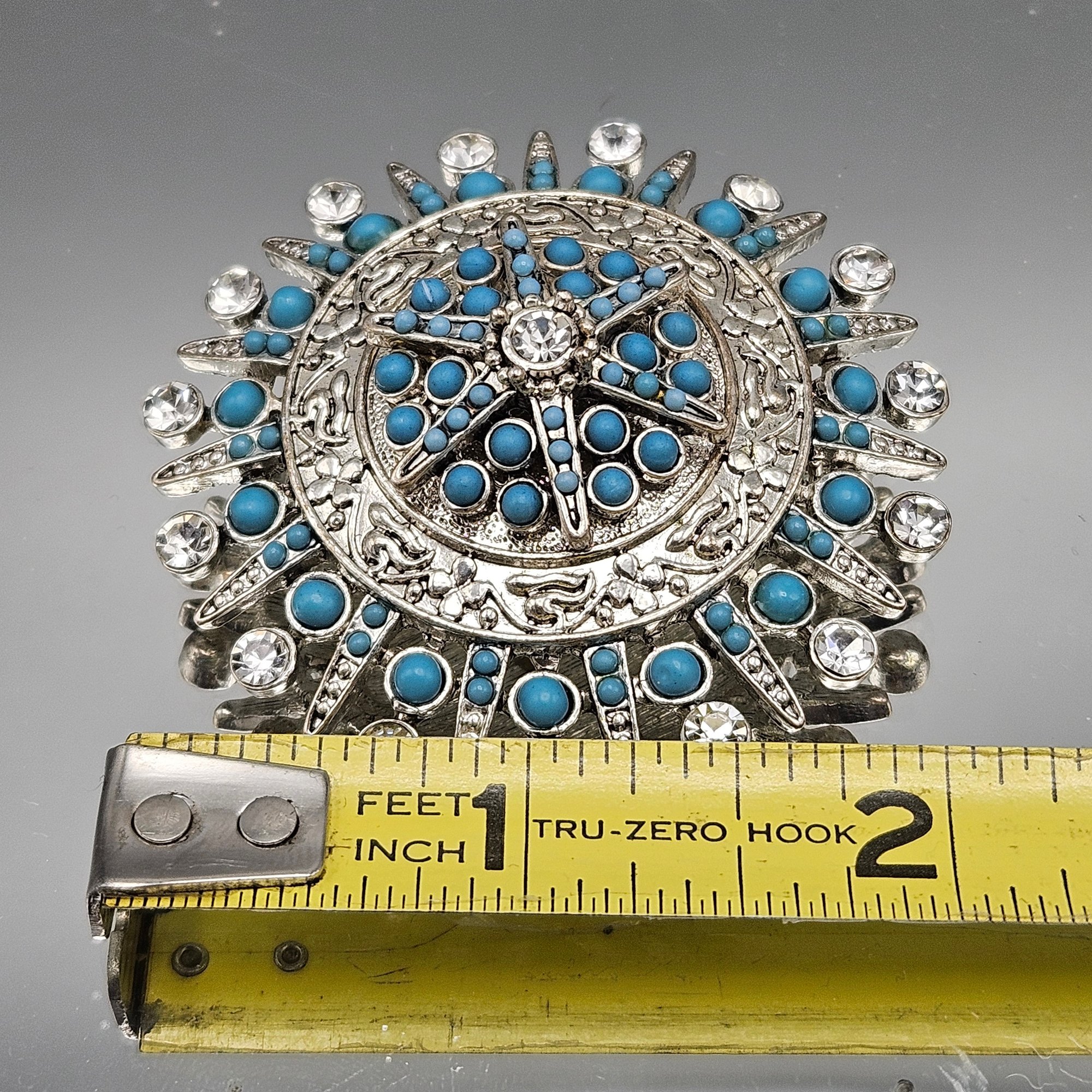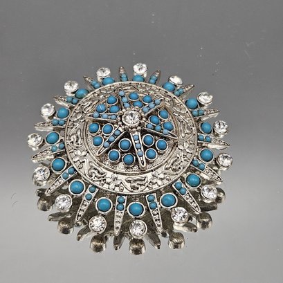 Striking vintage silver-tone brooch featuring an ornate sunburst medallion design accented with turquoise cabochons and sparkling clear rhinestones. Measuring approximately 2 inches, this bold statement piece showcases detailed metalwork and classic mid-century style.