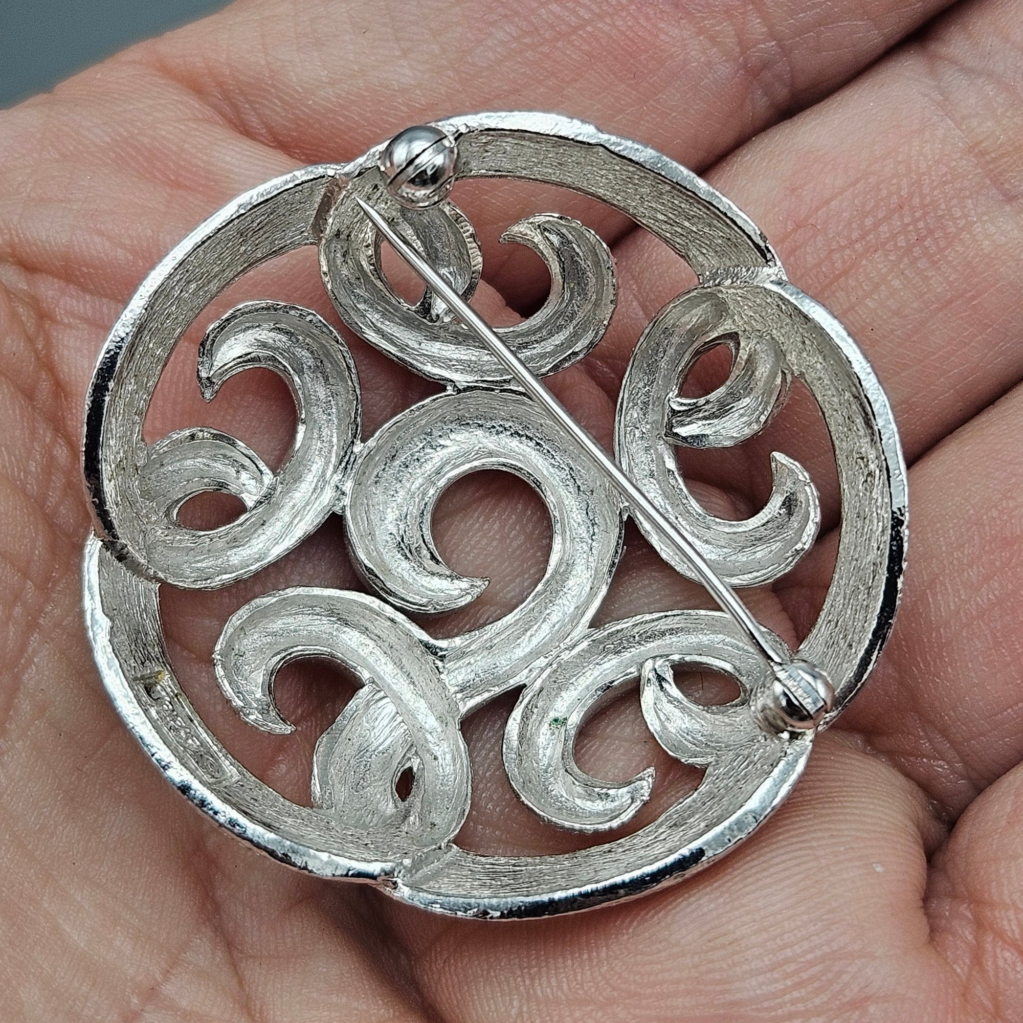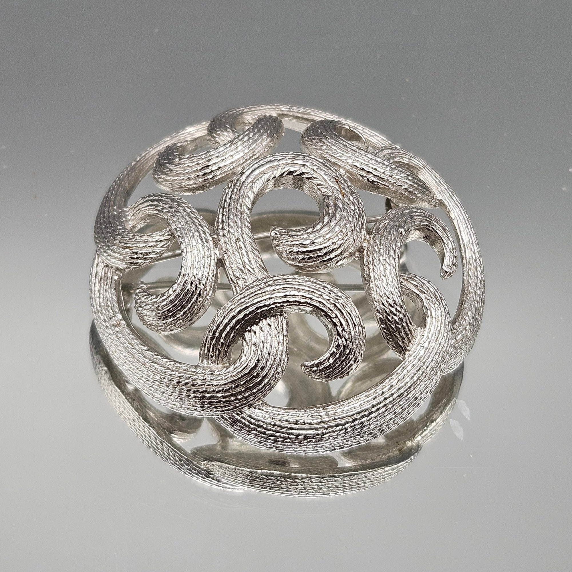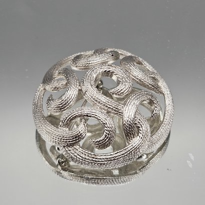 This mid-century inspired piece features a bold, lightweight spiral design with a finely textured silver-tone finish and delicate openwork.