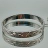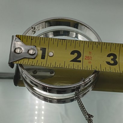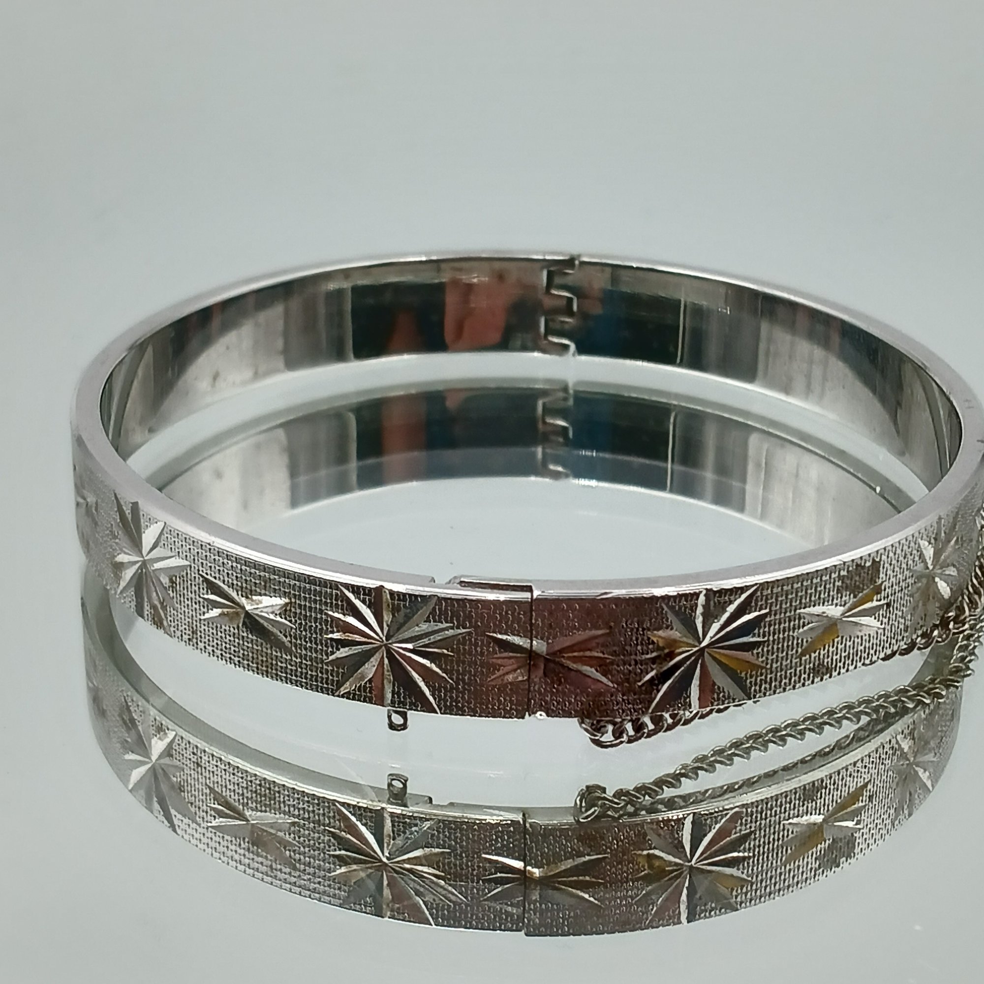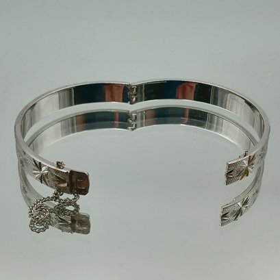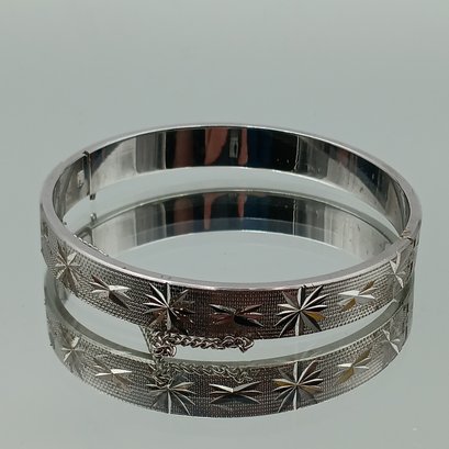 This mid-century style silver-tone bangle features a textured finish with etched starburst motifs, a secure hinged clasp with an attached safety chain, and measures approximately 2.25 inches in diameter.